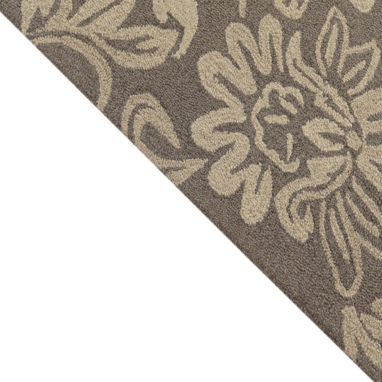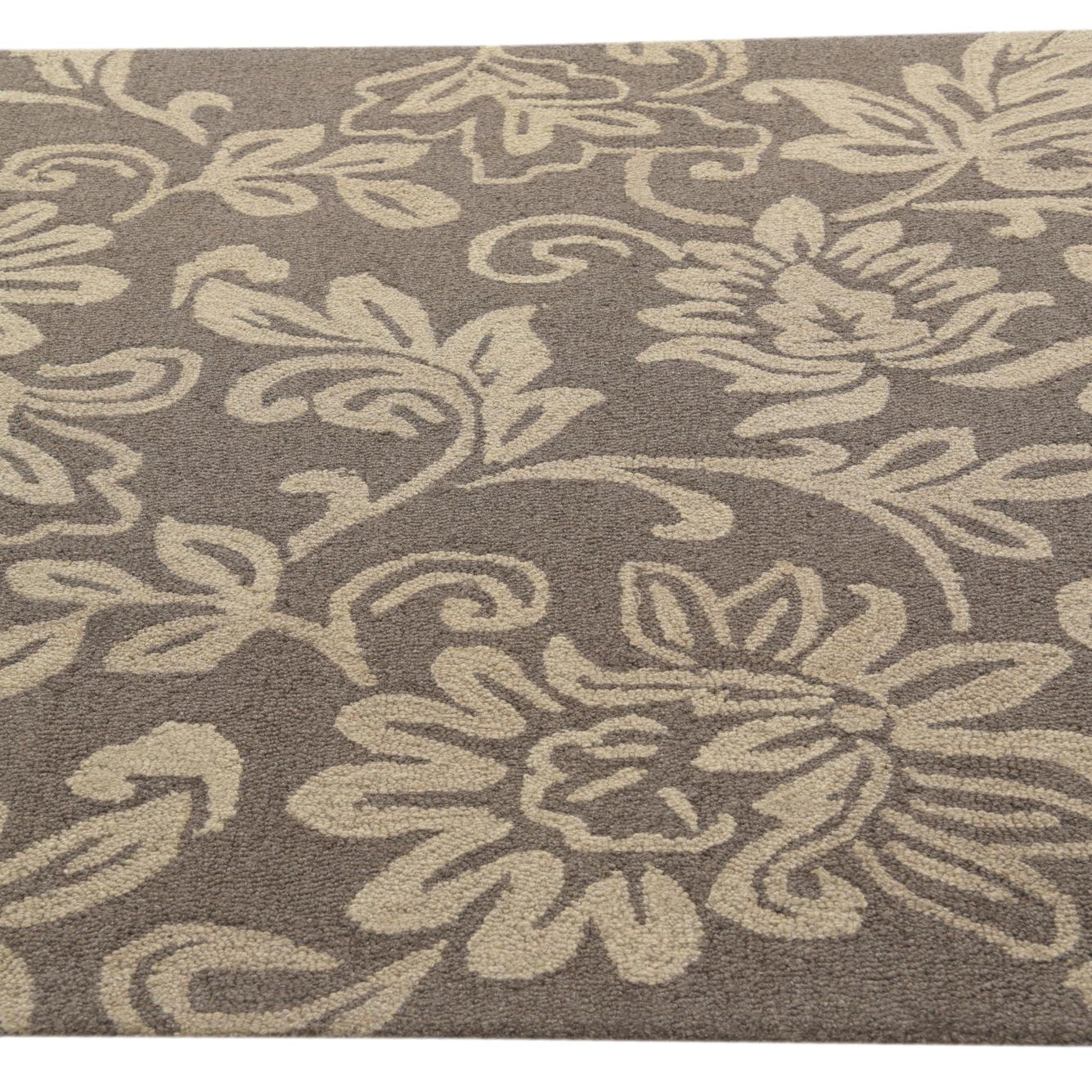 The Agra Collection presents a 5x8 hand-tufted rug crafted with a blend of wool and cotton, providing a plush, comfortable feel underfoot. This rug features an ornate floral pattern that adds a sense of elegance to any room. The gray background is complemented by ivory designs, creating a balanced and nuanced color palette. The texture of the rug reveals the meticulous craftsmanship and the high-quality materials used.