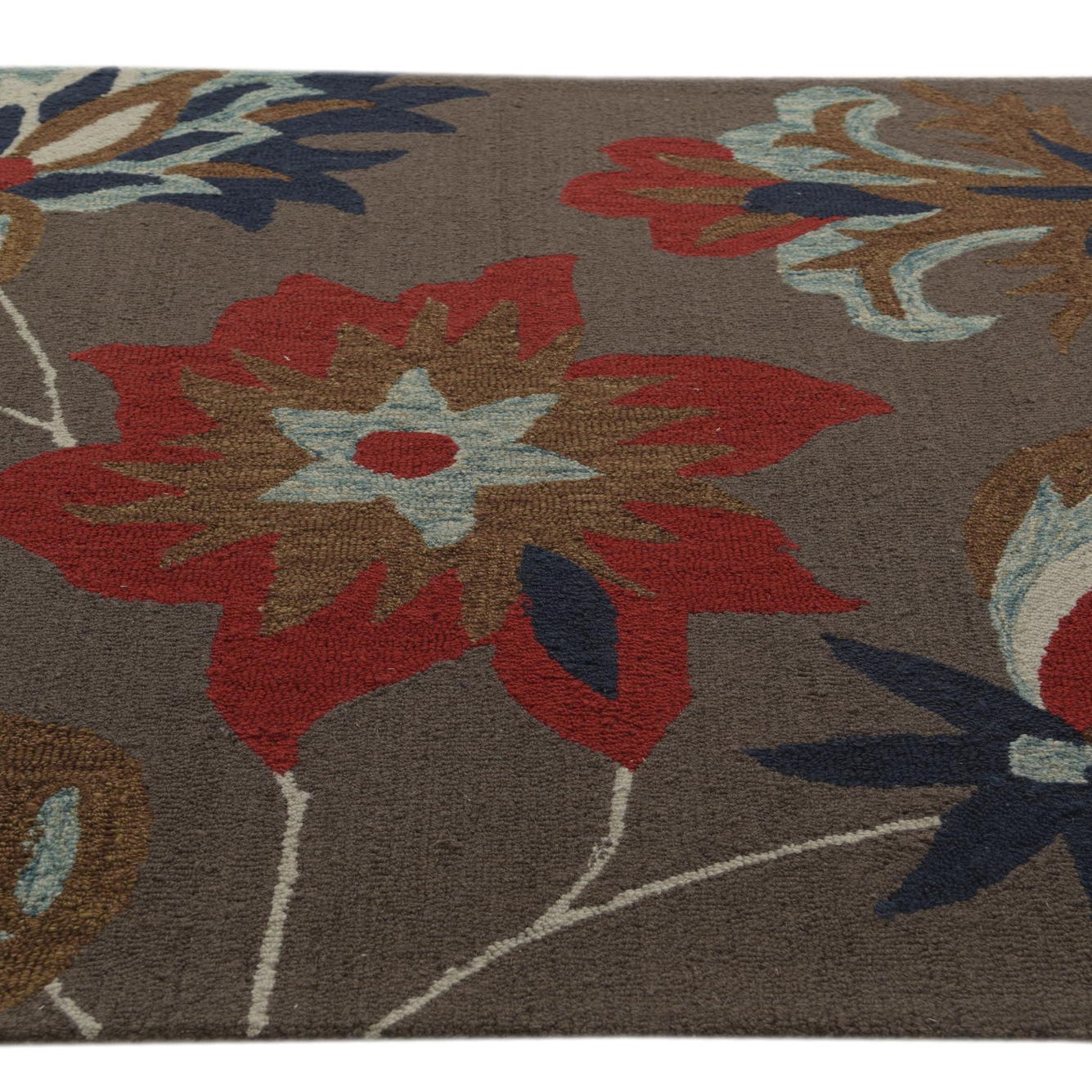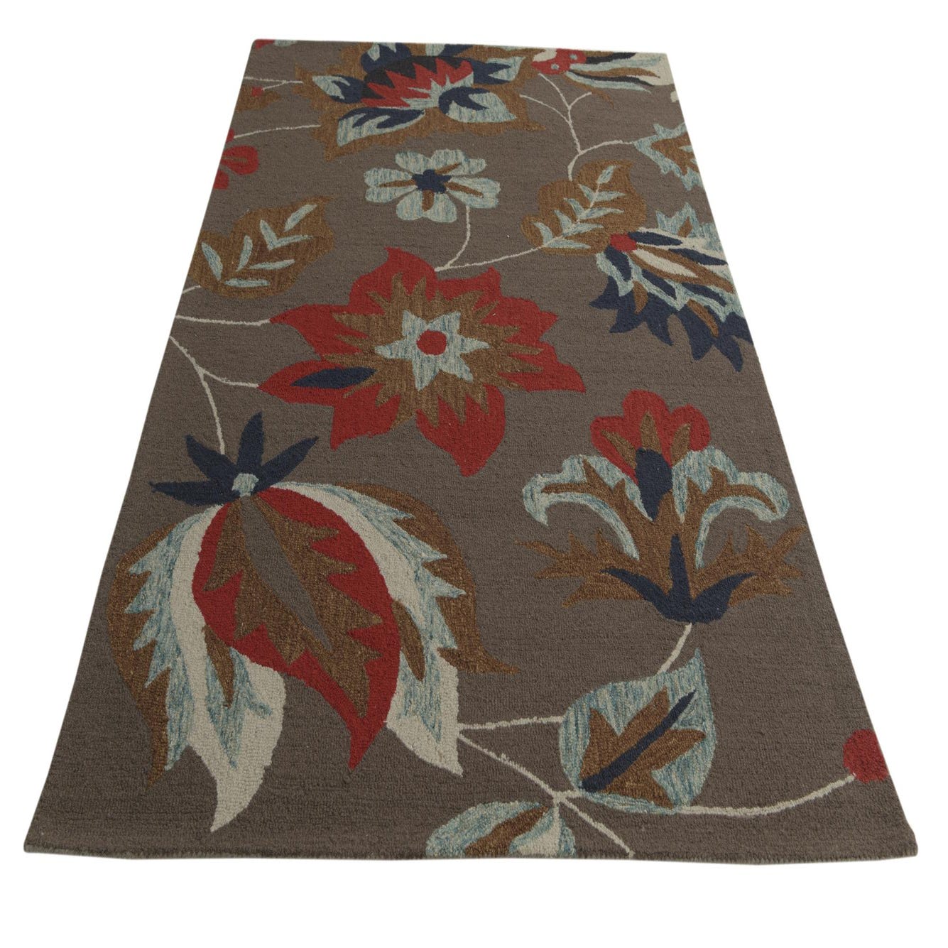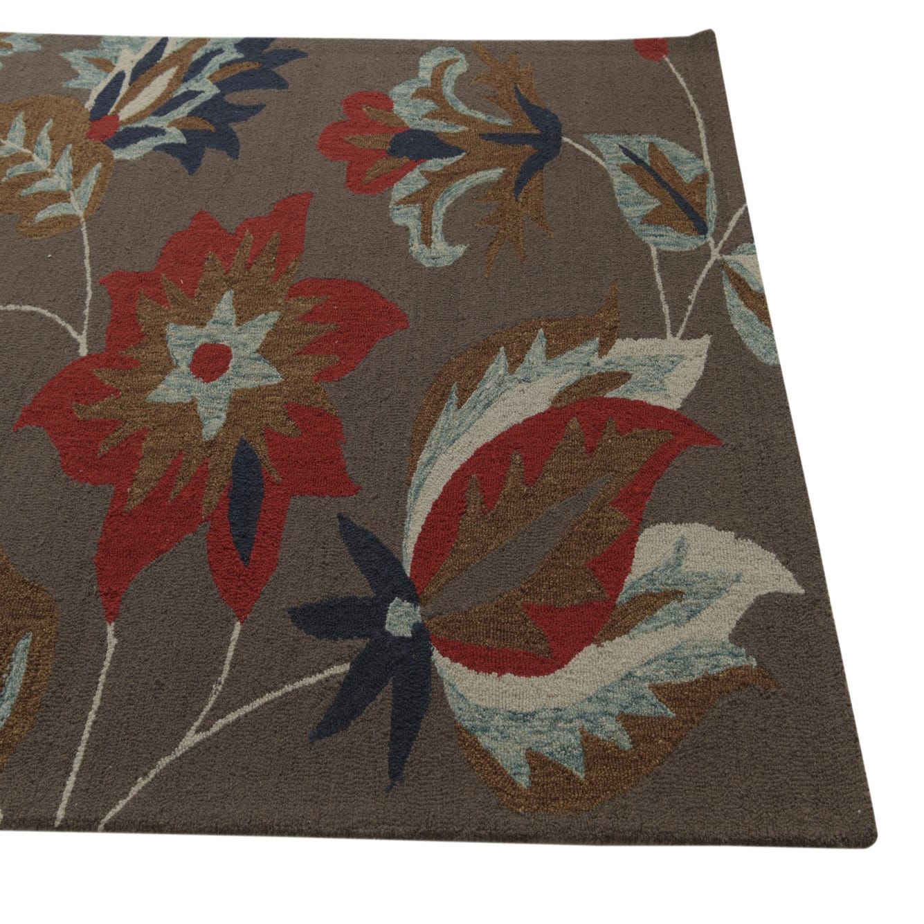 A 5x8 rectangular wool rug featuring a bold floral pattern with red, blue, and brown flowers on a gray background.