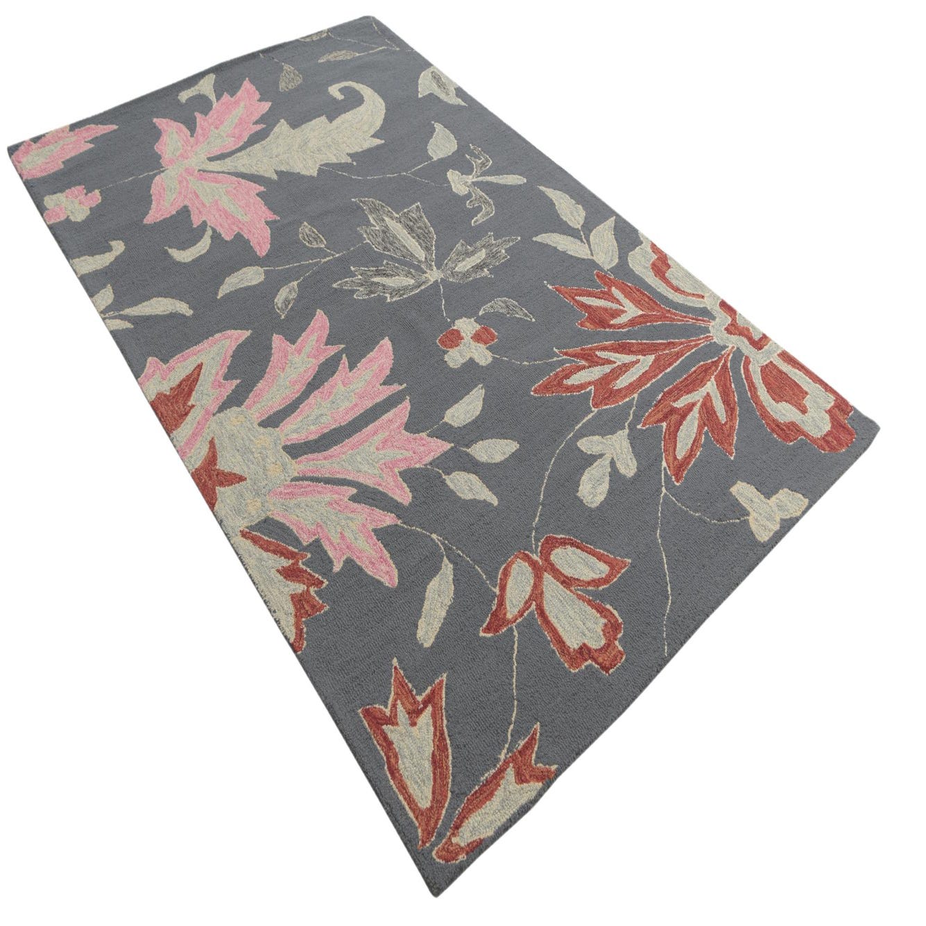 A rectangular 5x8 gray wool rug with a modern floral pattern in shades of red, pink, and gray.