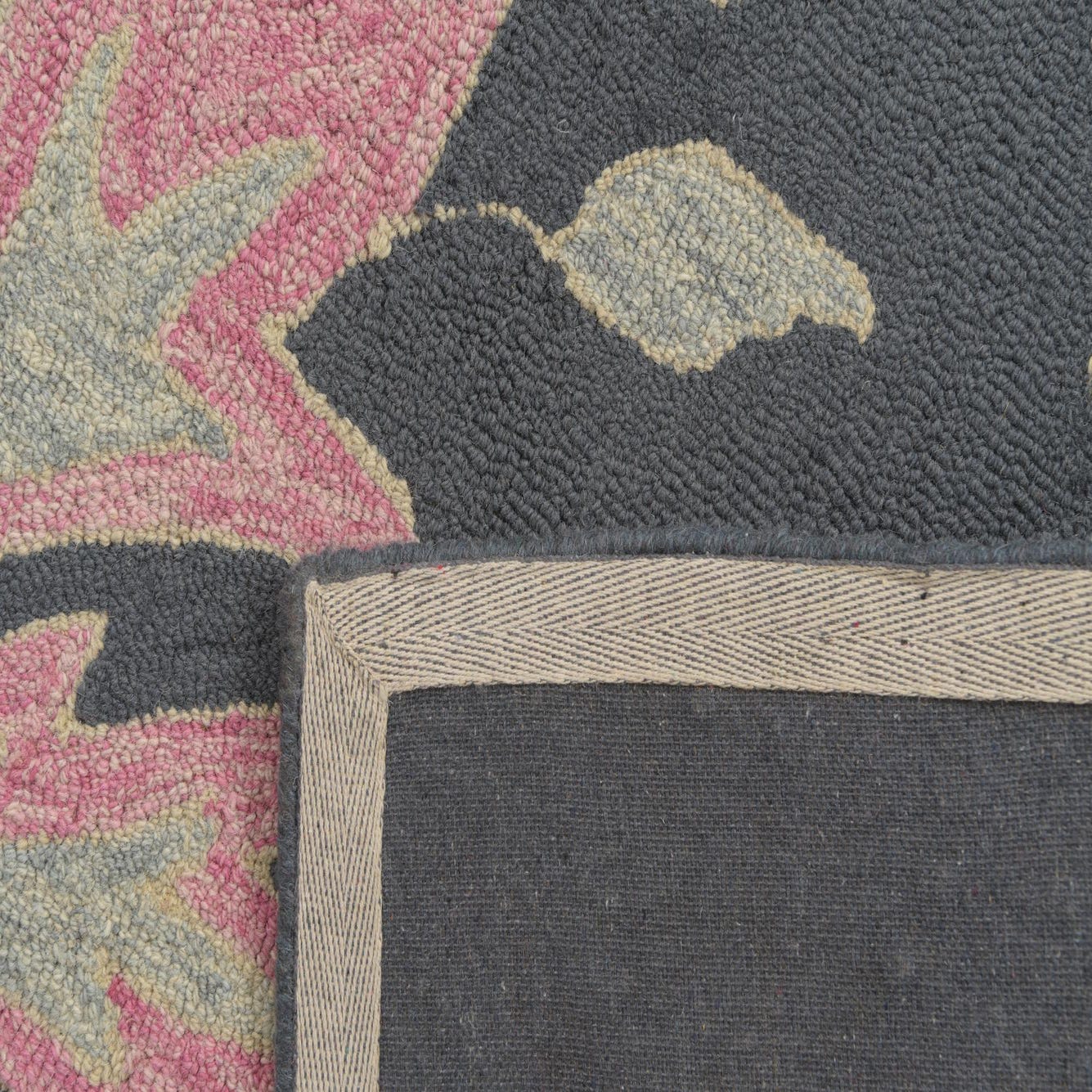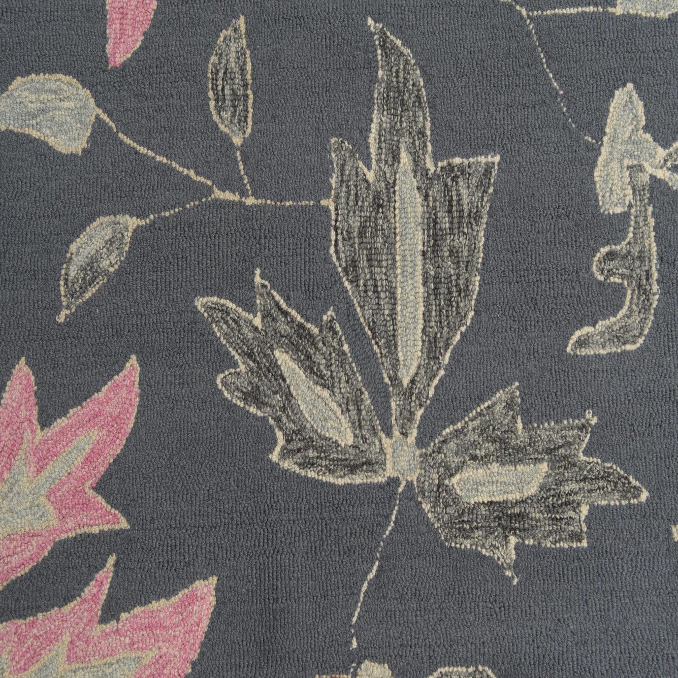 The Agra Collection presents a hand-tufted 5x8 rug crafted from 100% wool, offering both durability and a plush texture. This rug features a gray background with a botanical pattern incorporating colors such as black, ivory, light green, pink, and rust red. The elegant floral design is outlined with delicate strokes that enhance its visual depth and complexity.