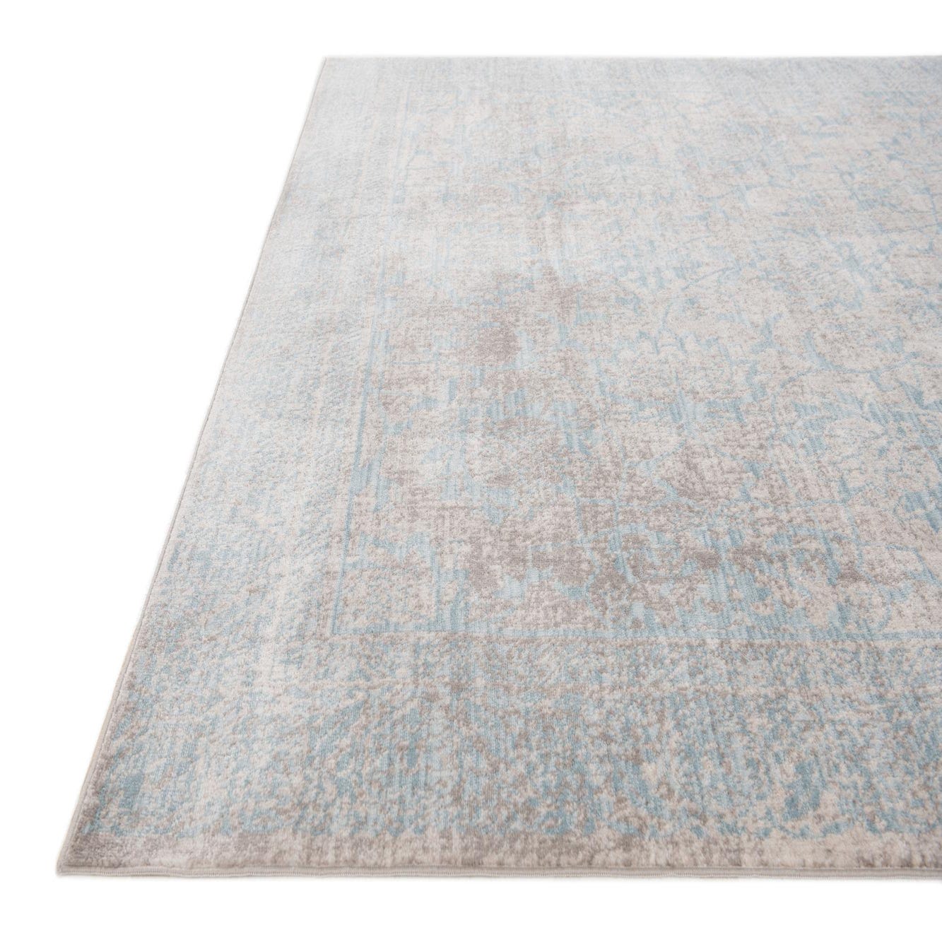 Primary color is Gray. Colors in this rug include: Gray, Blue, Ivory.