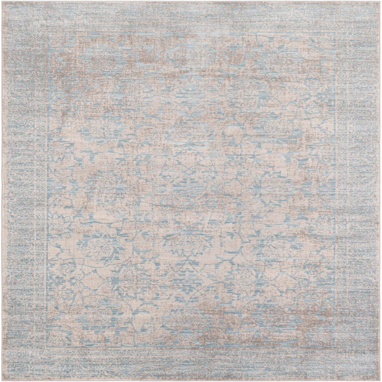 A 5x8 rectangular indoor rug featuring a distressed modern floral pattern in shades of gray and light blue.