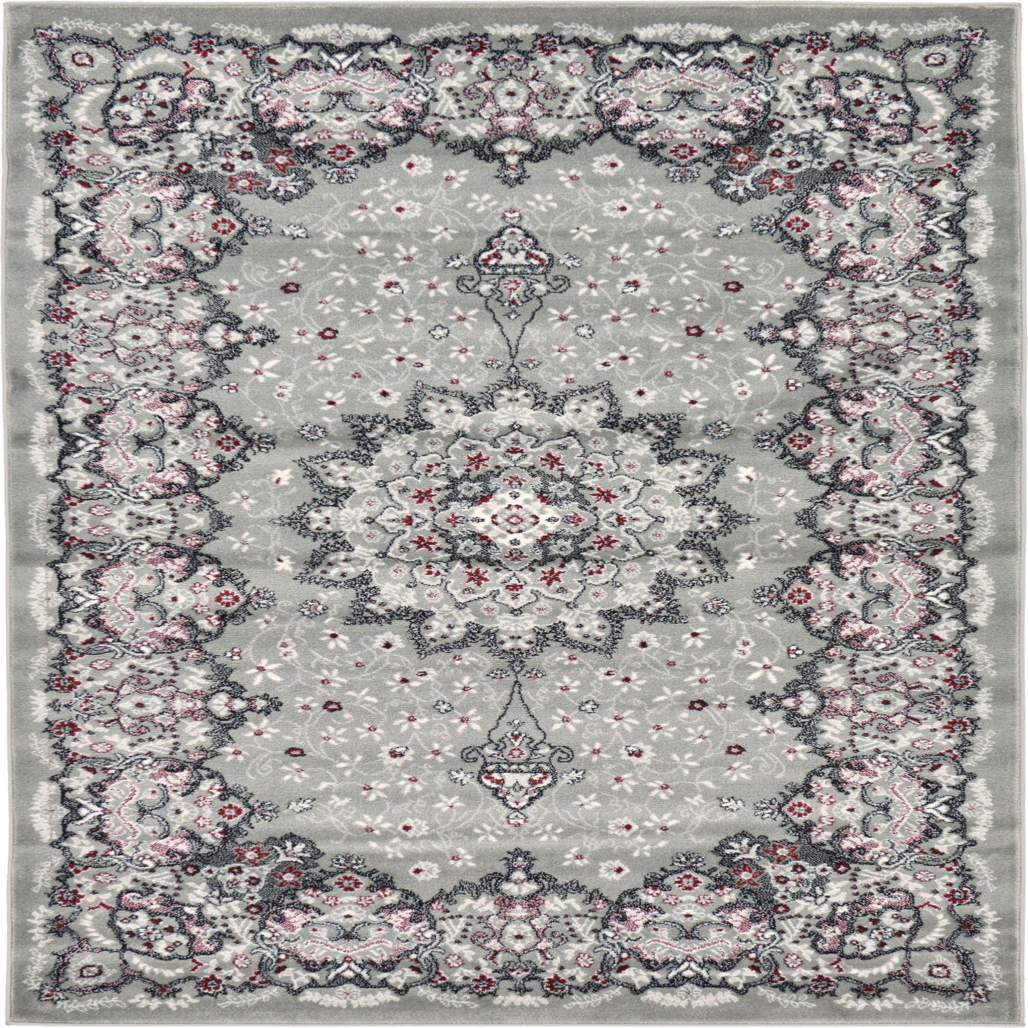Primary color is Gray. Colors in this rug include: Gray, Black, Ivory, Purple.