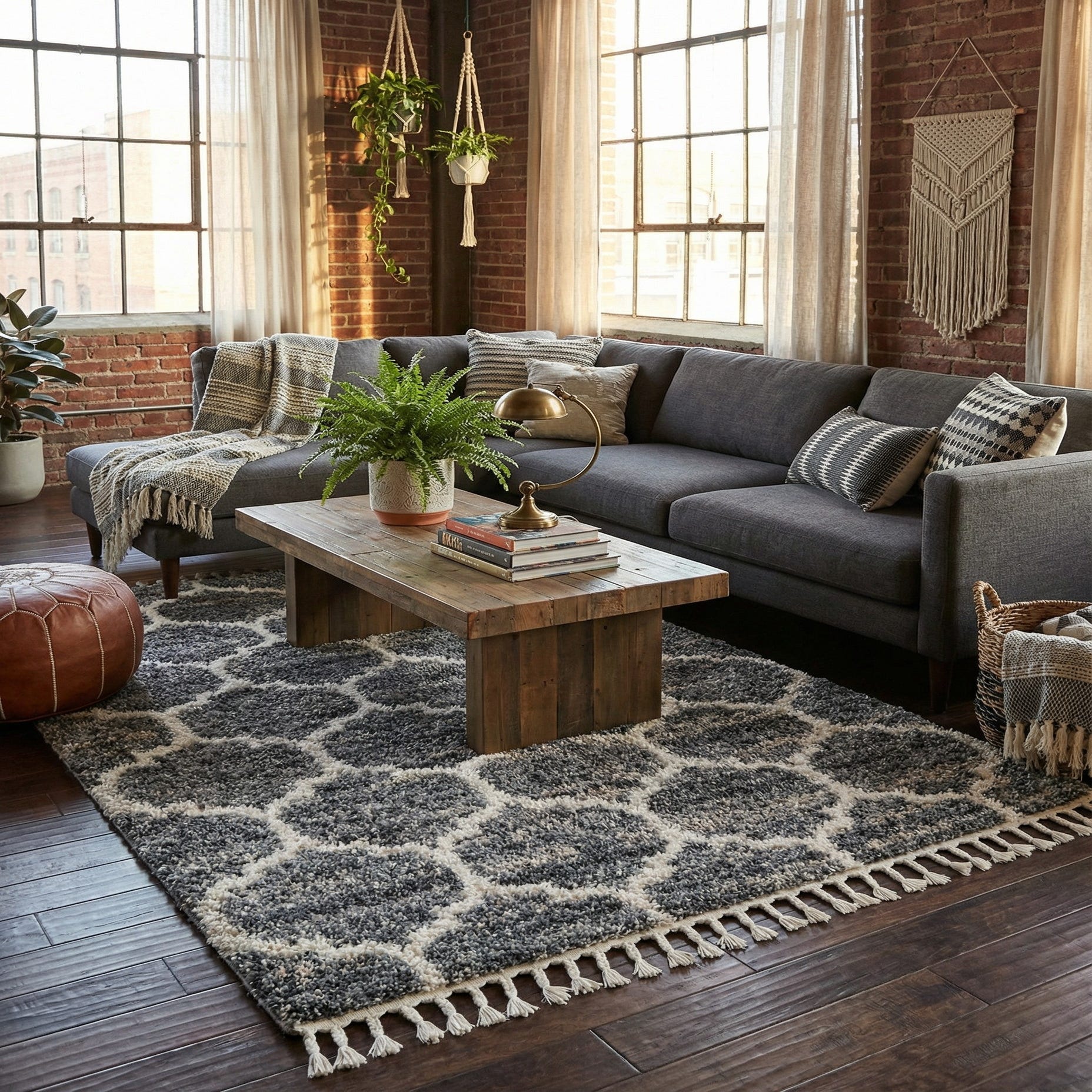 This piece works well as an anchor for a seating area, layered under a coffee table, or placed beside a bed for a soft step in the morning. It pairs naturally with neutral and warm palettes — think linen upholstery, weathered wood, or brushed metal accents — and suits transitional, contemporary, or modern farmhouse interiors that benefit from both texture and an organized pattern.