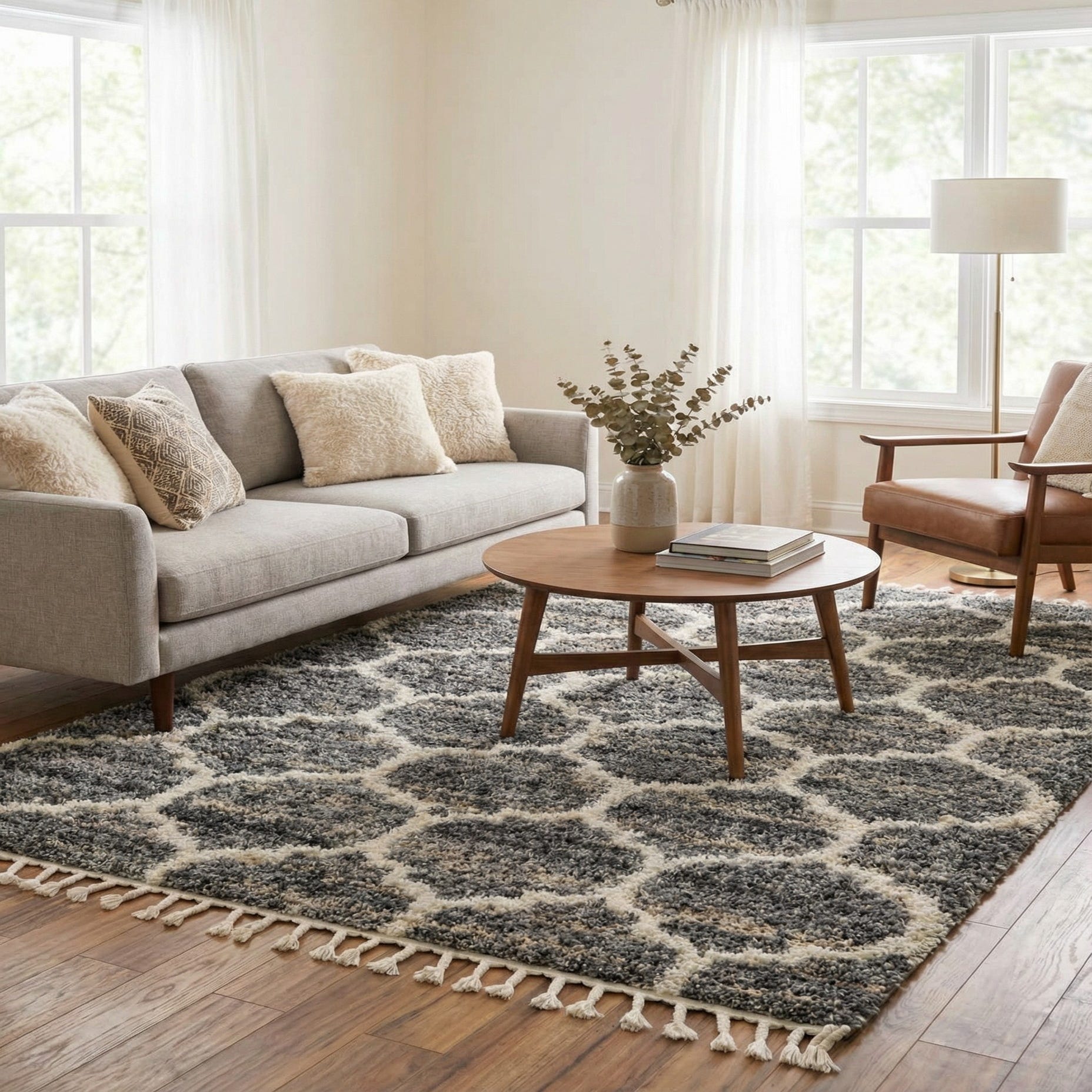 A low-key Moroccan trellis pattern in ivory sits against a gray background, with soft beige striations running through the pile to add subtle depth and warmth. The shag pile is dense and tactile, and the slightly raised ivory motif creates a gentle contrast you can feel underfoot. Machine-made of 100% polypropylene, the construction gives the rug a consistent, even surface and a relaxed fringe at the ends that adds a casual, lived-in touch.