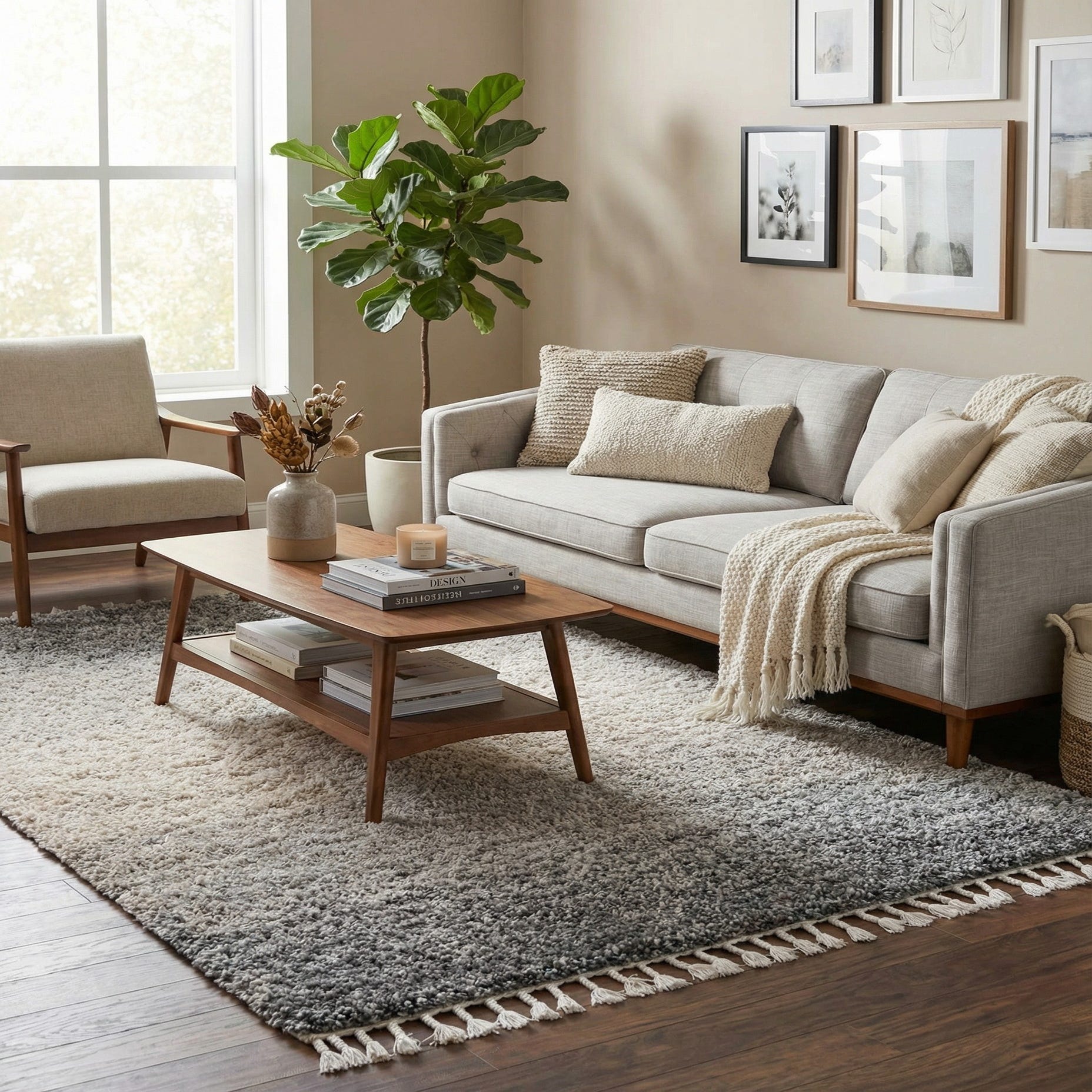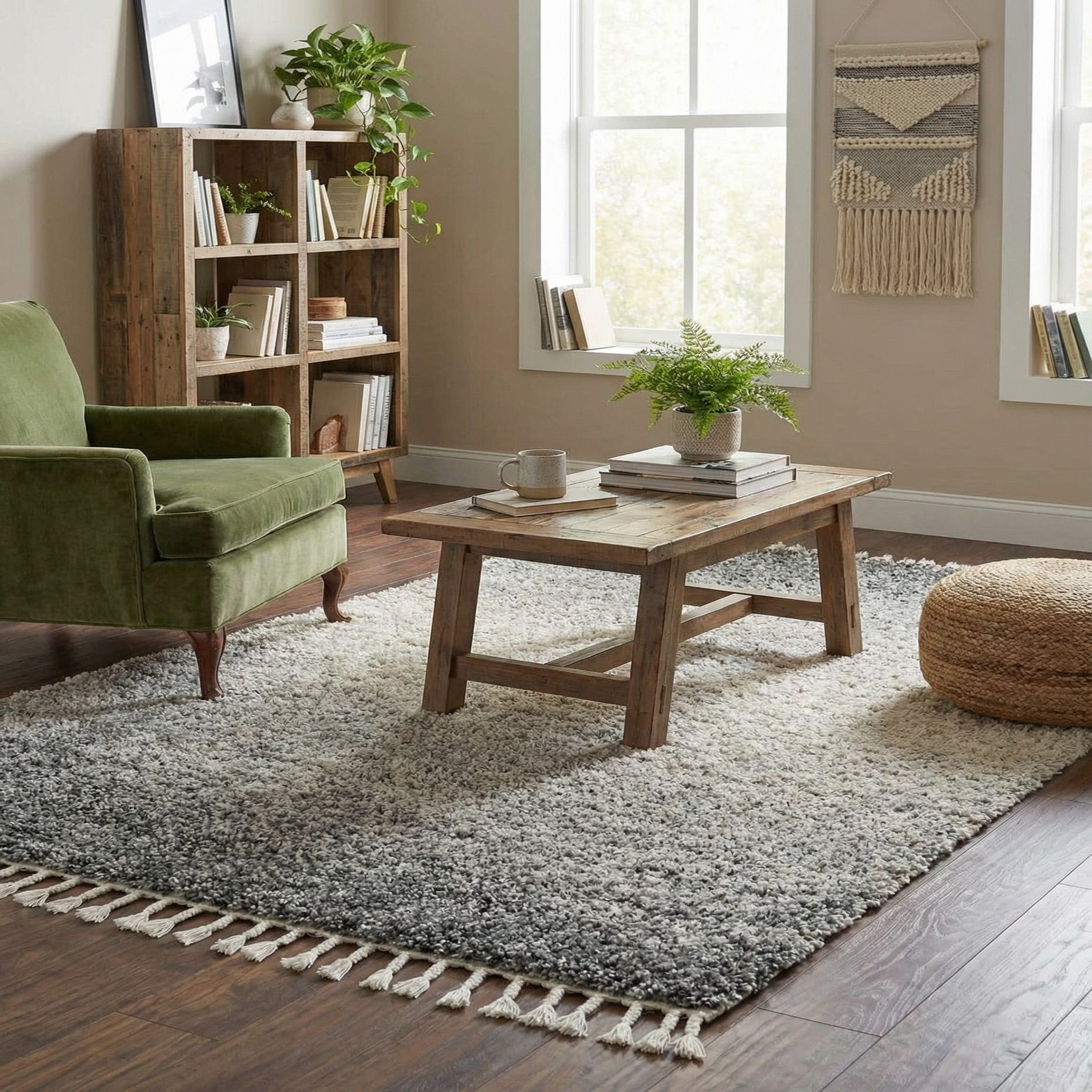 A soft ombre pattern moves across a gray ground into warm ivory and beige tones, creating a calm, layered look without any sharp contrast. The shag construction has a deep, plush pile you can feel underfoot; machine made of 100% polypropylene, it offers a dense, tactile surface with a gently tousled finish. Both ends are finished with short ivory tassel fringe that adds a relaxed, handcrafted touch to the overall design.