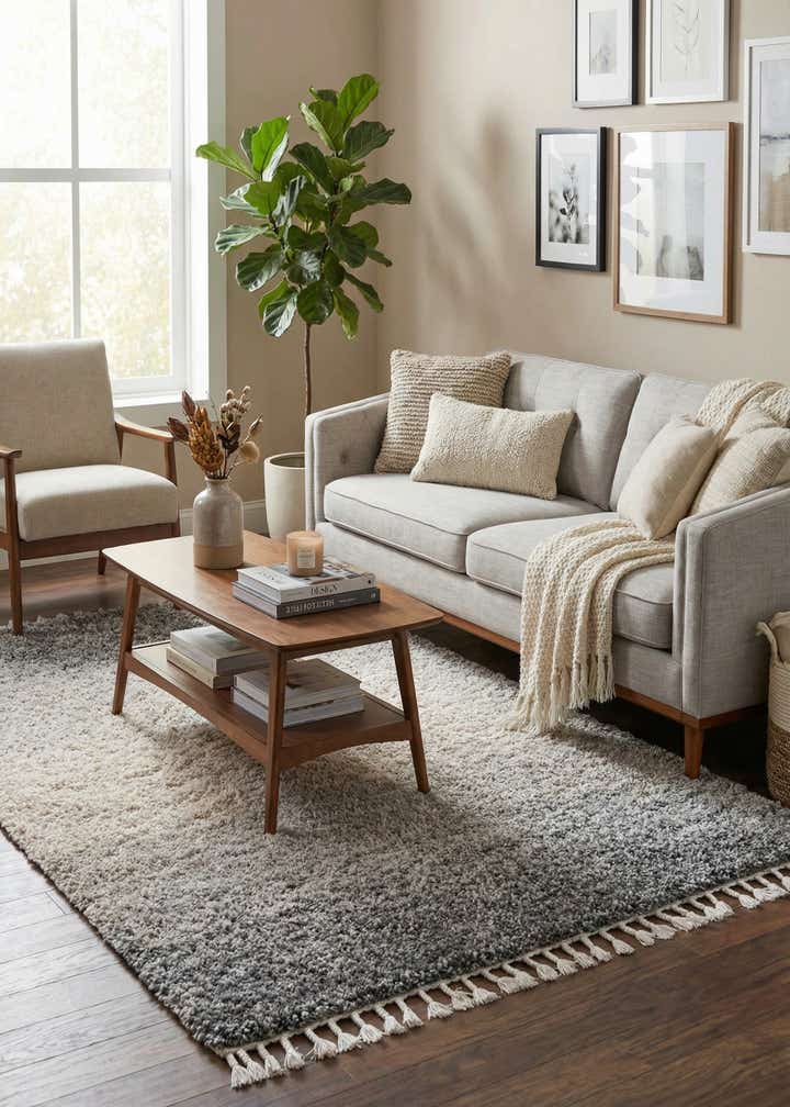 This rug works well in relaxed living rooms placed beneath a low coffee table, in bedrooms layered at the foot of the bed, or in a reading nook where a soft surface enhances comfort. Its neutral gray, beige, and ivory palette pairs easily with light wood furnishings, modern metal accents, and linen upholstery, fitting contemporary, Scandinavian, or transitional interiors that favor subtle texture and quiet color.