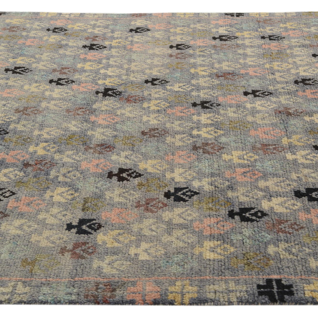 A 5x8 rectangular gray wool rug with a repeating tribal pattern in various pastel colors and black, suitable for a living room.