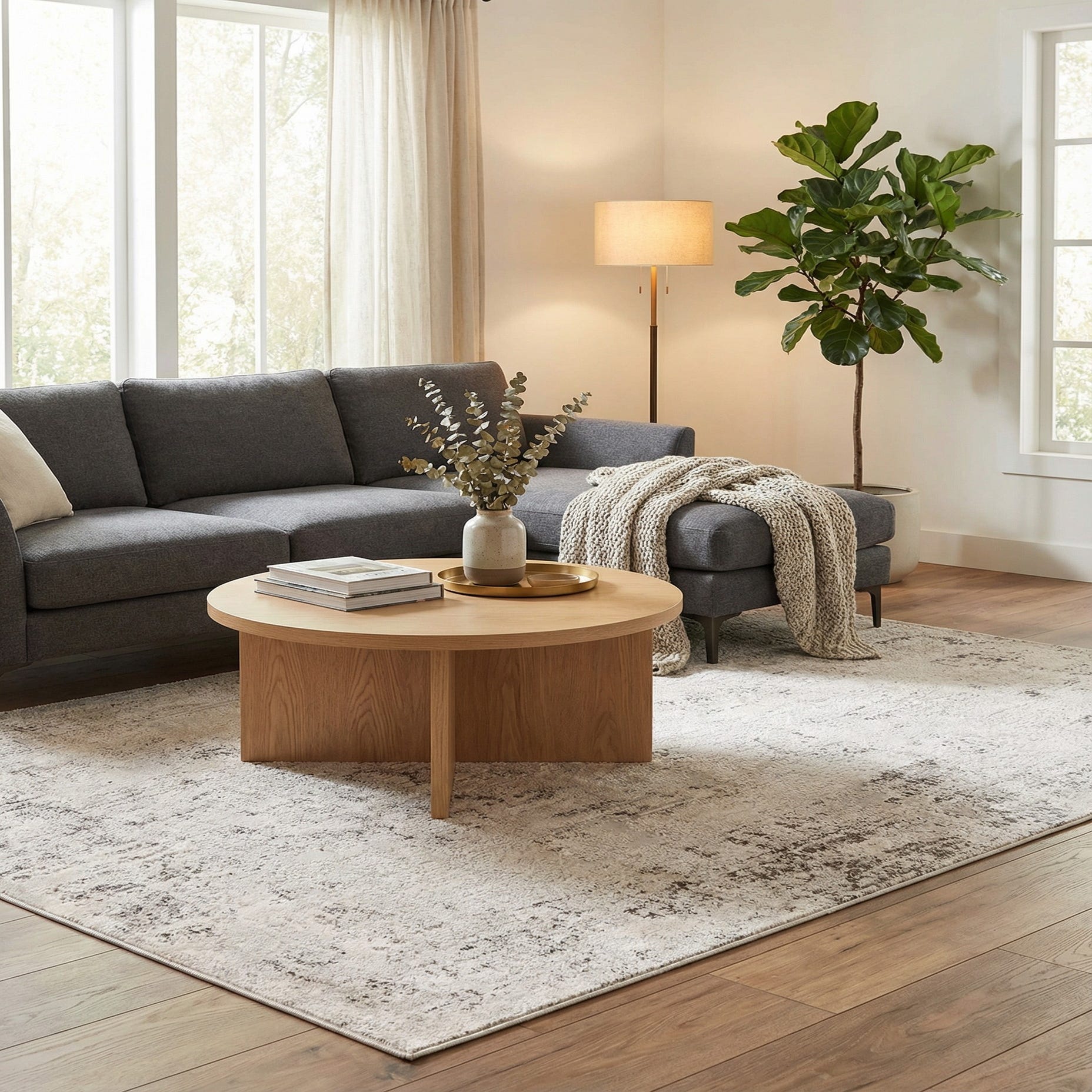 This neutral palette works well under a mid-century sofa and coffee table to brighten a living room, or layered at the foot of a bed to add quiet texture to a calming bedroom scheme. Pair it with cool-toned linens, matte metals, and light wood finishes for a cohesive, relaxed space, or use it as a subtle backdrop in a home office to keep the focus on furnishings and decor.