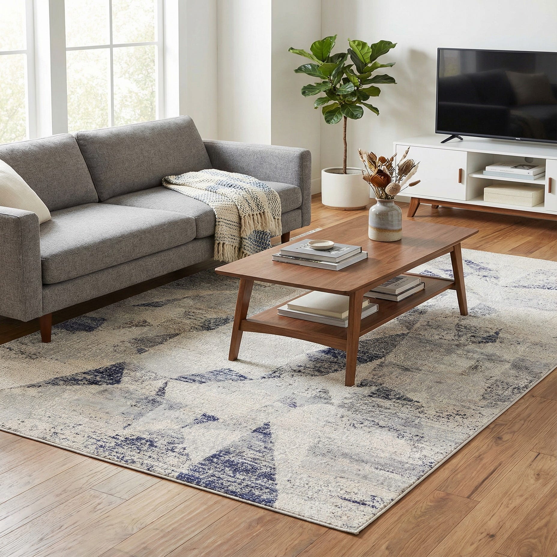 Machine-made from a 60% polypropylene / 40% polyester blend, the rug has a low-profile surface that feels smooth underfoot and lays flat in high-traffic areas. Its neutral palette and modern geometry pair well with cool-toned upholstery, navy or slate accents, and light wood or metal furnishings. Use it to ground a living area under a coffee table, layer it in a bedroom for a calm foundation, or place it in a home office to add subtle pattern without overwhelming the space.