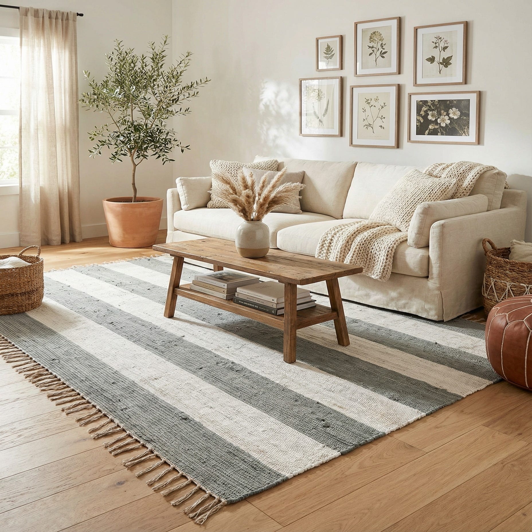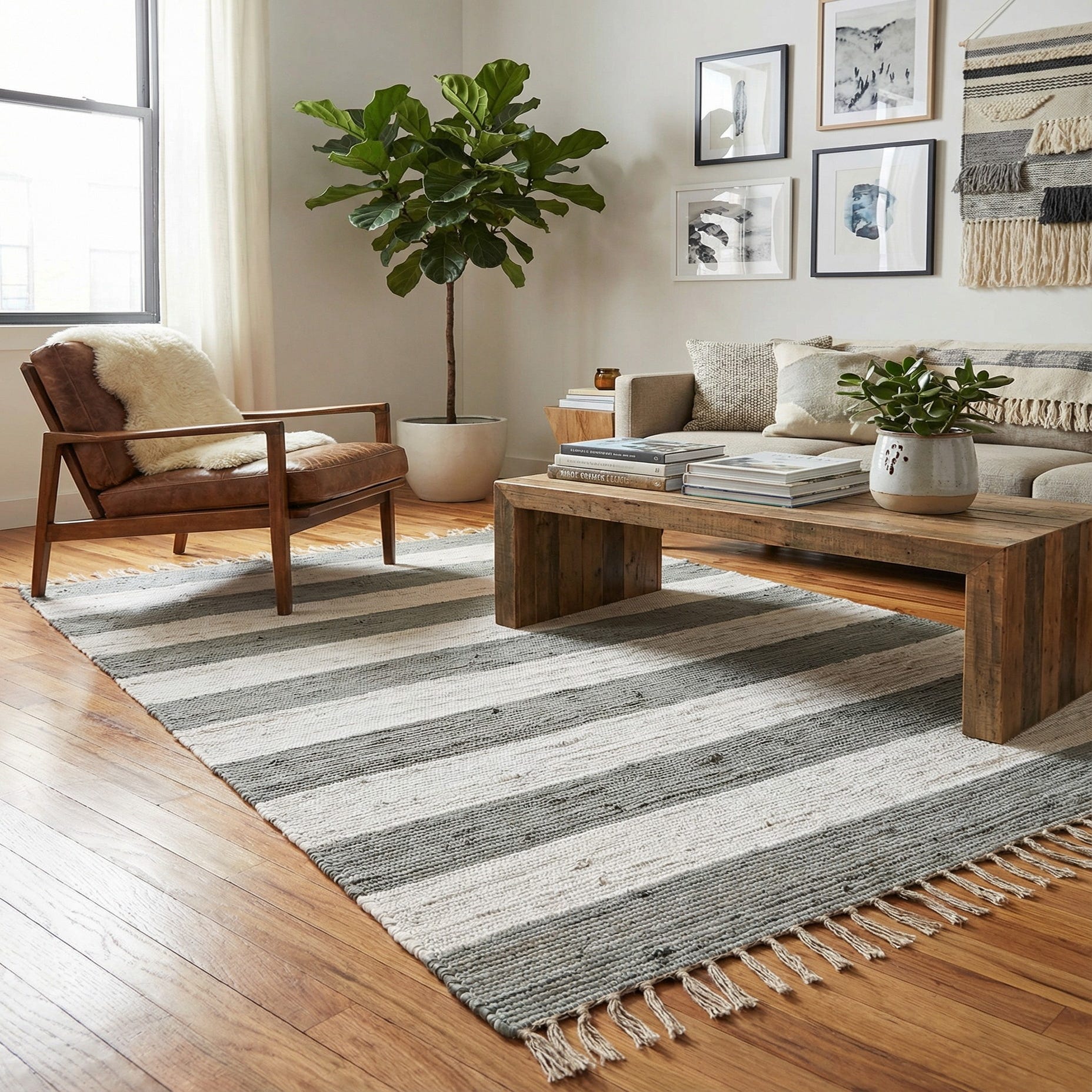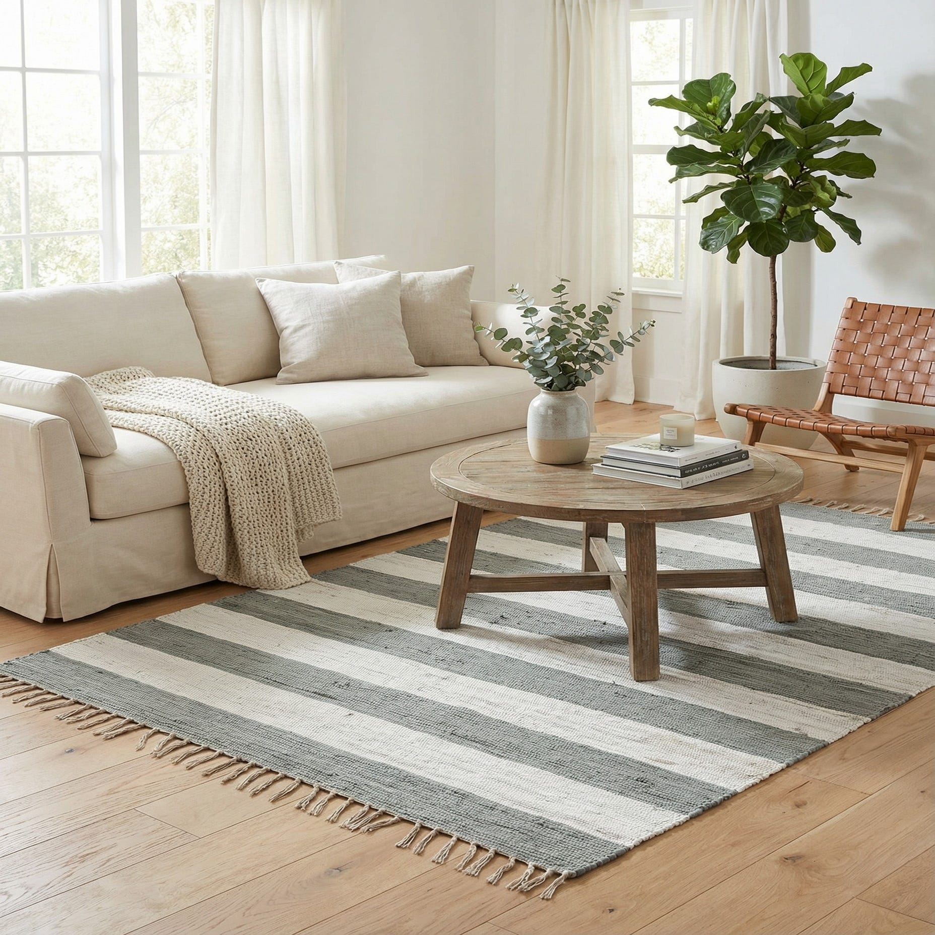 This striped, rag-style rug works well in relaxed interiors — pair it with light wood furniture and linen upholstery for a Scandinavian vibe, place it under a coffee table in a casual living room, or use it in an entryway or kitchen for a bit of horizontal grounding. It also complements farmhouse and coastal schemes when mixed with woven baskets, neutral ceramics, and soft textiles.
