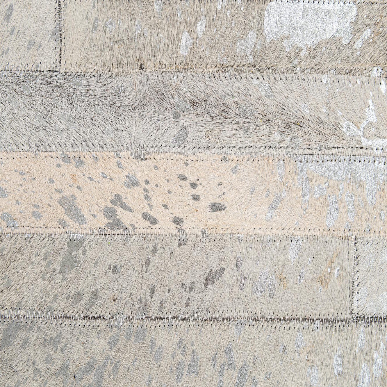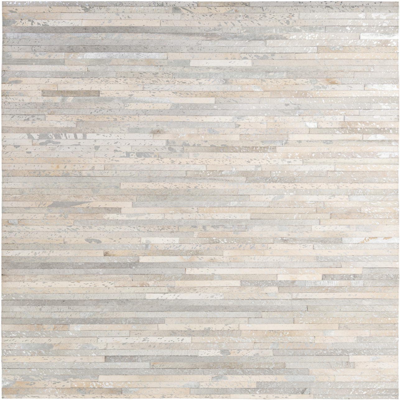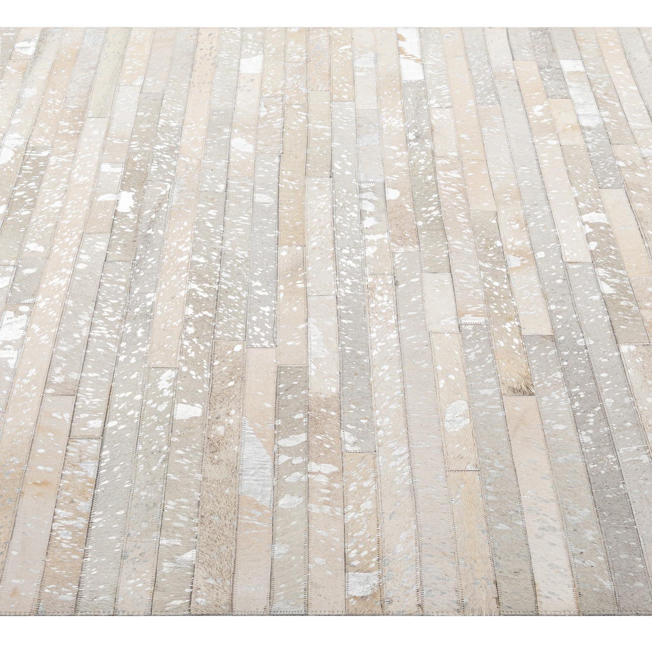 Hand made of cowhide and leather, this patchwork rug is built from narrow, horizontally arranged strips that form a clean, linear pattern. The gray background grounds a soft mix of ivory, silver and cream tones, while natural hair-on-hide markings and slight variations in finish give the surface quiet visual interest. The leather pieces have a low, tactile nap and a subtle satin sheen that creates gentle contrast between matte and reflective sections.