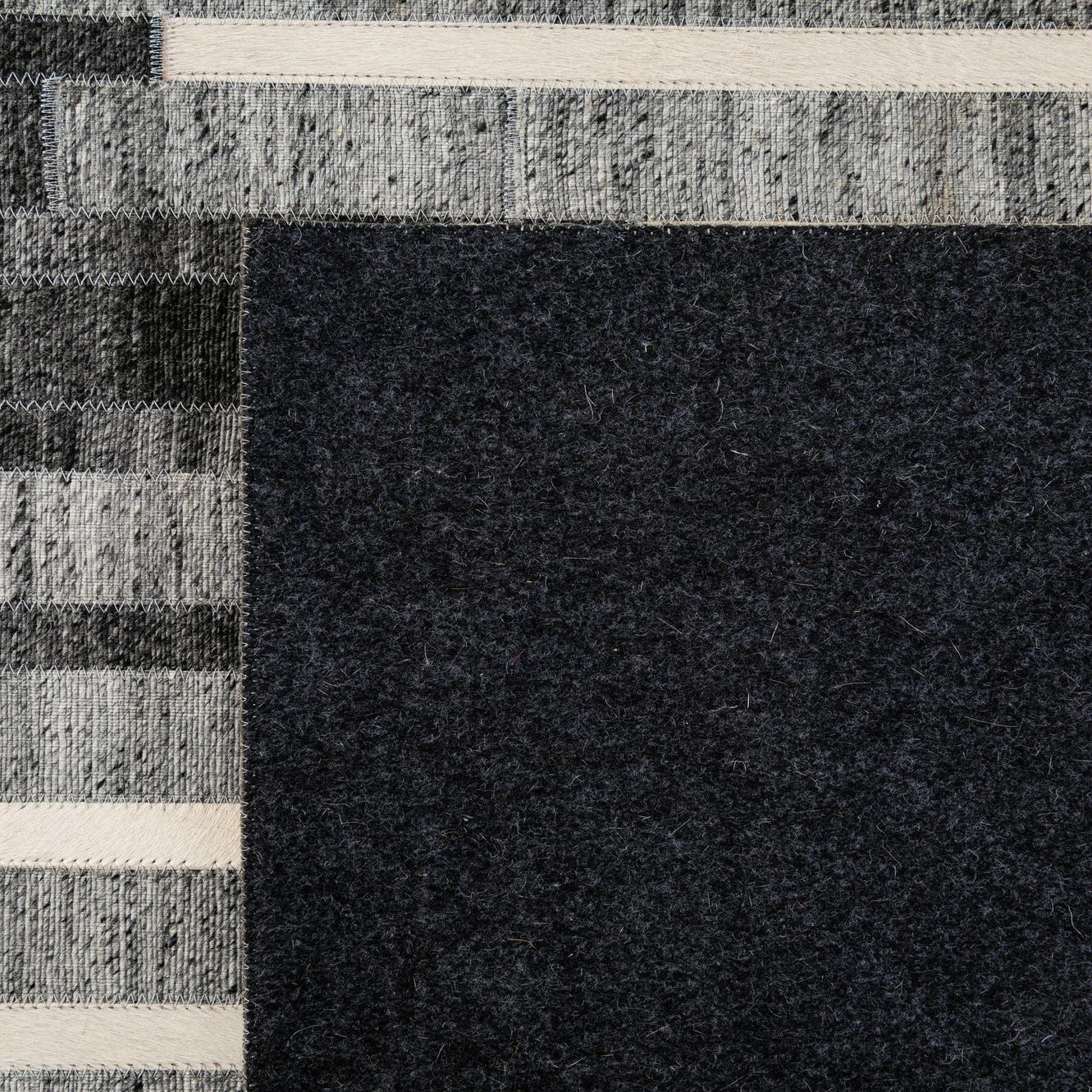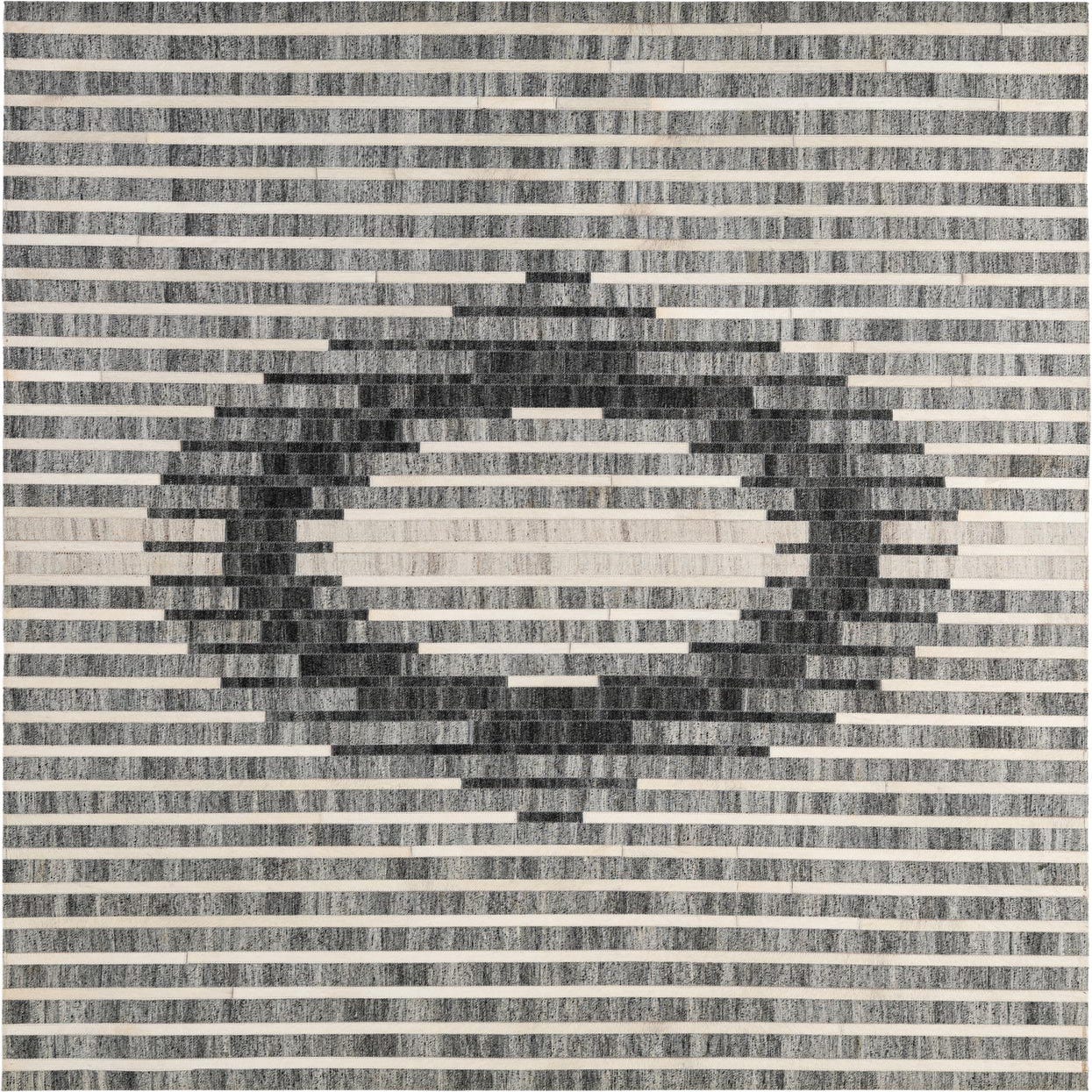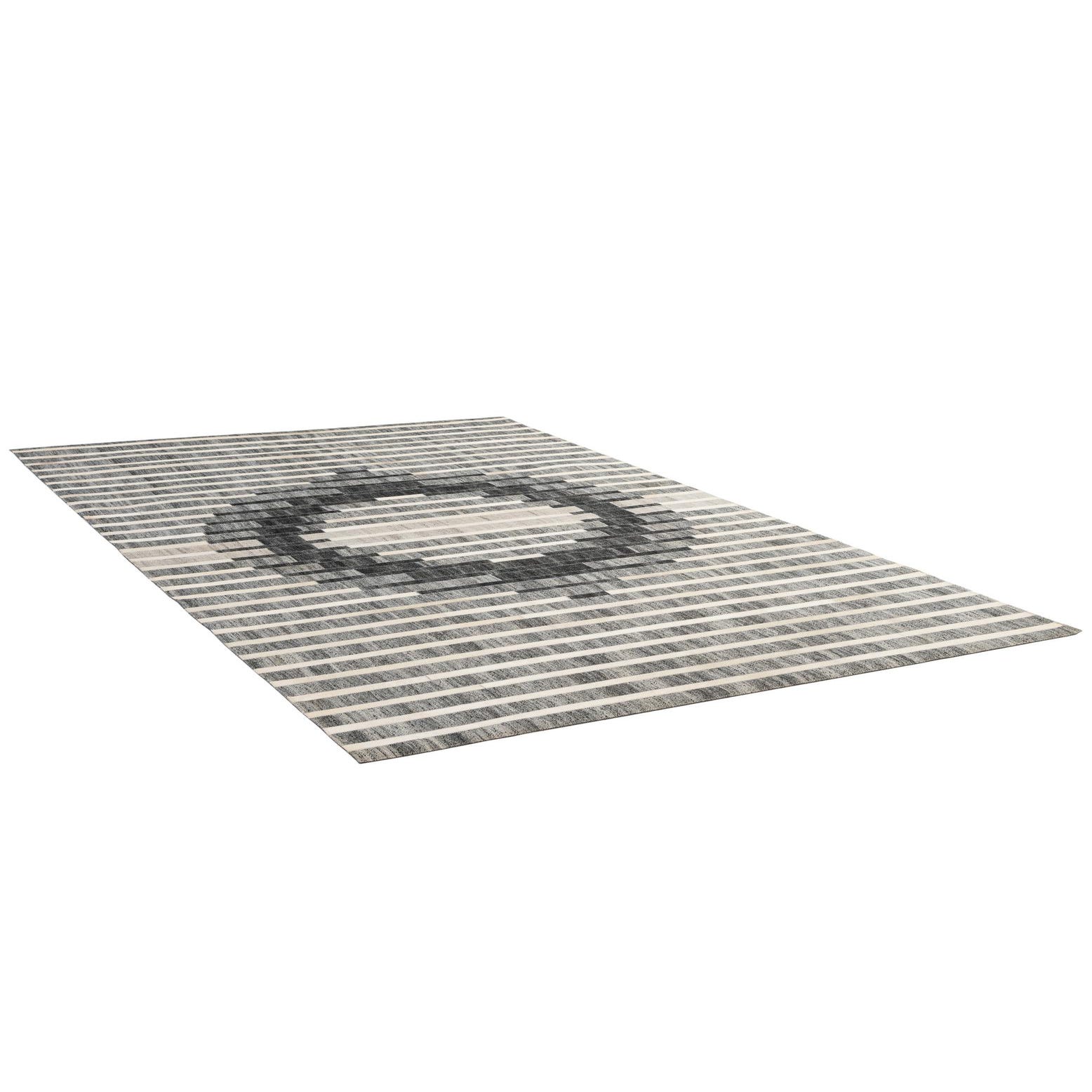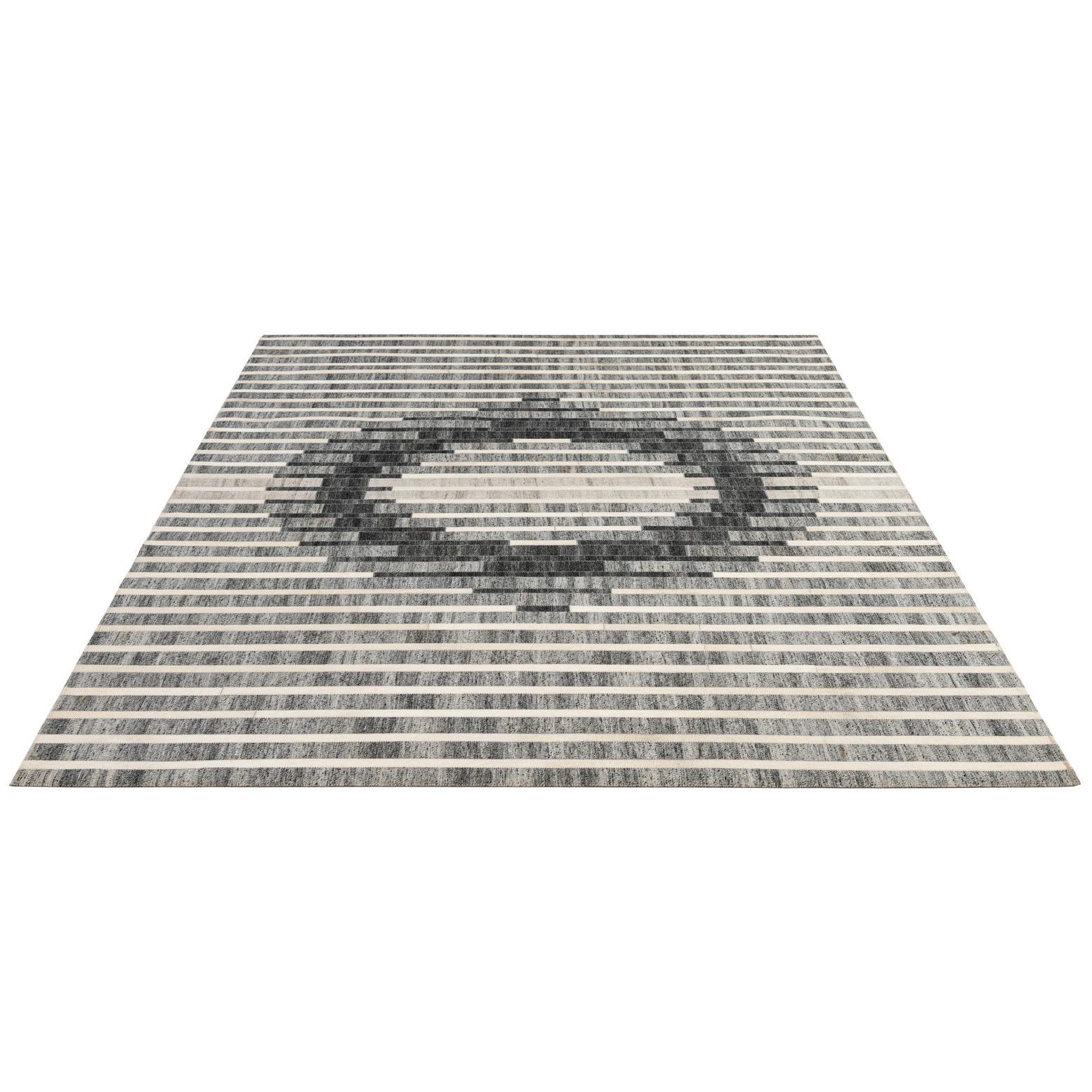A 5x8 rectangular Cowhide Patchwork rug in shades of gray and silver, featuring a modern striped pattern with a central circular design.