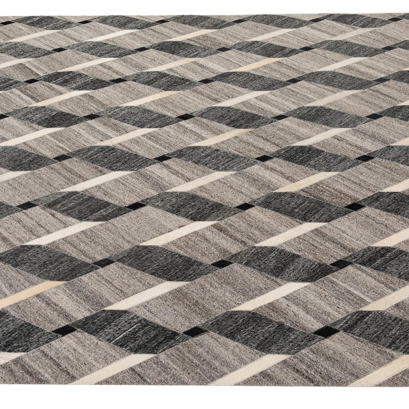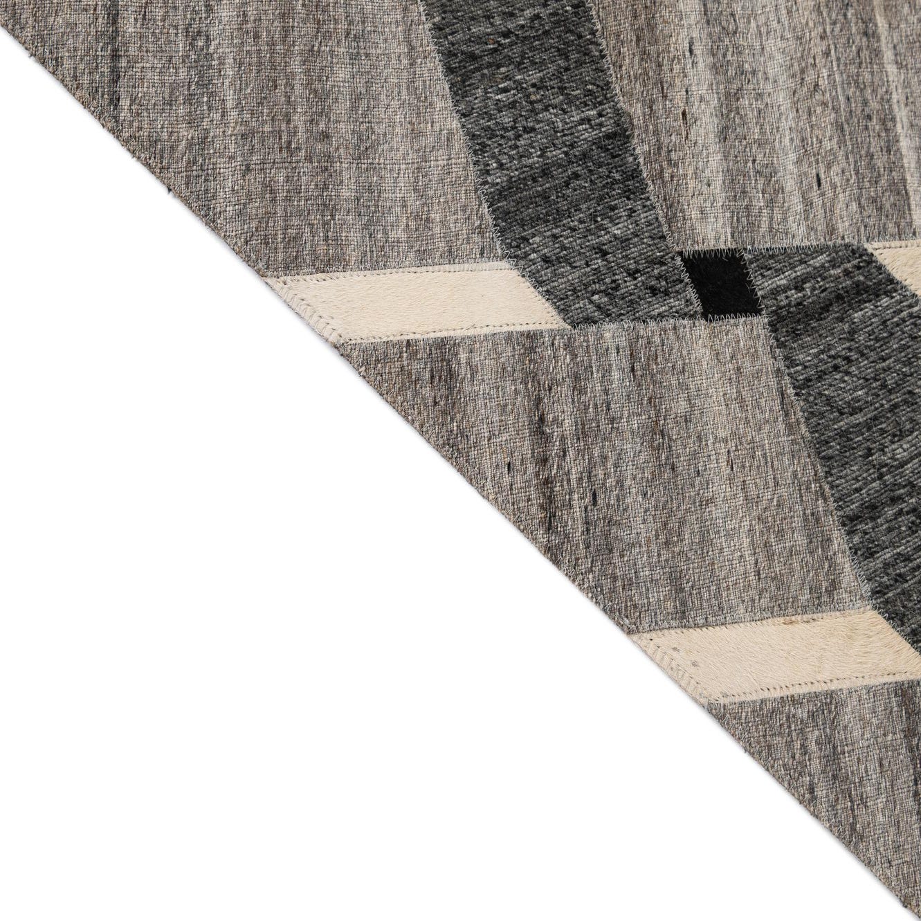 A 5x8 rectangular Cowhide Patchwork rug featuring a modern geometric pattern in varying shades of gray, silver, and black, with subtle light accents.