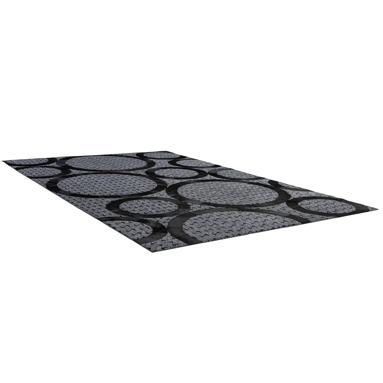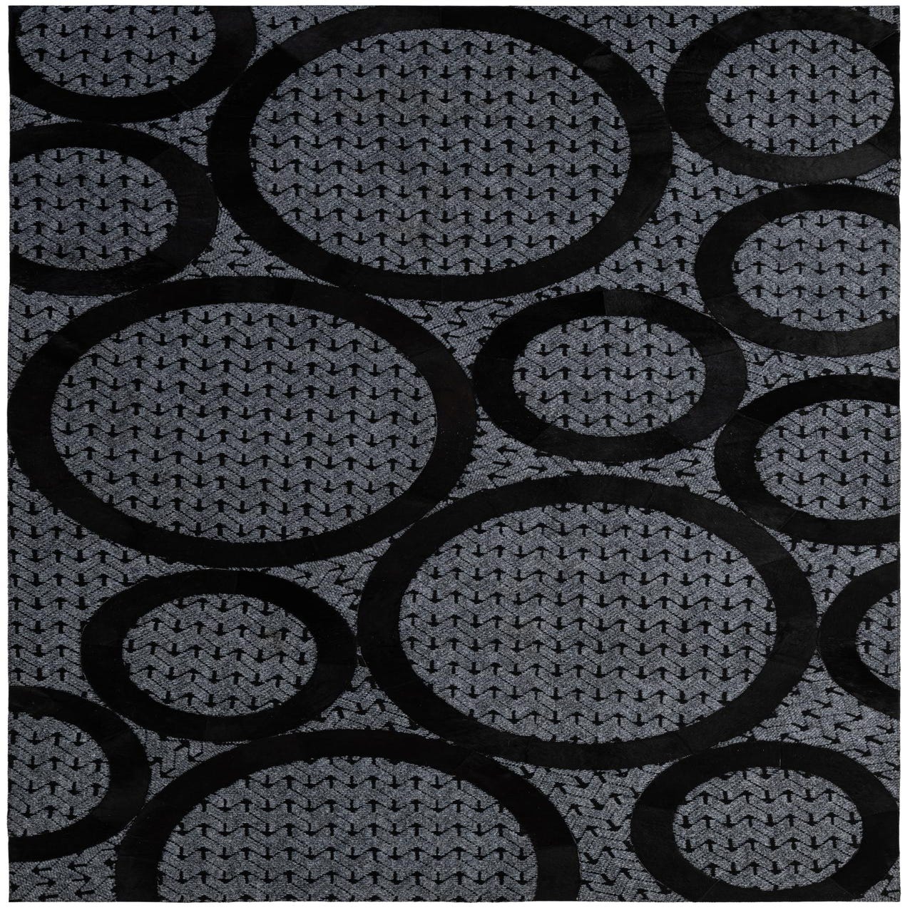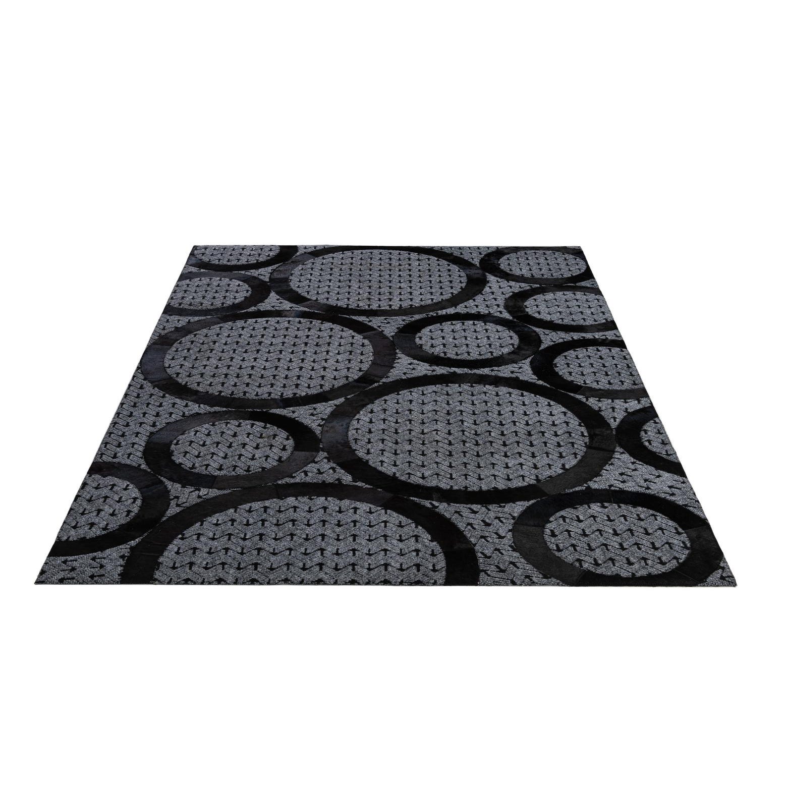 A 5x8 rectangular gray cowhide rug with large, overlapping black abstract circles and a subtle arrow pattern.