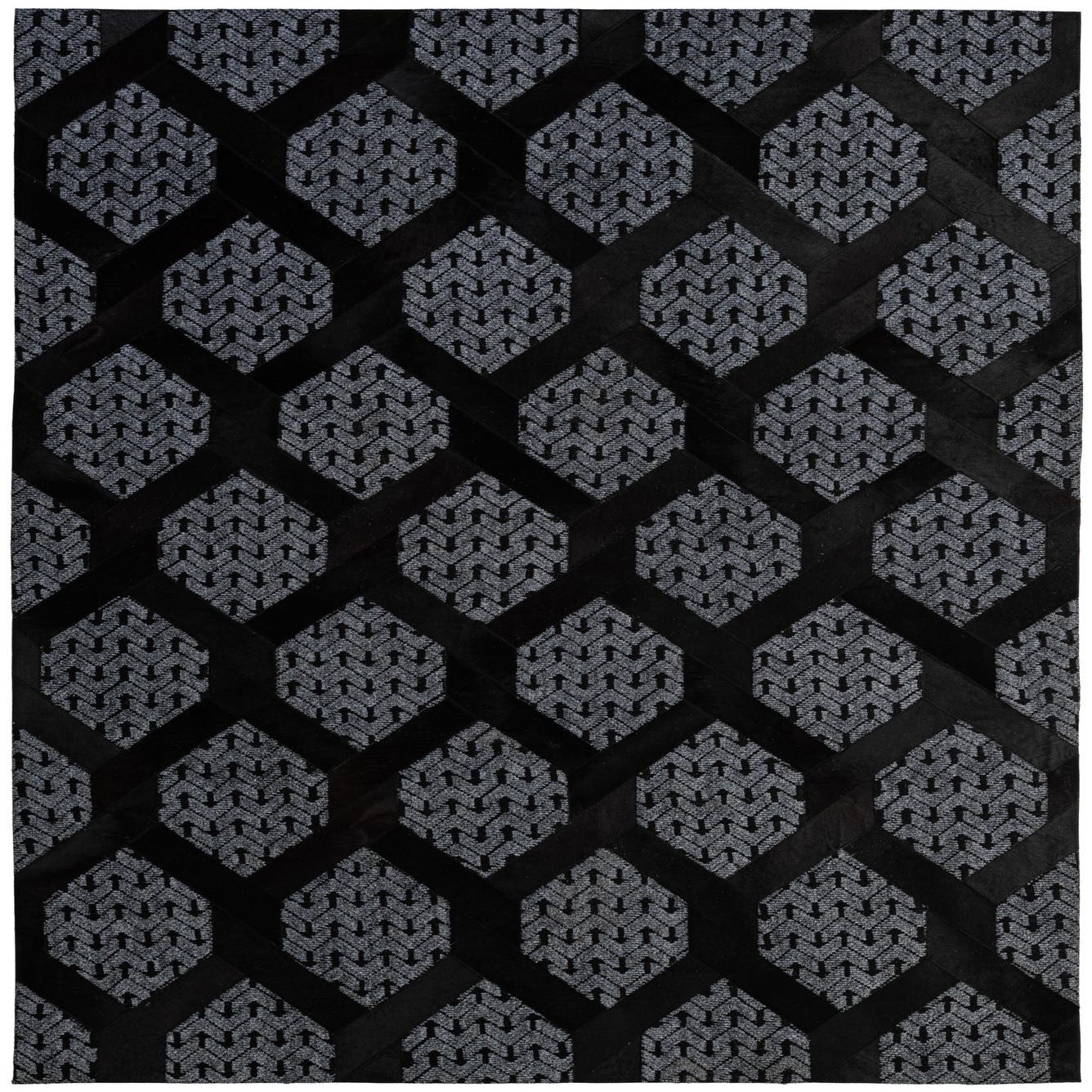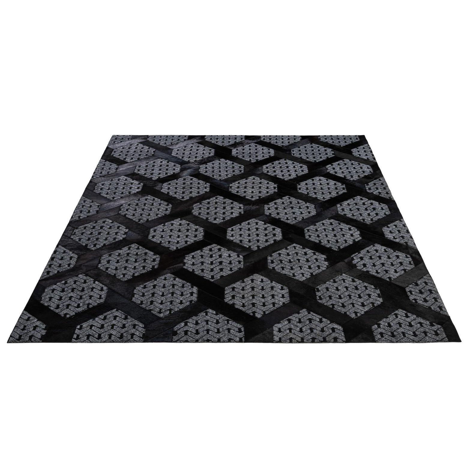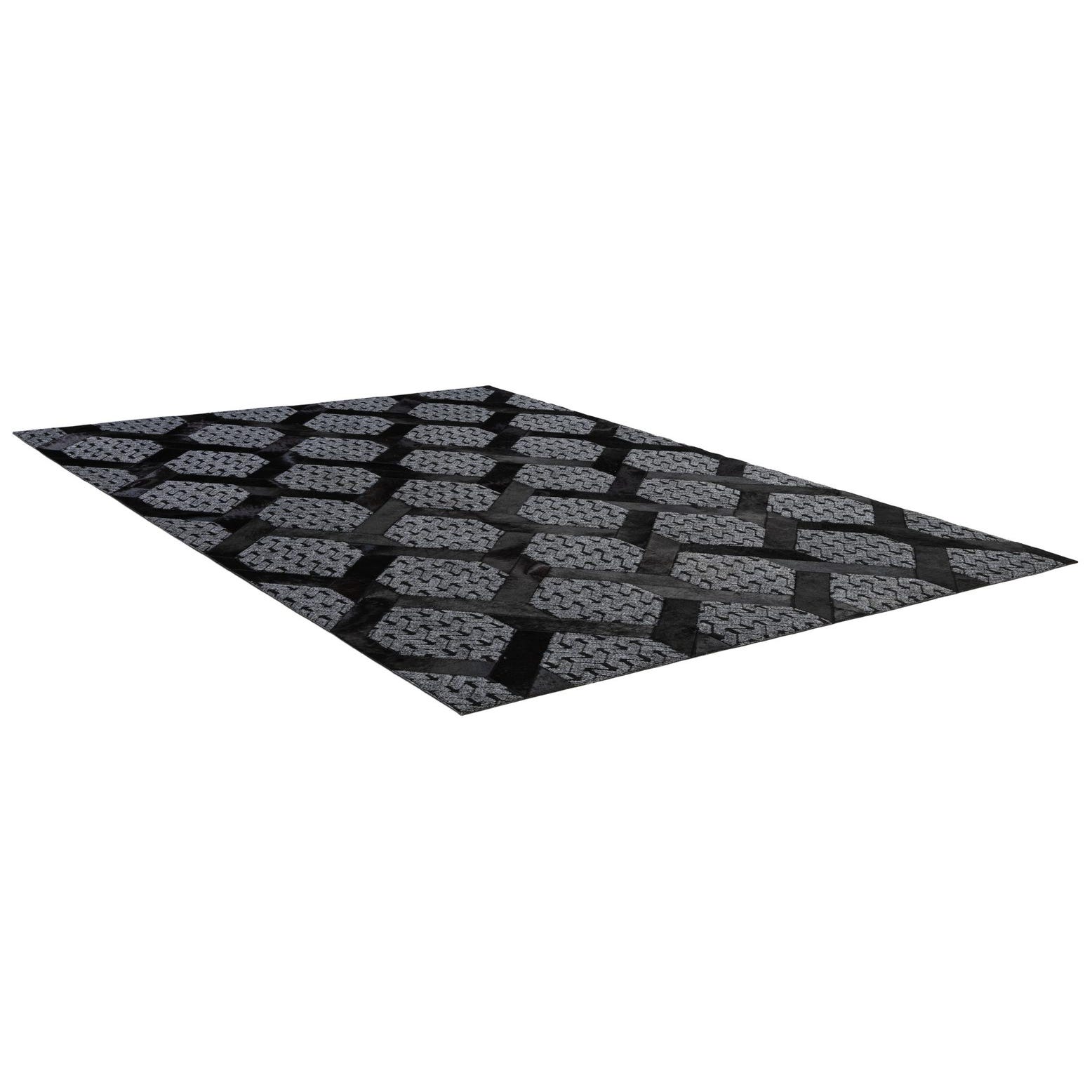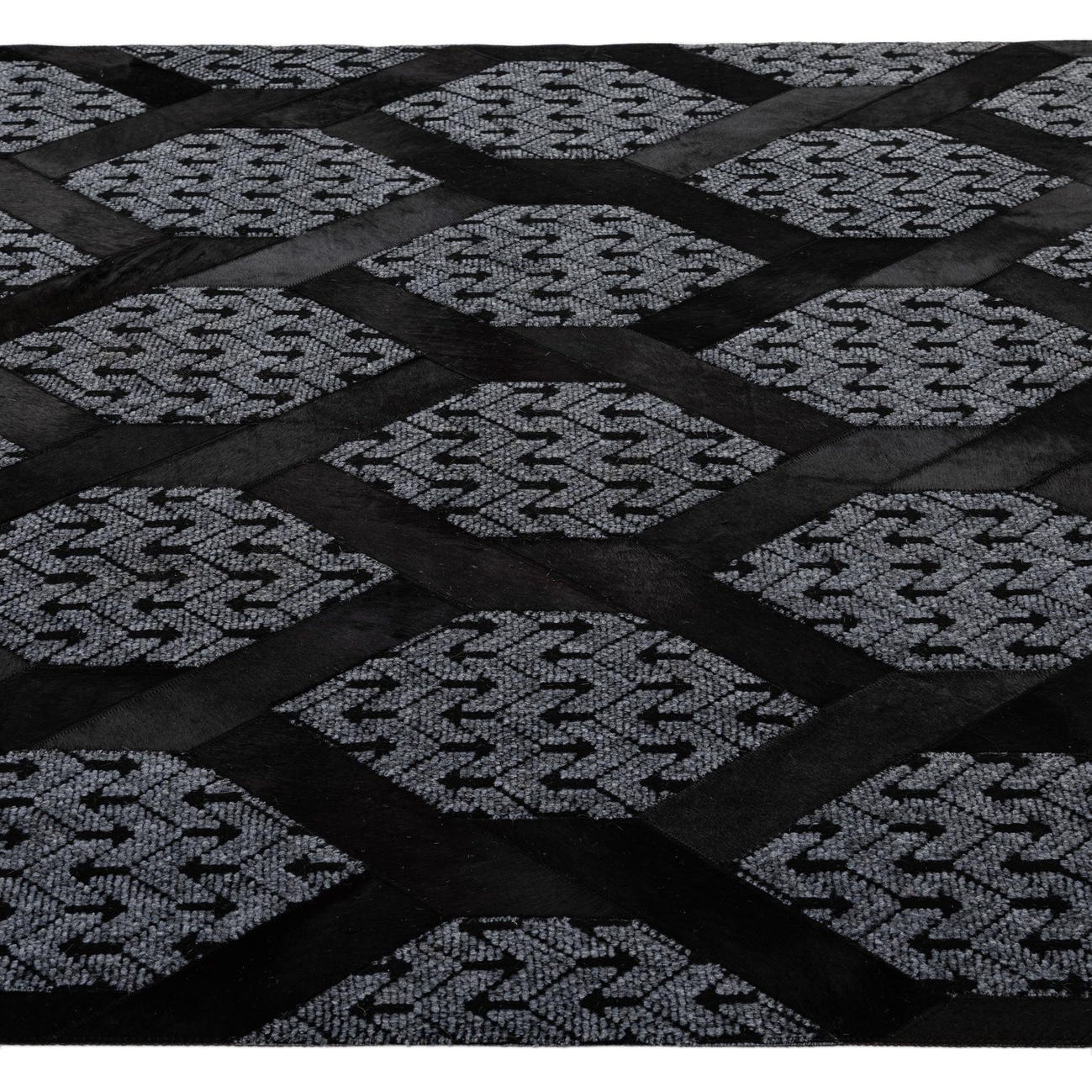 A 5x8 rectangular gray and black cowhide rug with a modern geometric pattern, ideal for a living room.