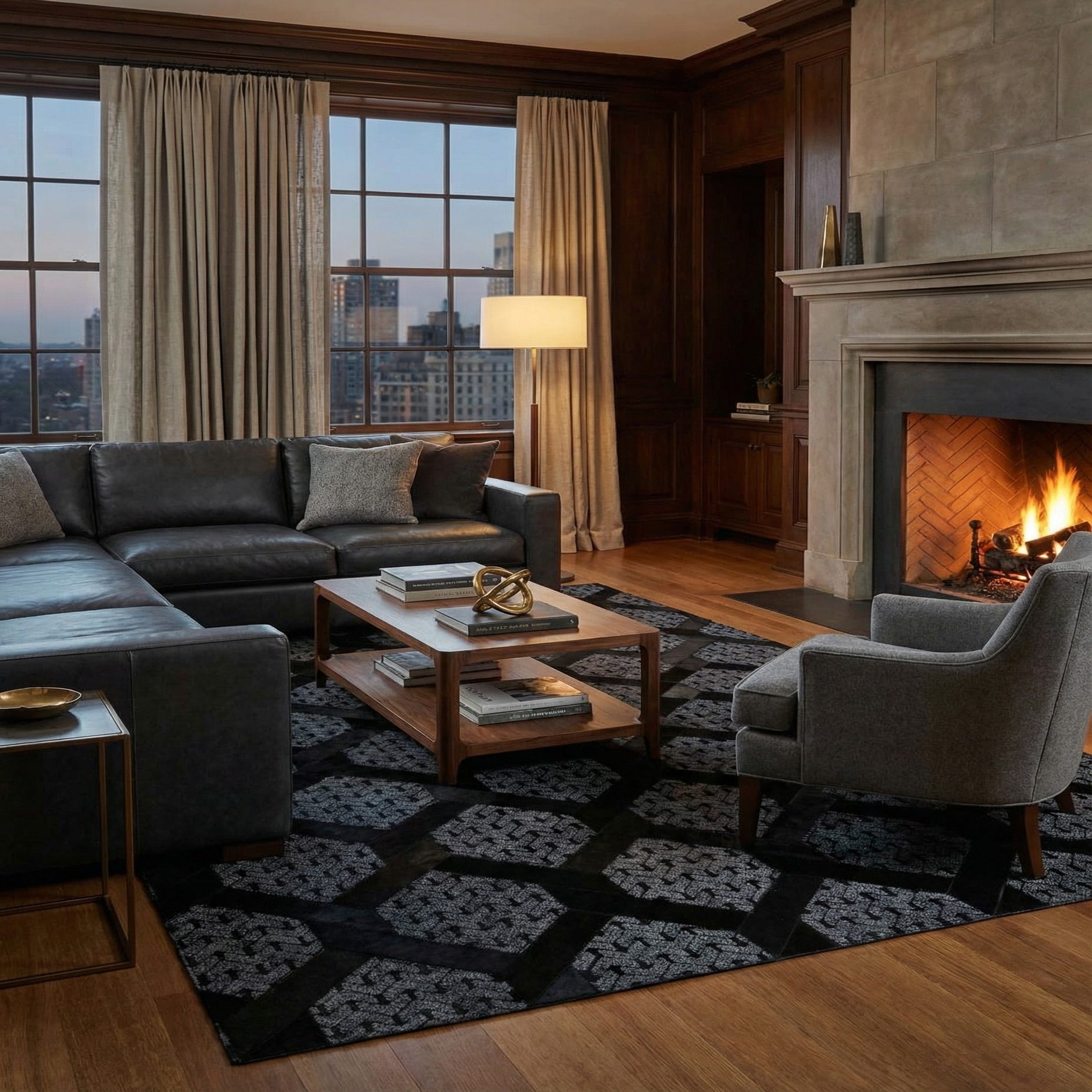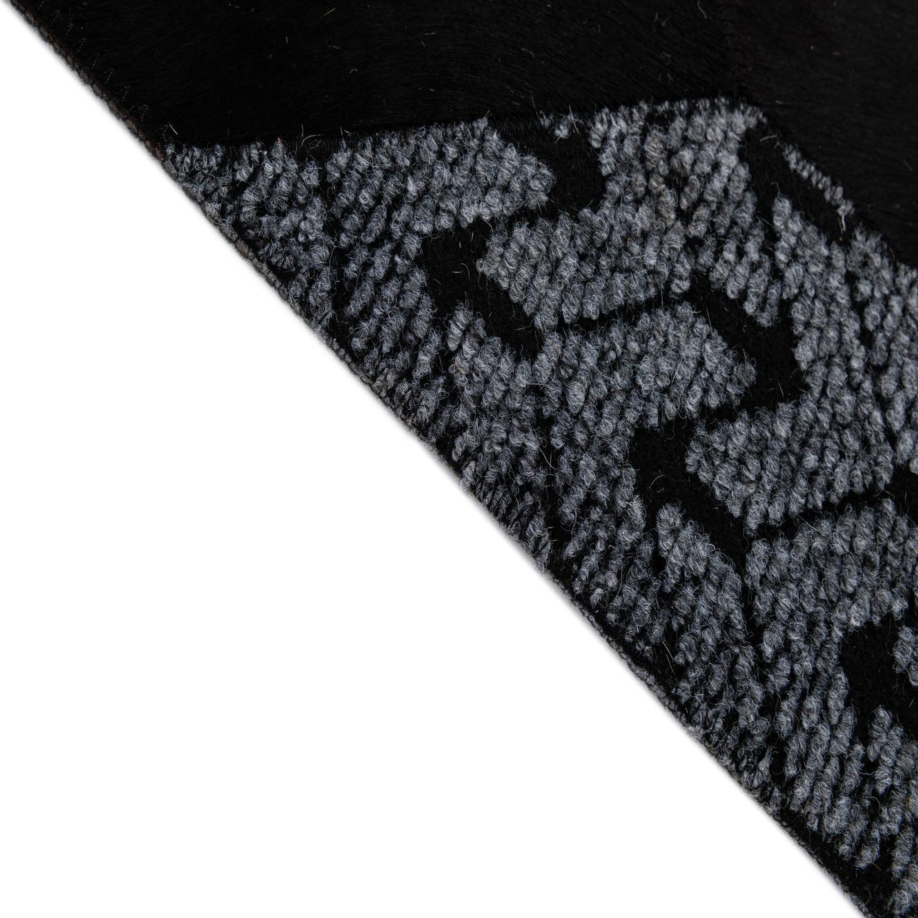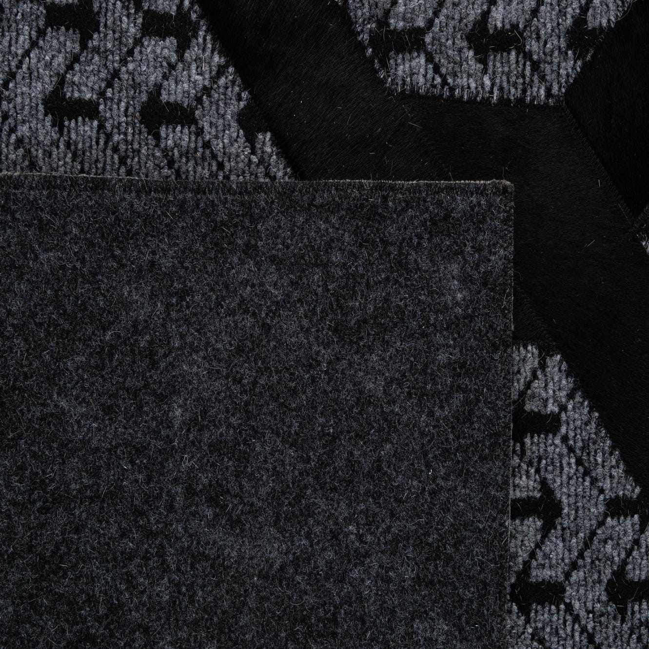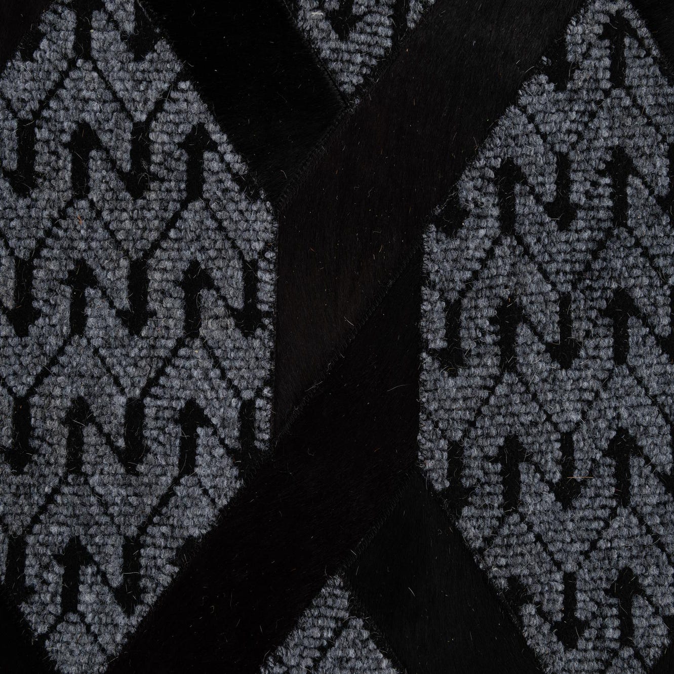 A 5x8 rectangular gray and black cowhide rug with a modern geometric pattern, ideal for a living room.