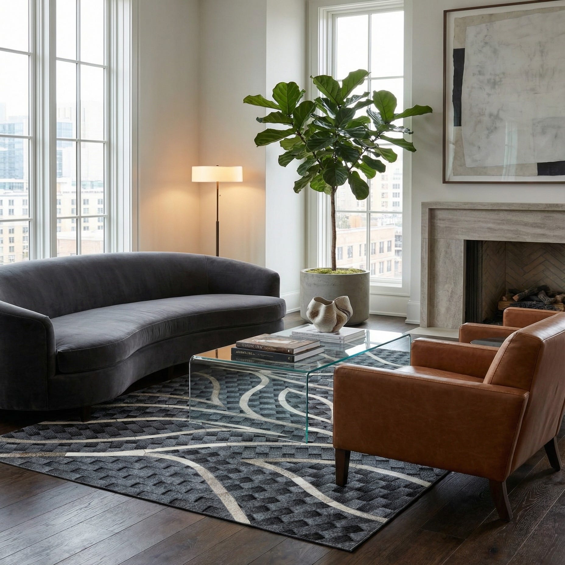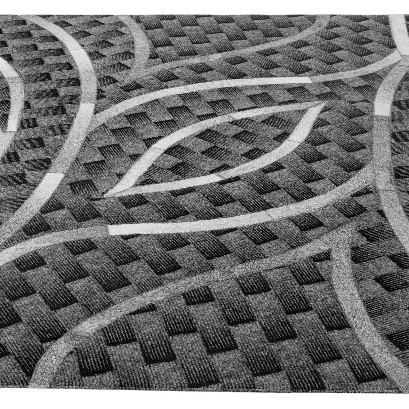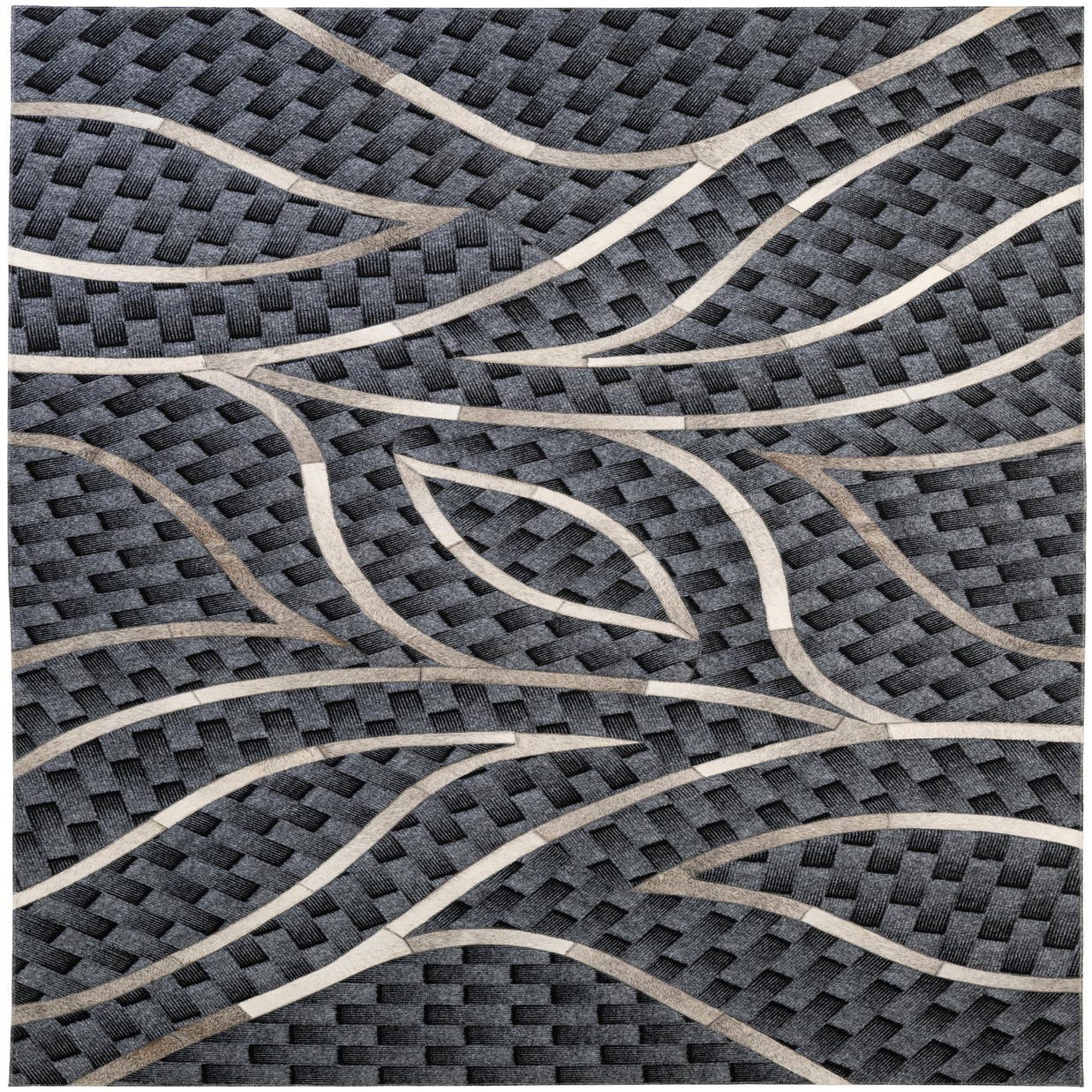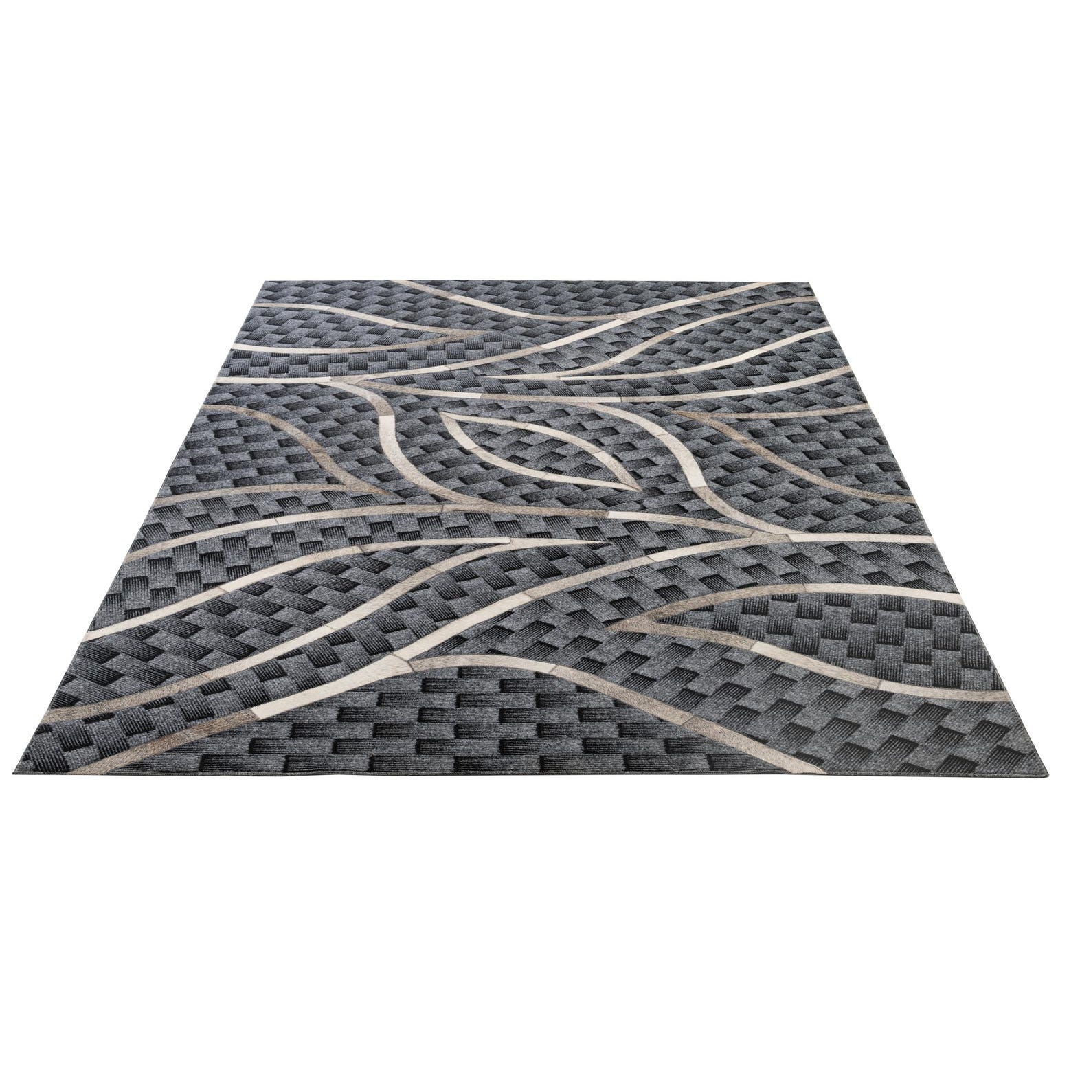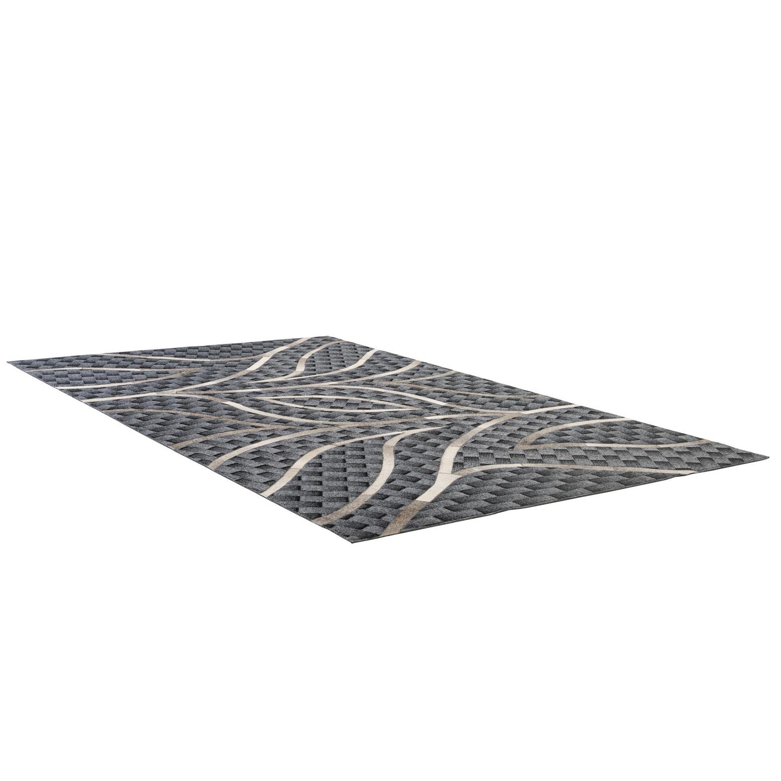 A 5x8 rectangular gray modern area rug with an abstract pattern of light gray and silver wavy lines over a textured dark gray and black woven background.