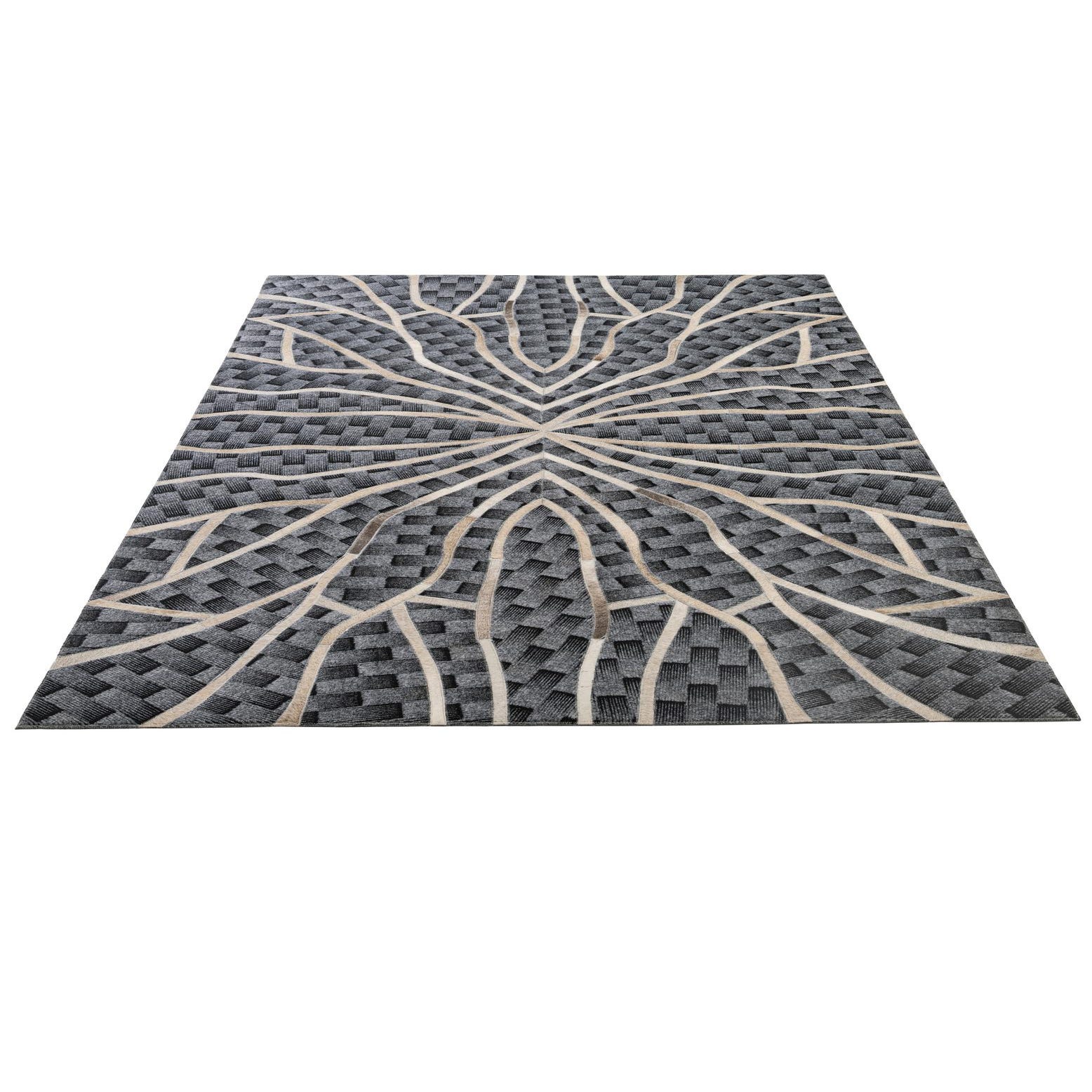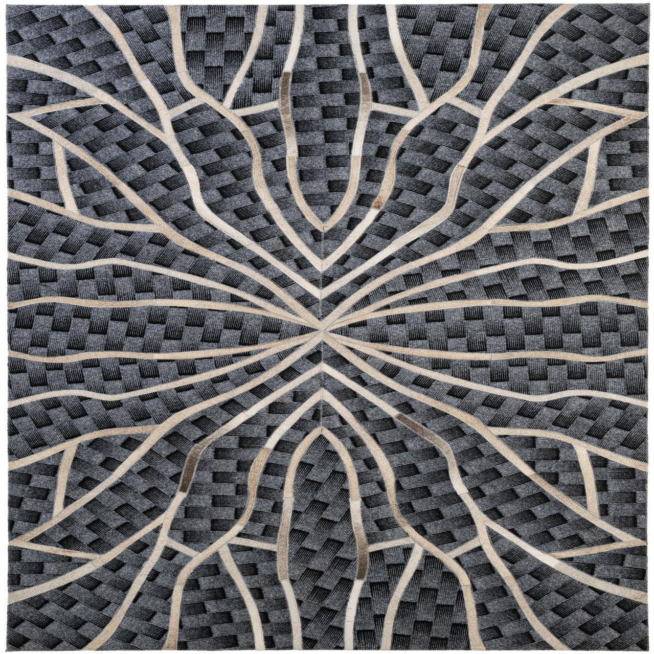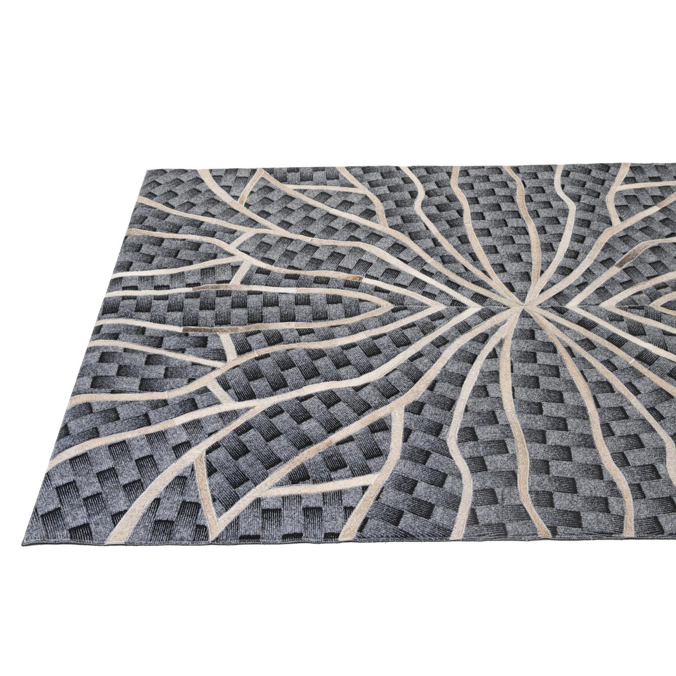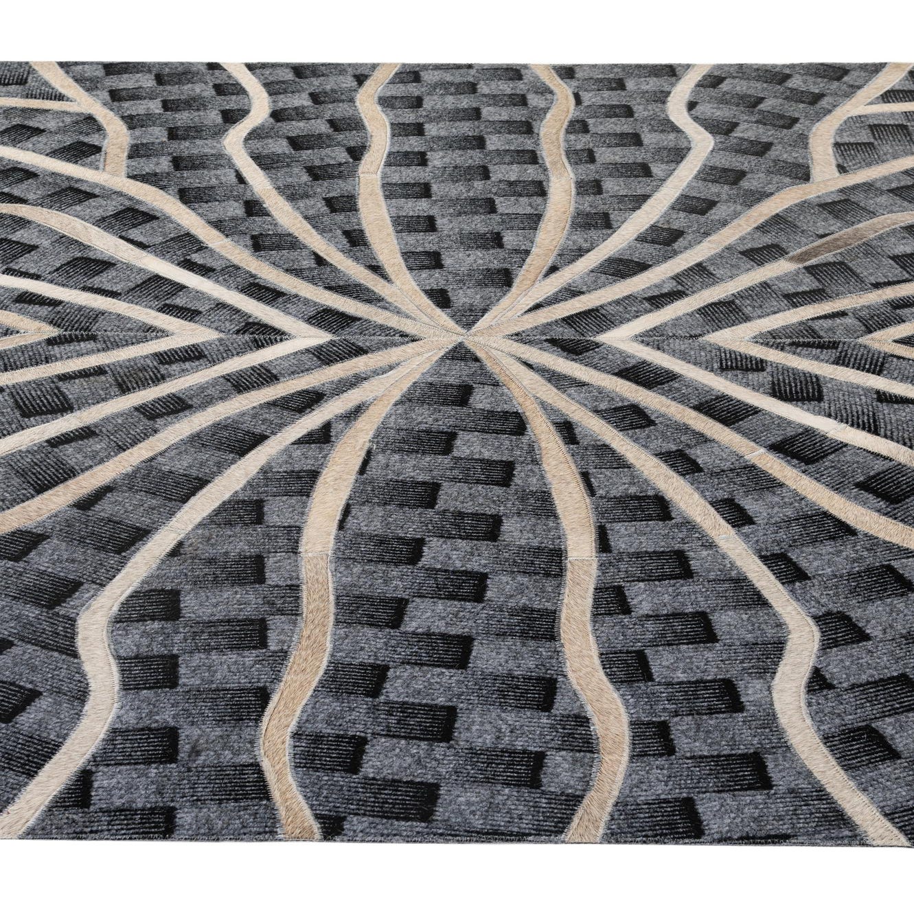 A 5x8 rectangular gray and silver cowhide rug with an abstract, modern branching pattern, handmade for indoor spaces.