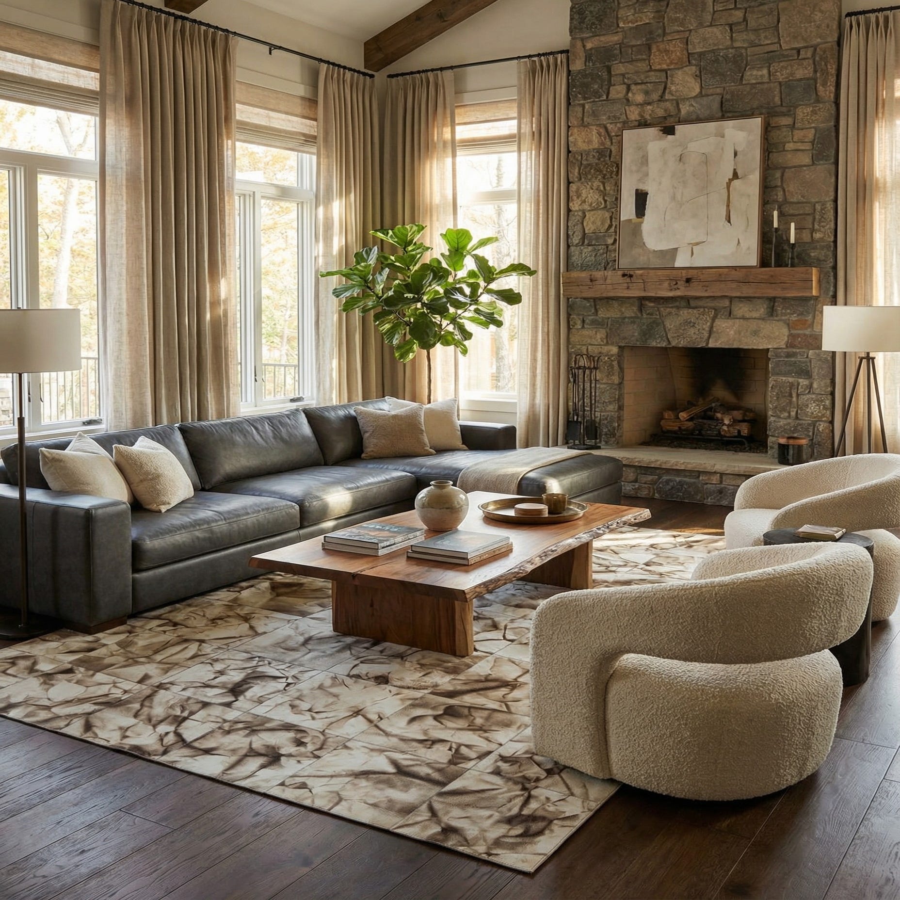 A 5x8 rectangular Cowhide Patchwork rug featuring a modern abstract design in various shades of gray and silver.