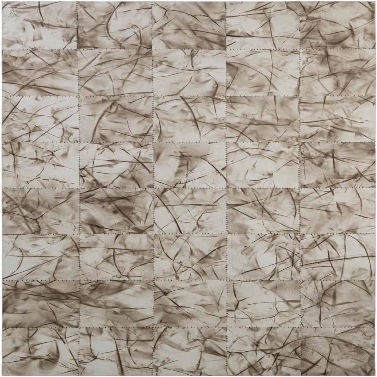 Handmade from cowhide and leather, this patchwork rug arranges stitched squares across a soft gray field for a composed, textural look. Each panel shows warm brown veining and subtle tonal shifts, creating an organic, almost watercolor-like pattern that moves across the surface. The hand-stitched seams add a low-profile relief you can feel beneath your palm, while the hair-on-hide face offers a smooth, tactile finish with natural grain and gentle nap.