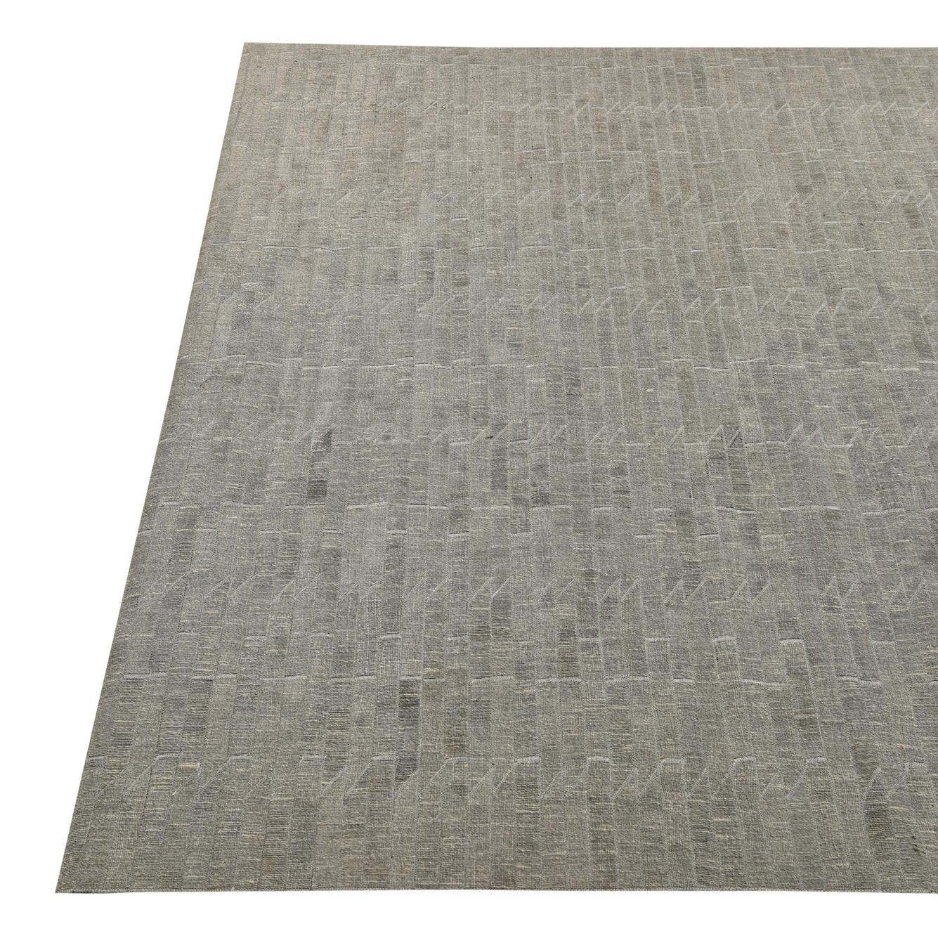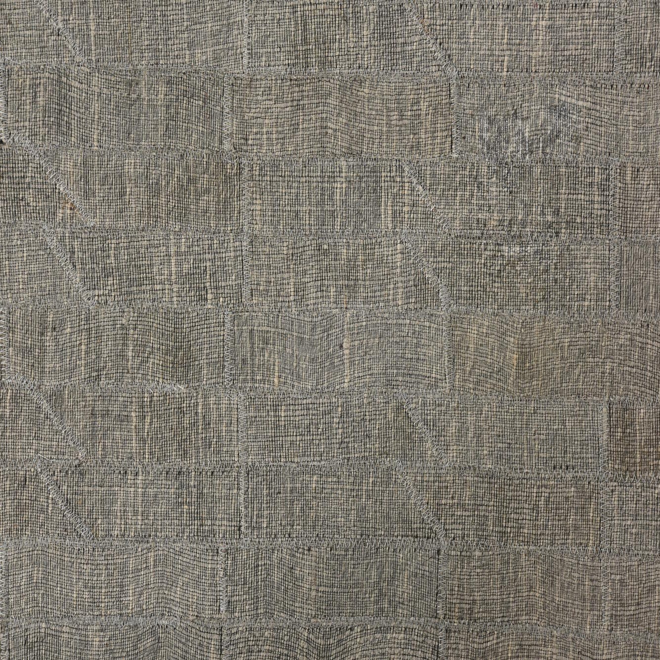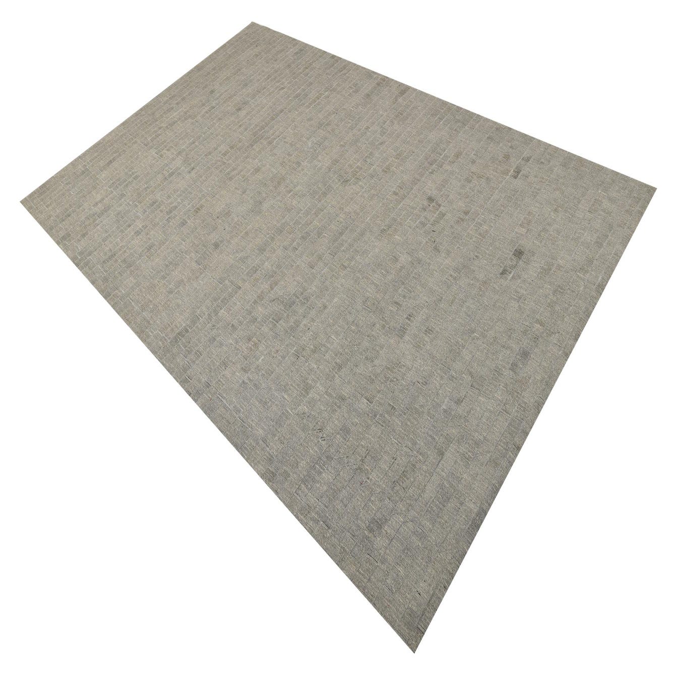 A 5x8 rectangular gray modern abstract rug made from cowhide and leather, suitable for indoor spaces.