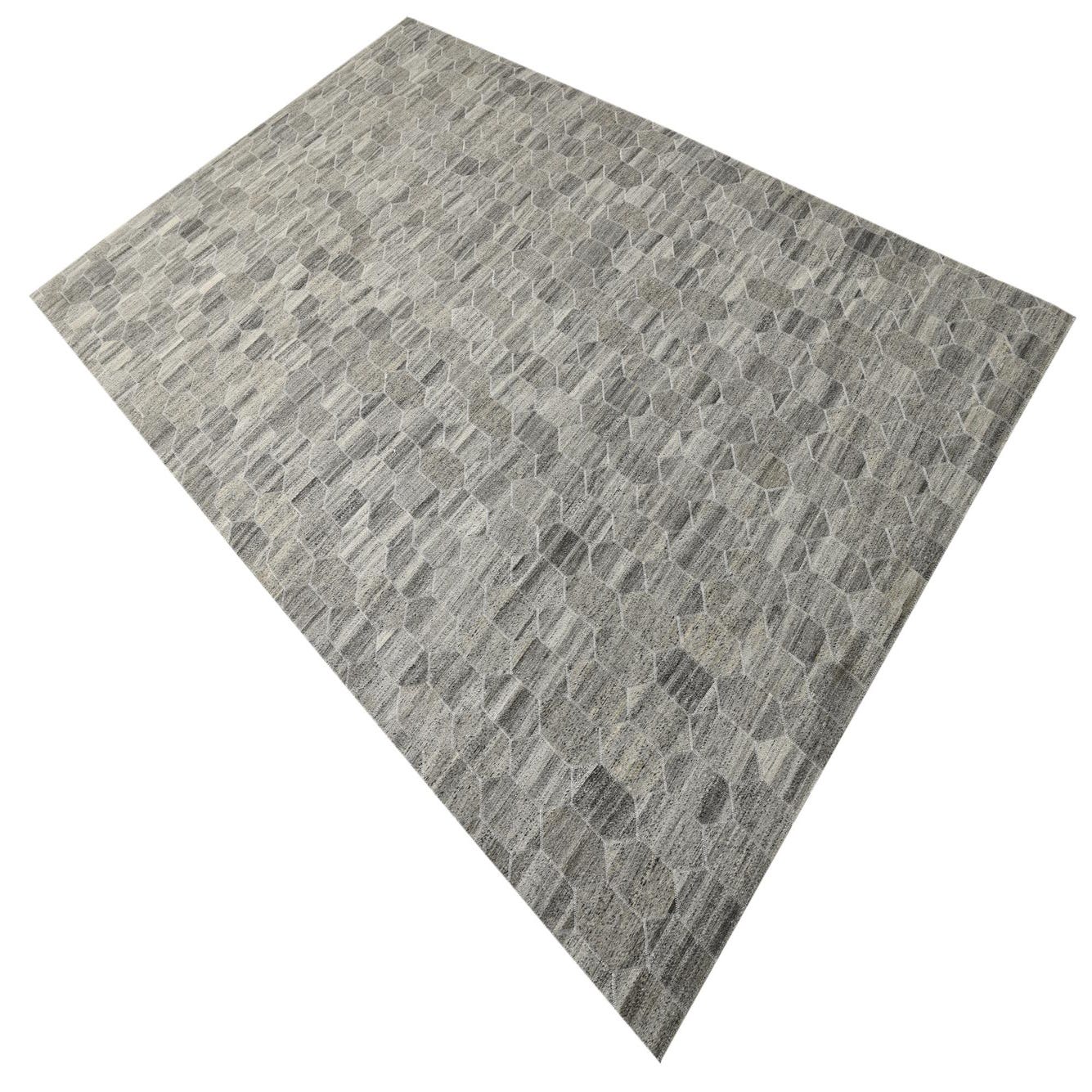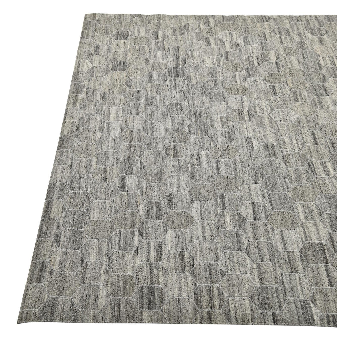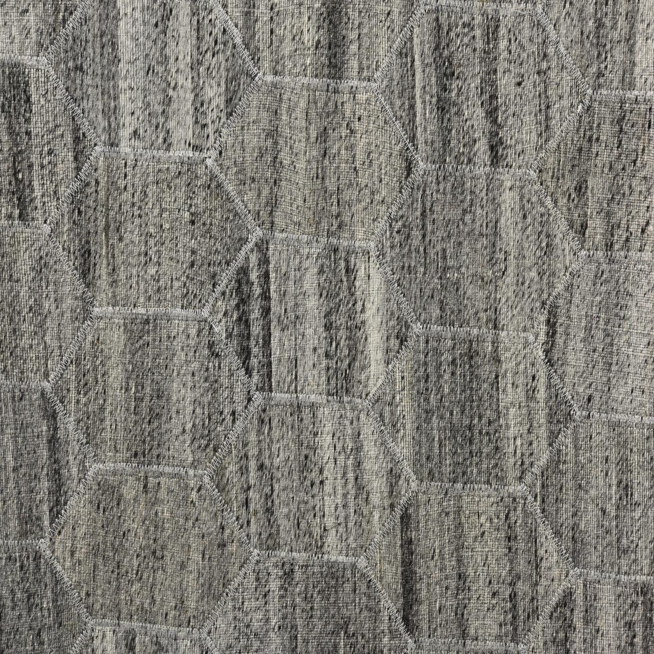 A 5x8 rectangular Cowhide & Leather rug in shades of gray and silver, featuring a modern geometric pattern of interlocking hexagons, suitable for a living room or office.