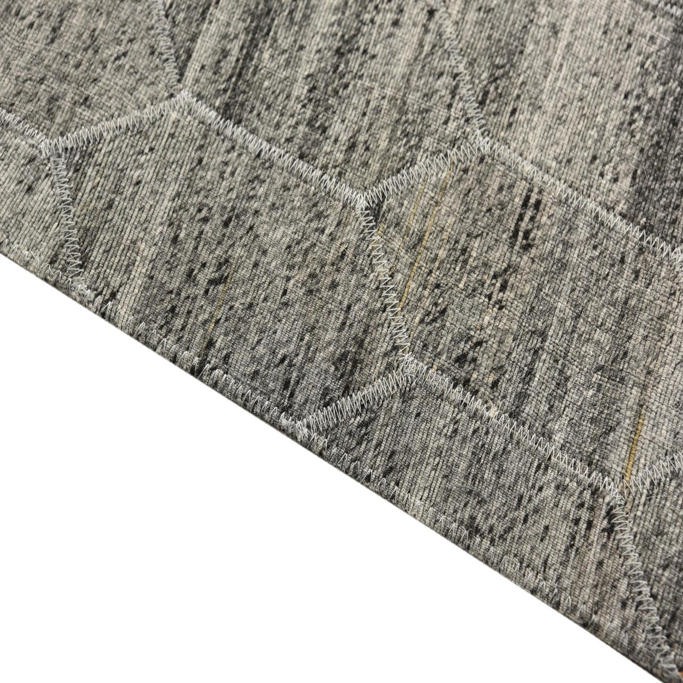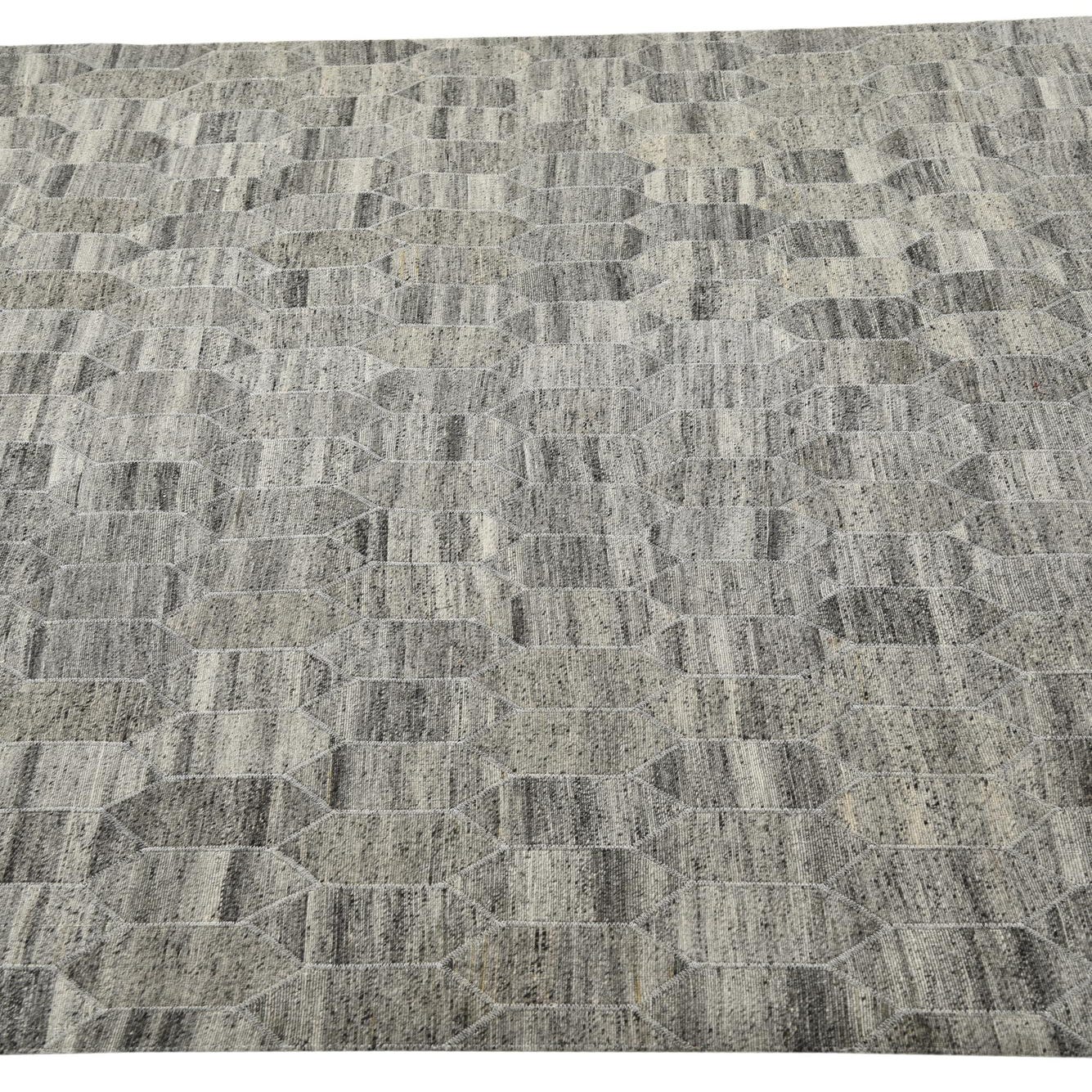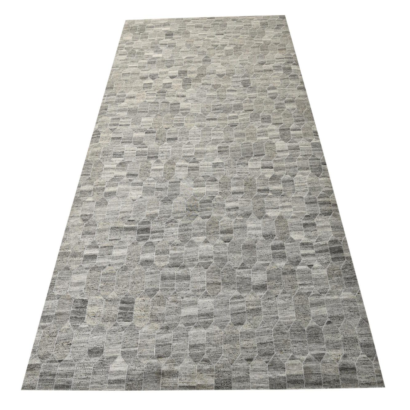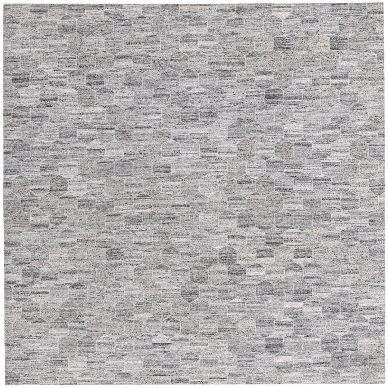 A 5x8 rectangular Cowhide & Leather rug in shades of gray and silver, featuring a modern geometric pattern of interlocking hexagons, suitable for a living room or office.