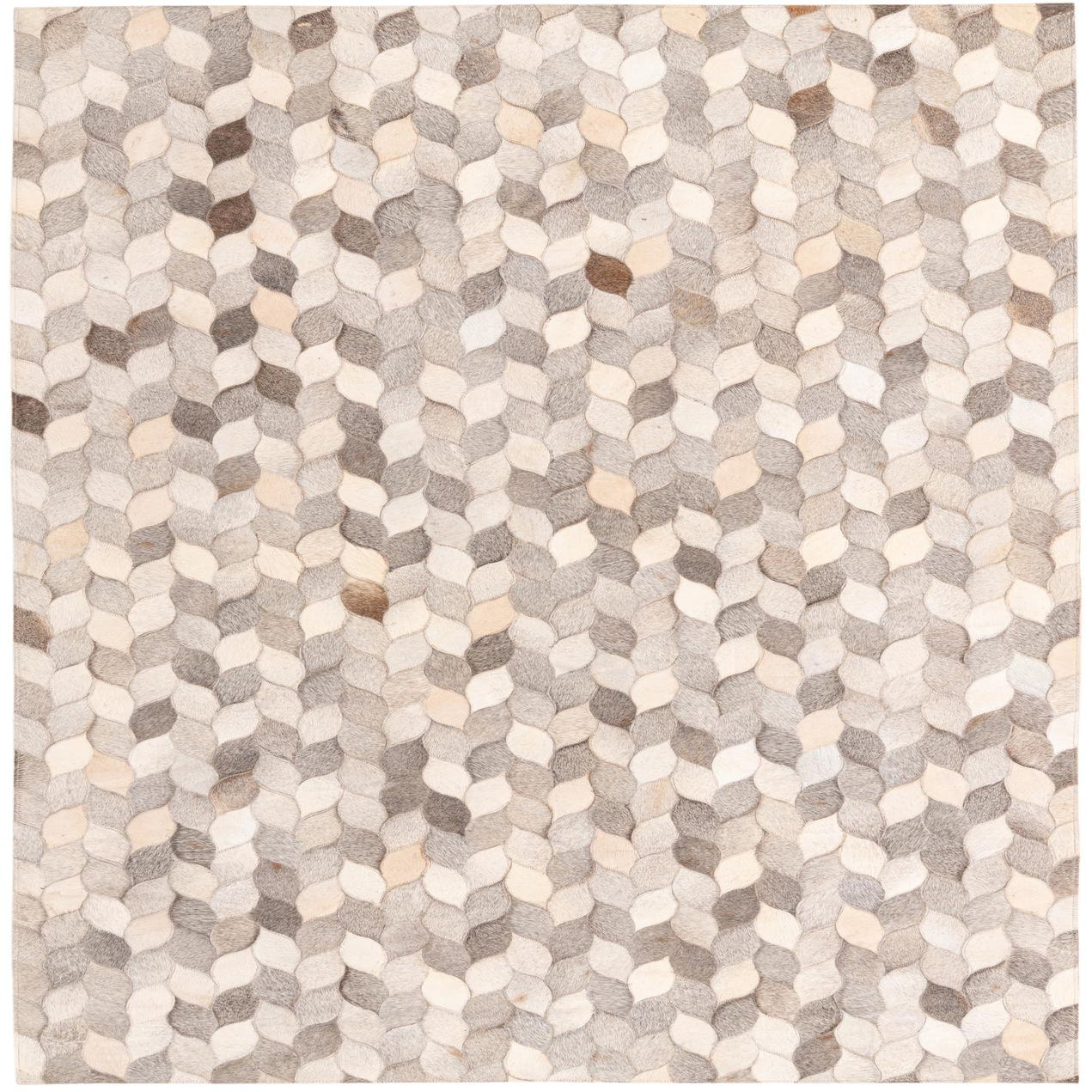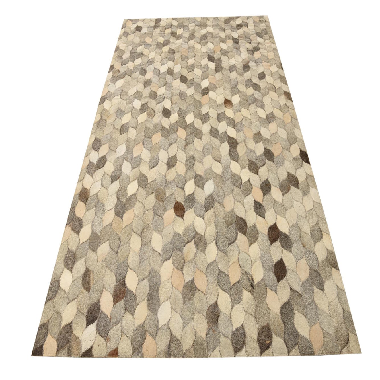 A 5x8 rectangular Cowhide rug featuring a modern leaf-like pattern in various shades of gray and silver.