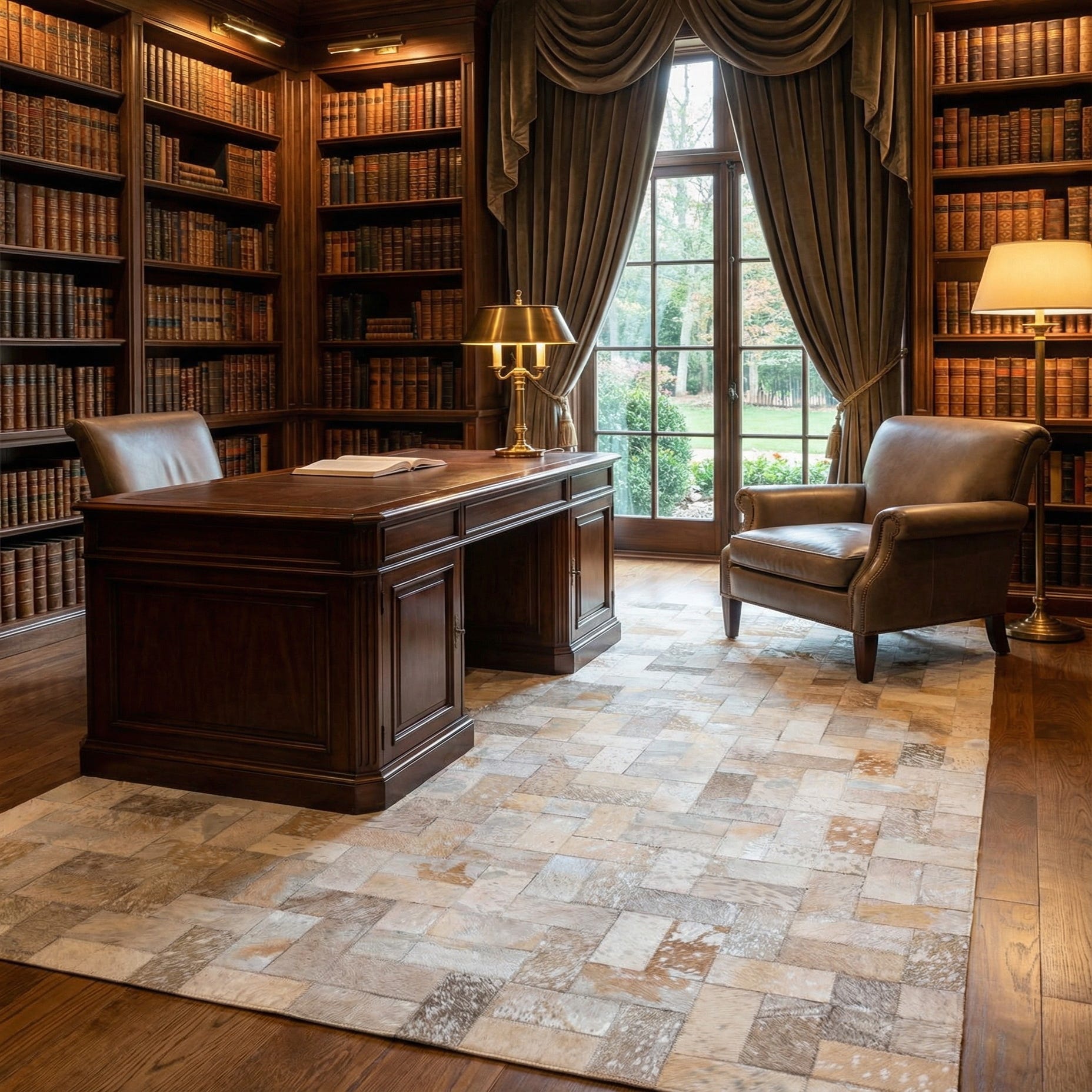 Handmade from cowhide and leather, this rug presents a structured patchwork of small rectangular tiles arranged in a basketweave-like pattern. The gray background anchors the design while panels of ivory, beige, light brown and silver create soft contrast and a quiet, natural variation across the surface. Running your hand over it reveals the subtle hair-on-hide texture with occasional smooth leather accents that catch light, giving the rug both a tactile warmth and a refined, low-profile sheen.