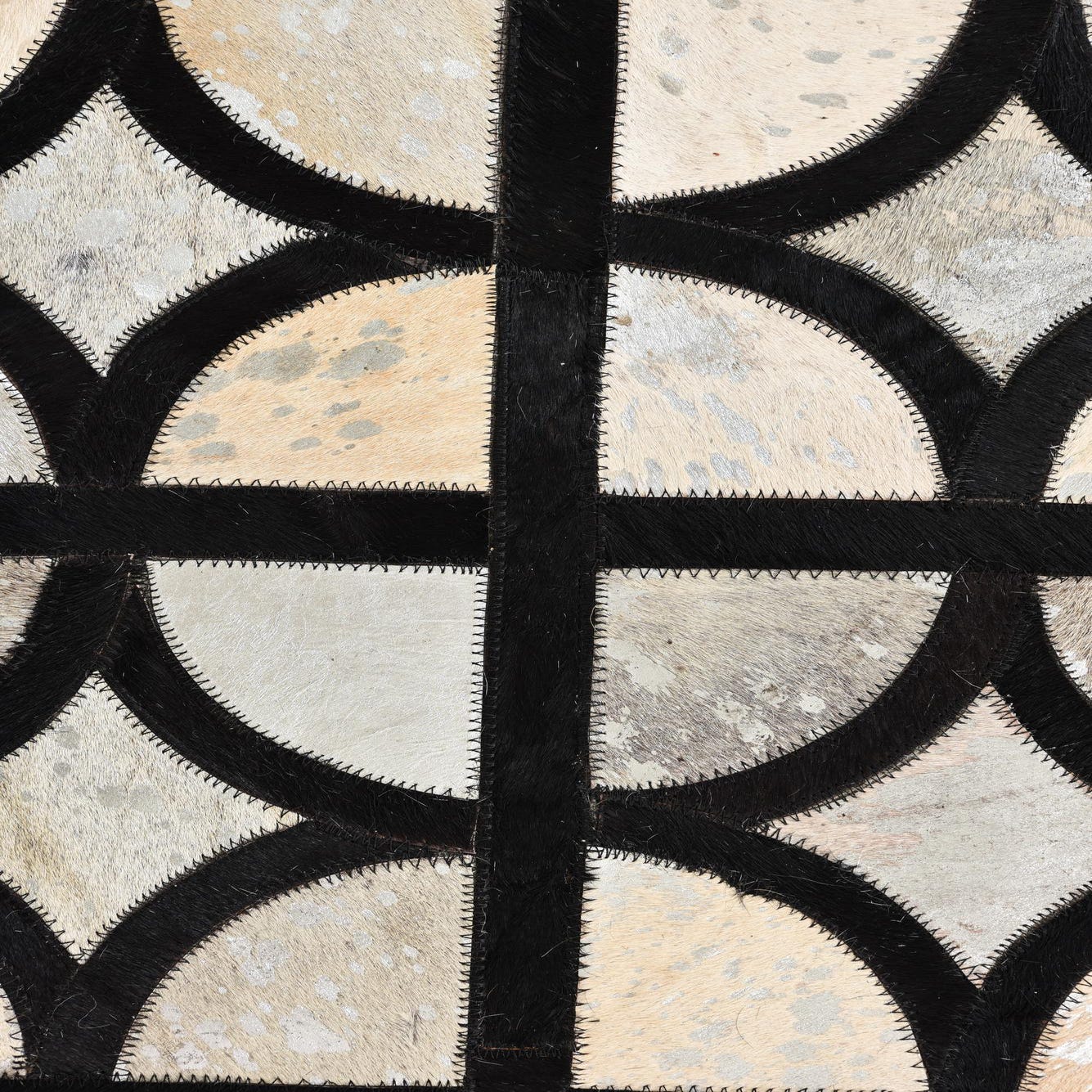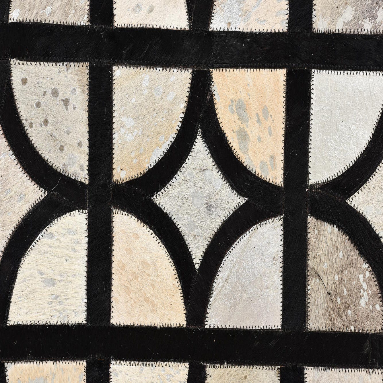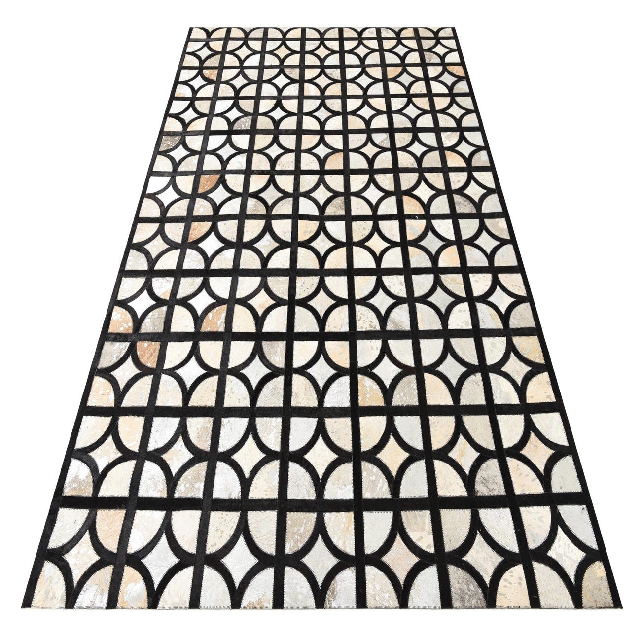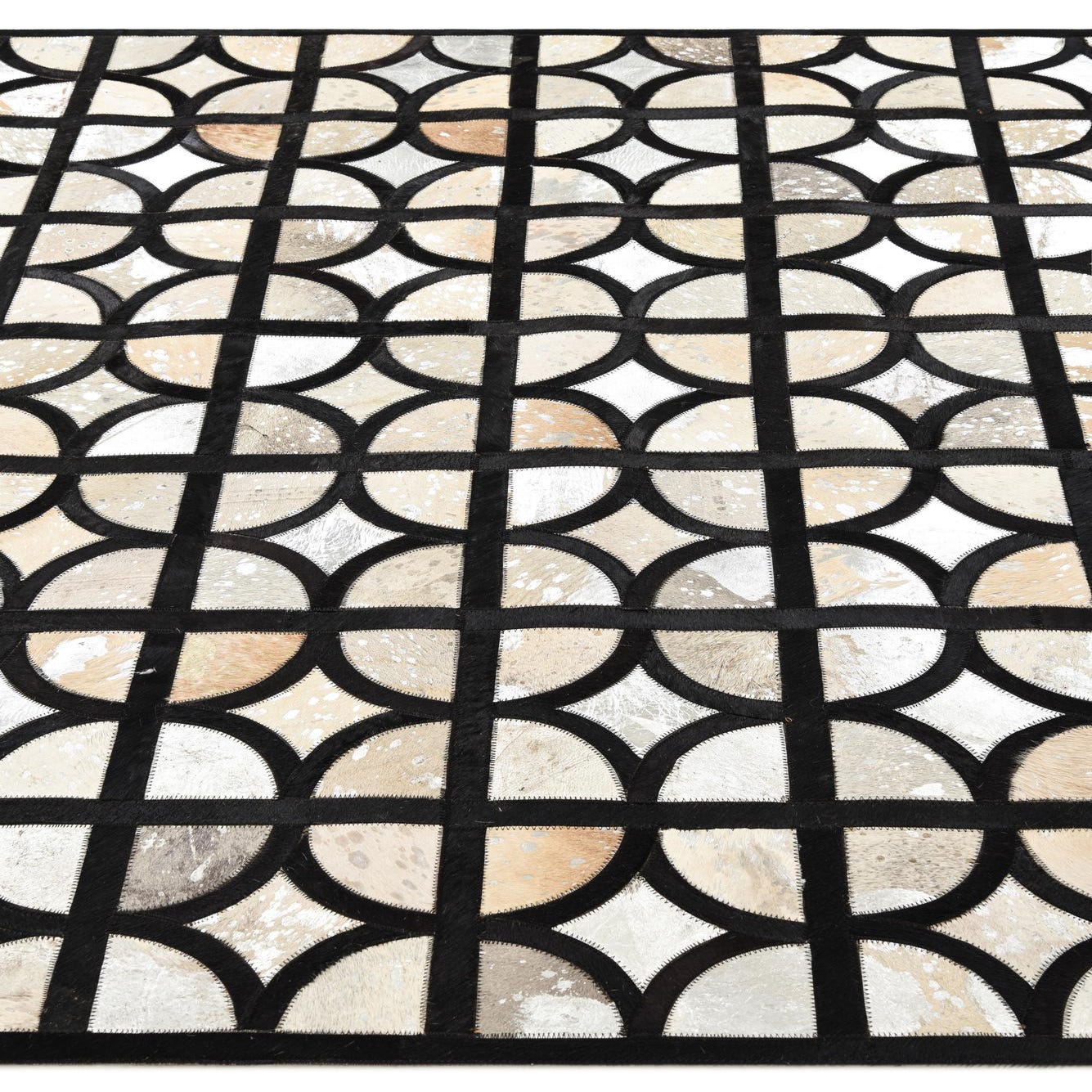 A 5x8 rectangular Cowhide rug with a modern geometric pattern of interlocking black lines and varied gray and silver semicircles.