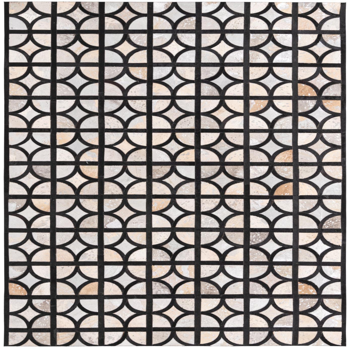 From our Cowhide collection, this hand-made 5x8 rug crafted from cowhide and leather embodies a modern geometric pattern, drawing on a sophisticated blend of gray, beige, black, silver, and ivory tones. The dominant gray background is complemented by the precise arrangement of shapes and lines that create a dynamic visual texture.