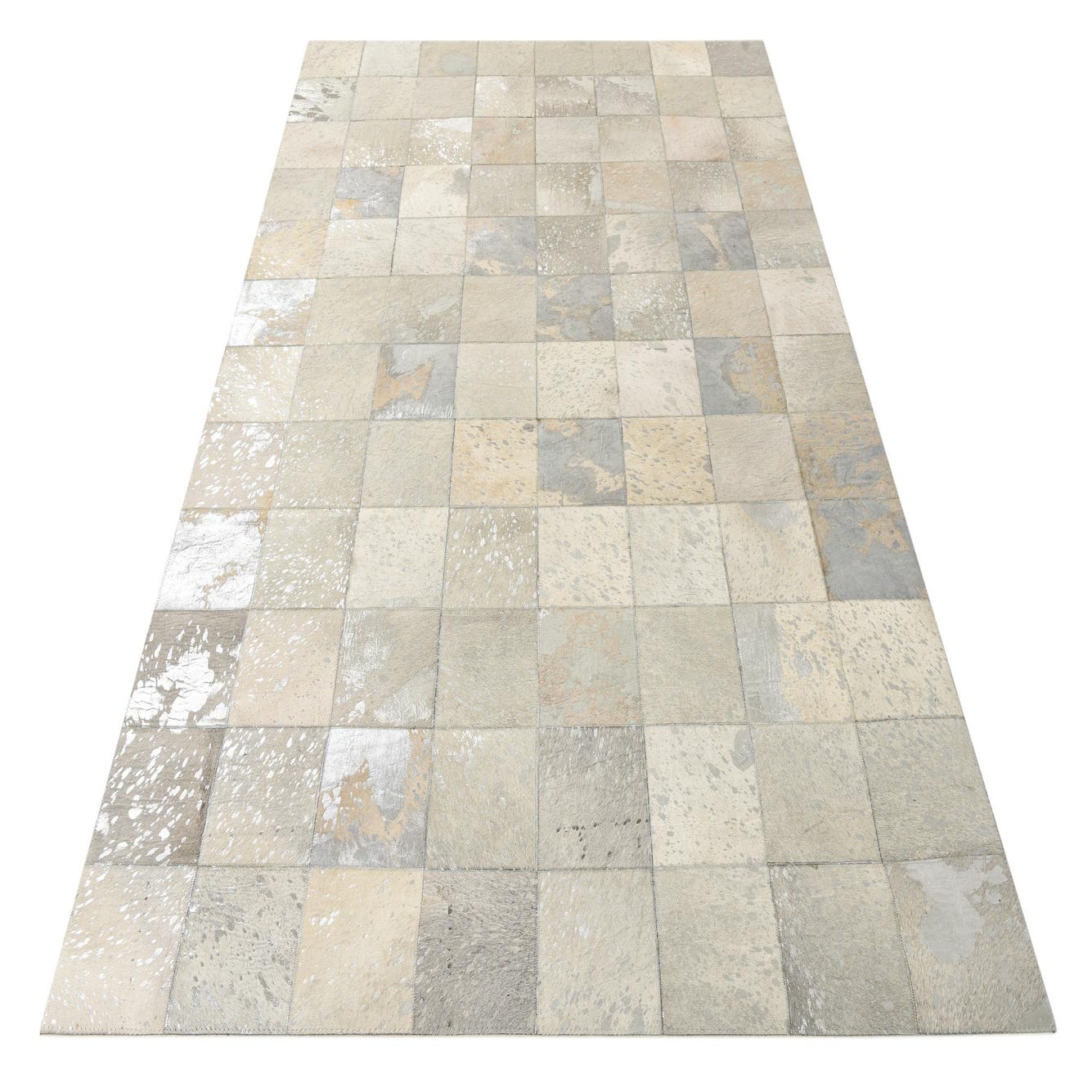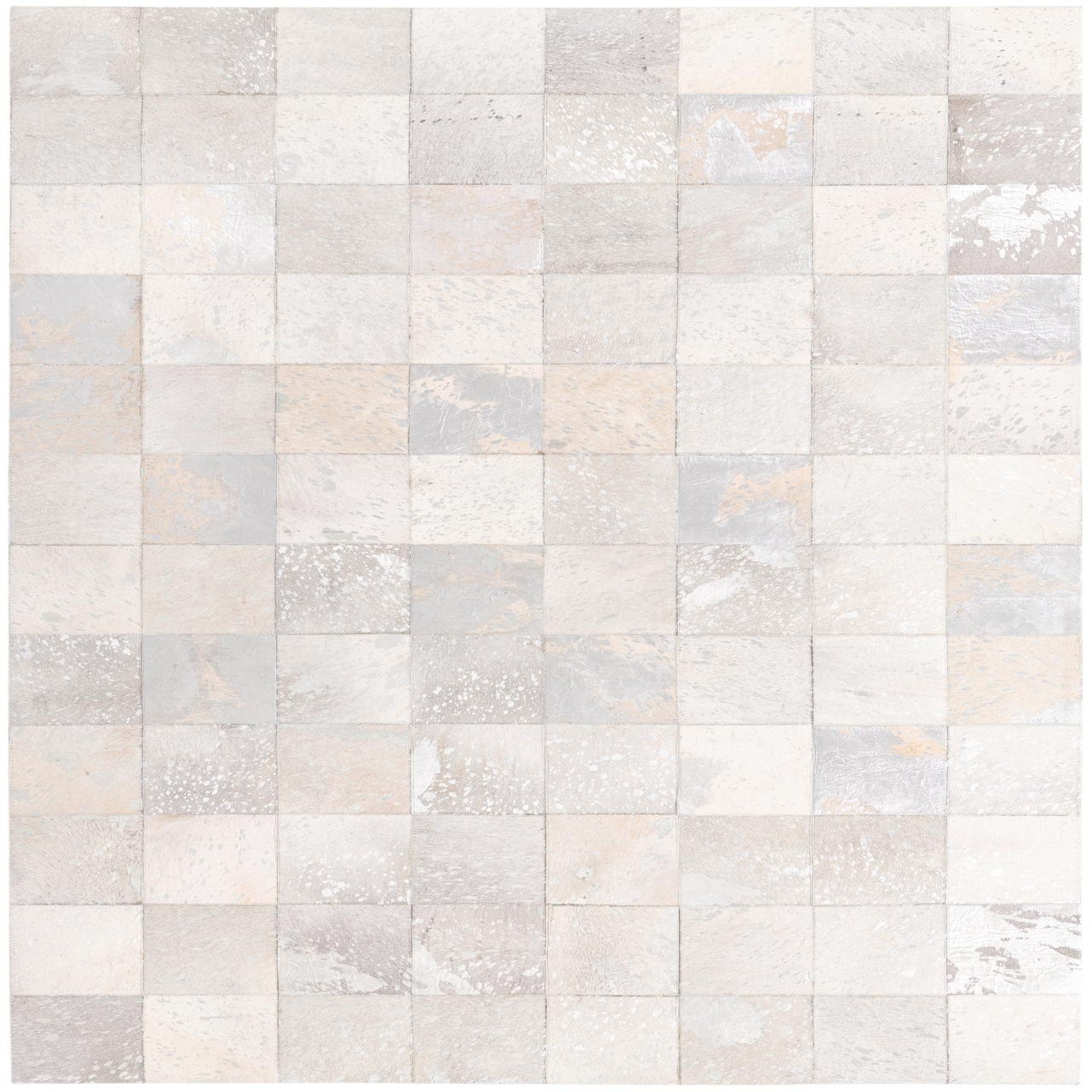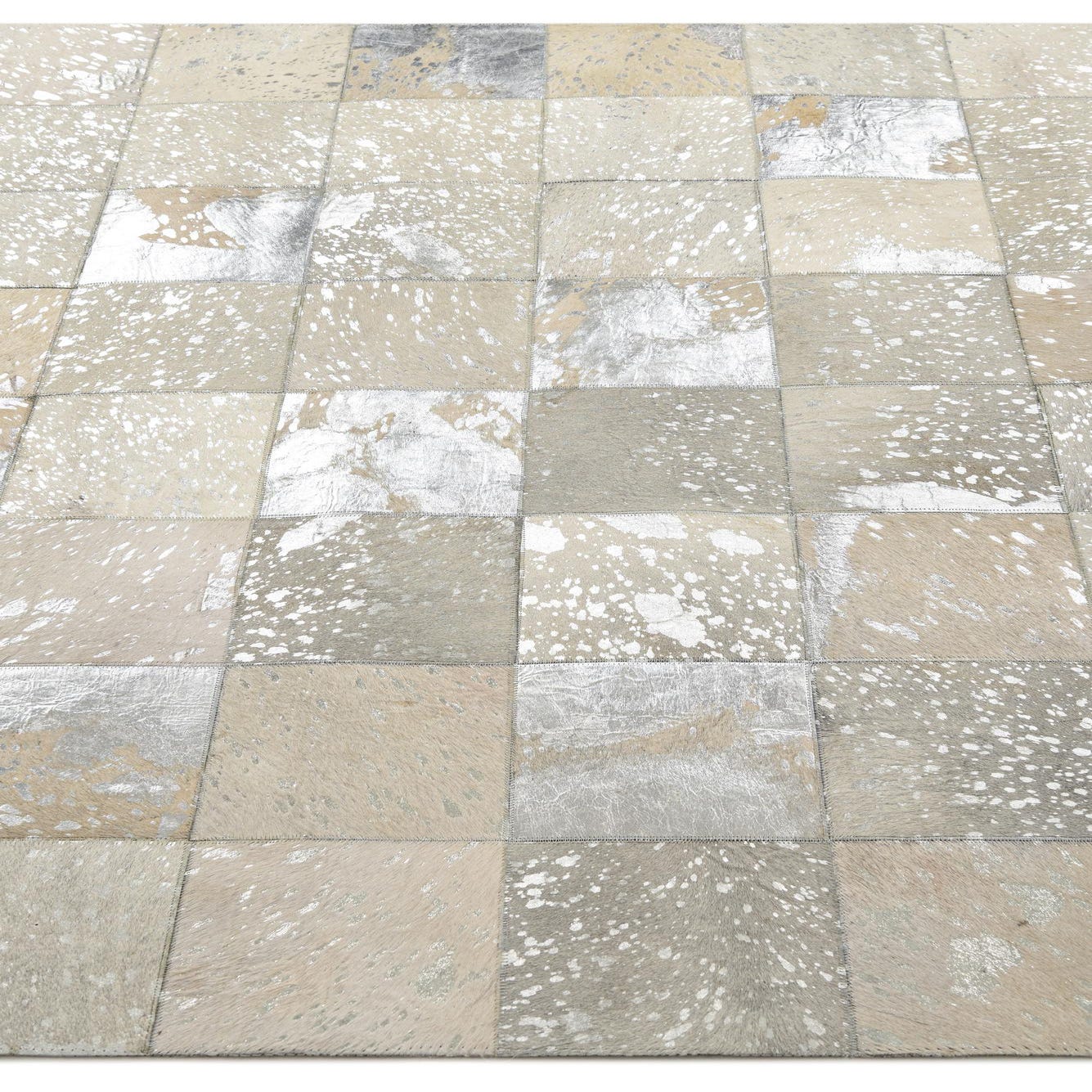 A grid of hand-stitched cowhide squares gives this rug a calm, modern pattern with subtle organic variation. The gray background provides a soft, neutral field while ivory patches and silver highlights catch light across the hair-on-hide surface, creating gentle contrast without being bold. Each square shows natural texture and slight tonal shifts, with visible seam lines where the leather backing meets the hide for a refined, tactile finish. Hand made of cowhide and leather, the surface is supple underfoot with a low, natural nap that adds depth to the overall look.