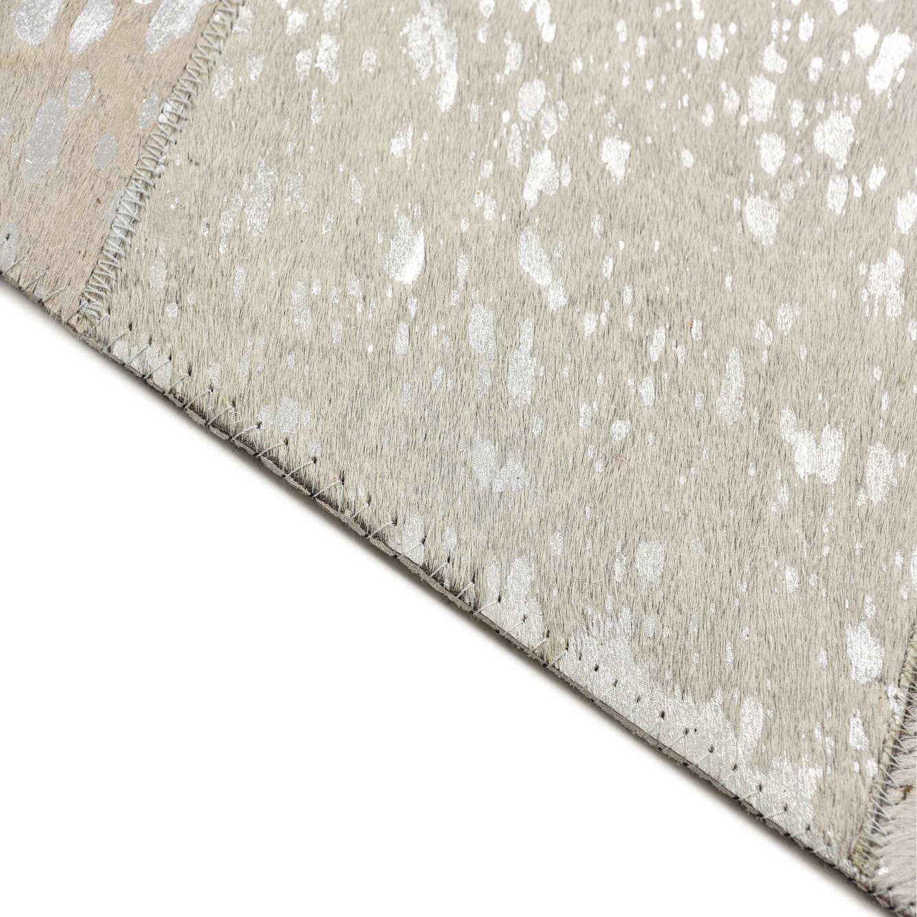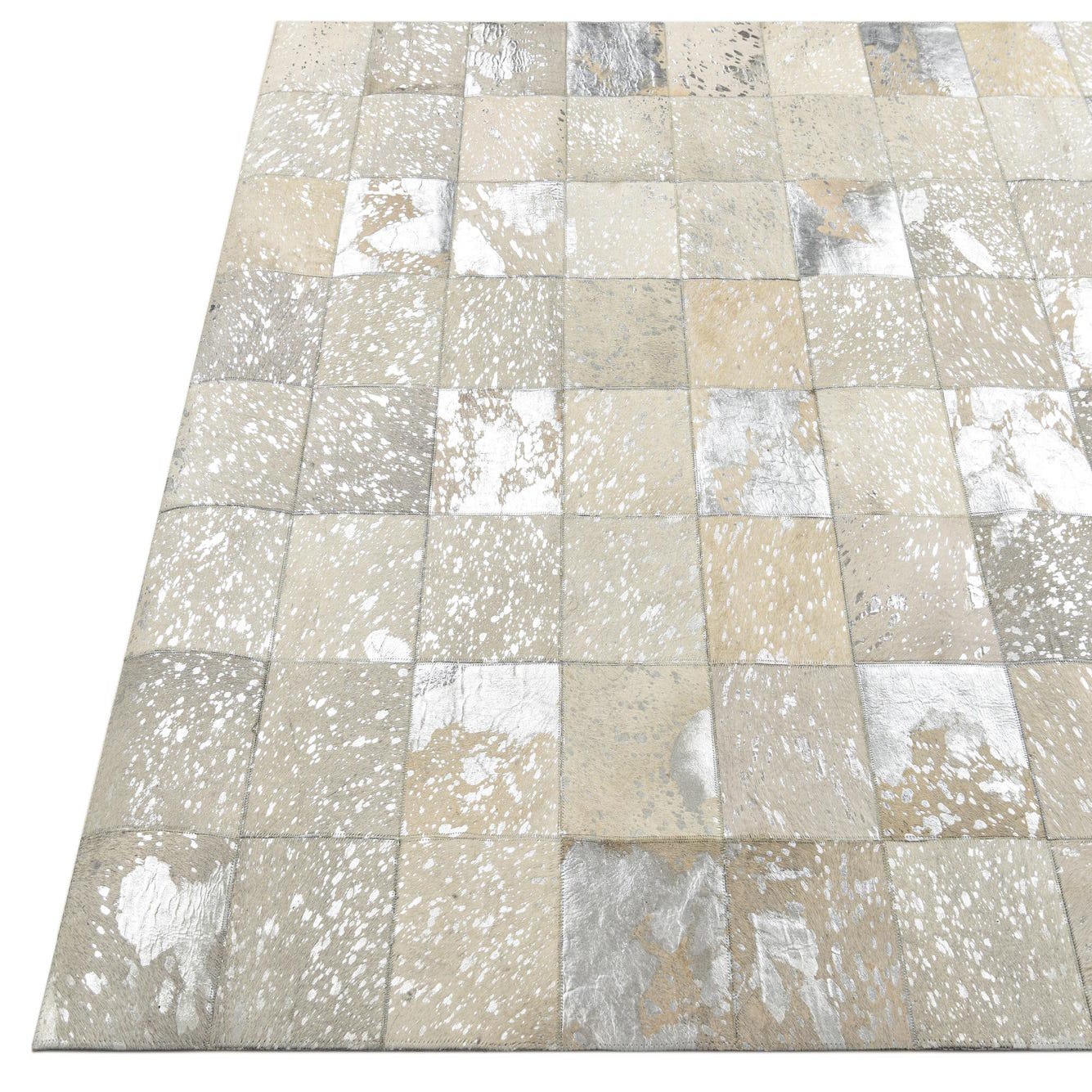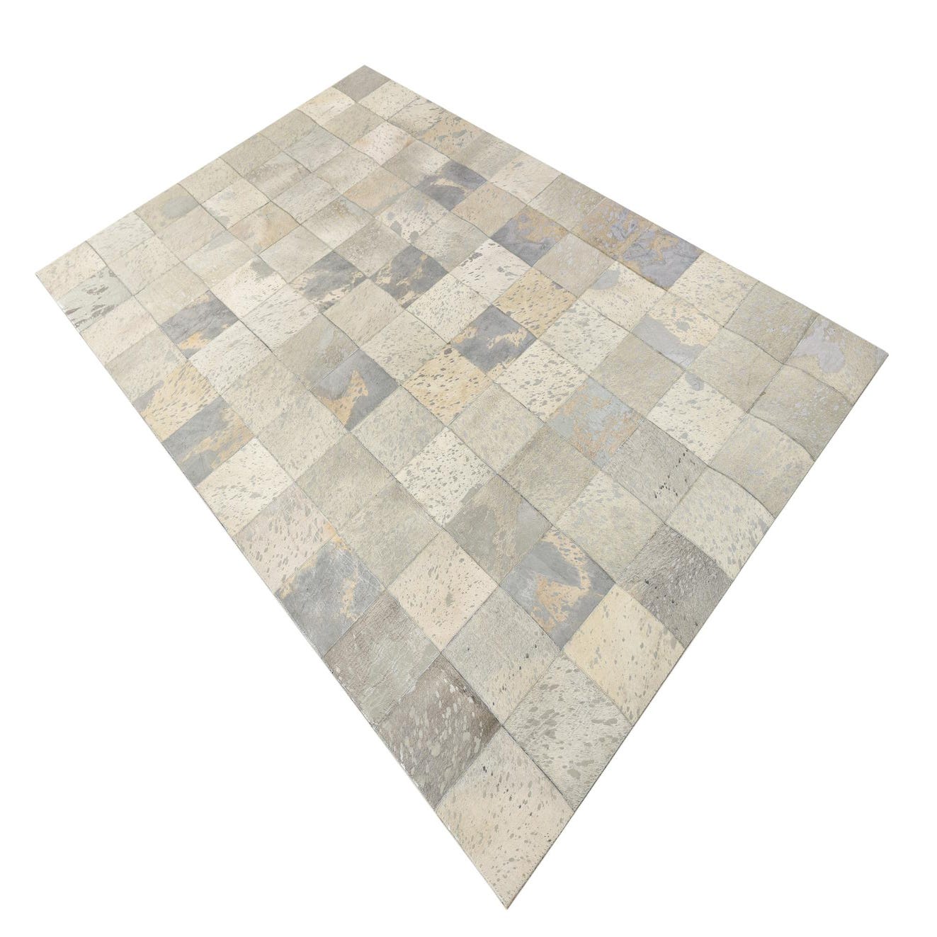A grid of hand-stitched cowhide squares gives this rug a calm, modern pattern with subtle organic variation. The gray background provides a soft, neutral field while ivory patches and silver highlights catch light across the hair-on-hide surface, creating gentle contrast without being bold. Each square shows natural texture and slight tonal shifts, with visible seam lines where the leather backing meets the hide for a refined, tactile finish. Hand made of cowhide and leather, the surface is supple underfoot with a low, natural nap that adds depth to the overall look.