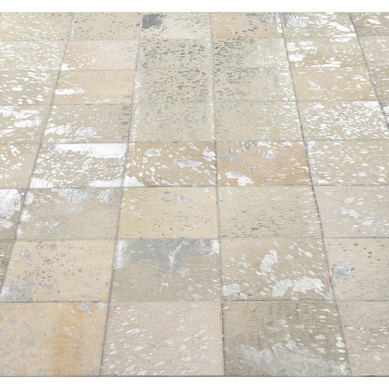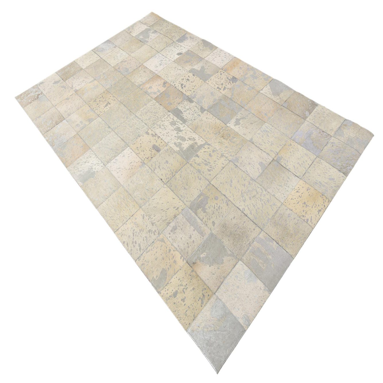 A 5x8 rectangular Cowhide rug featuring a modern patchwork pattern of gray and silver squares, suitable for a living room.