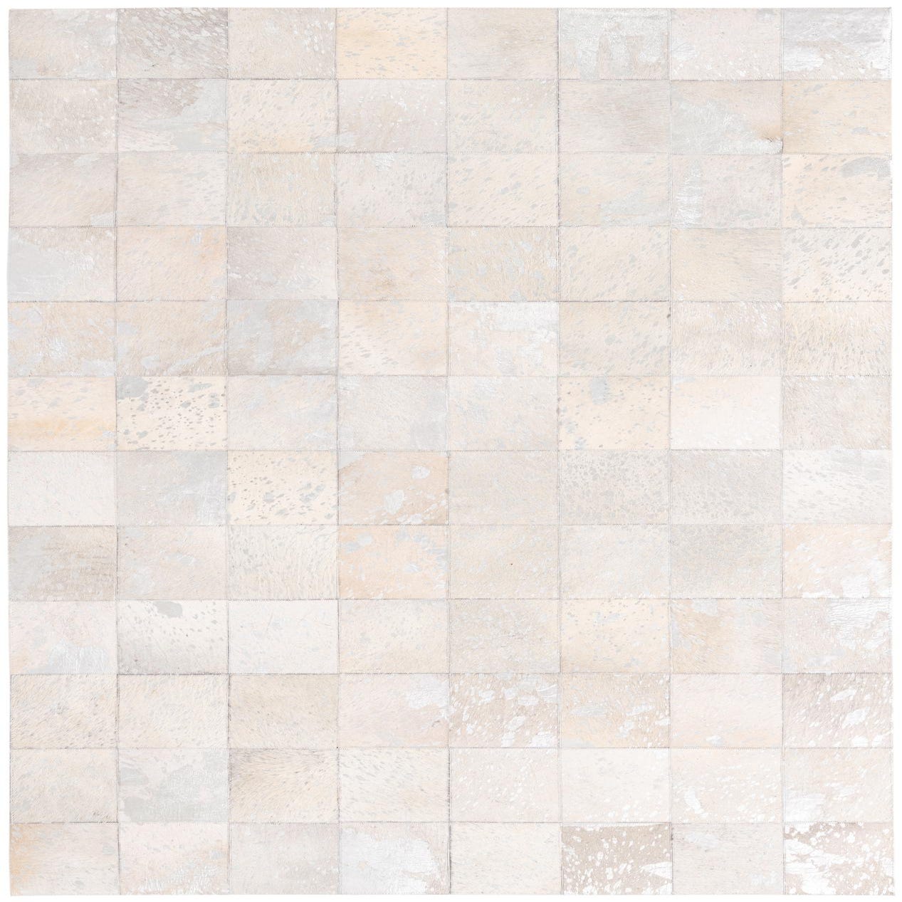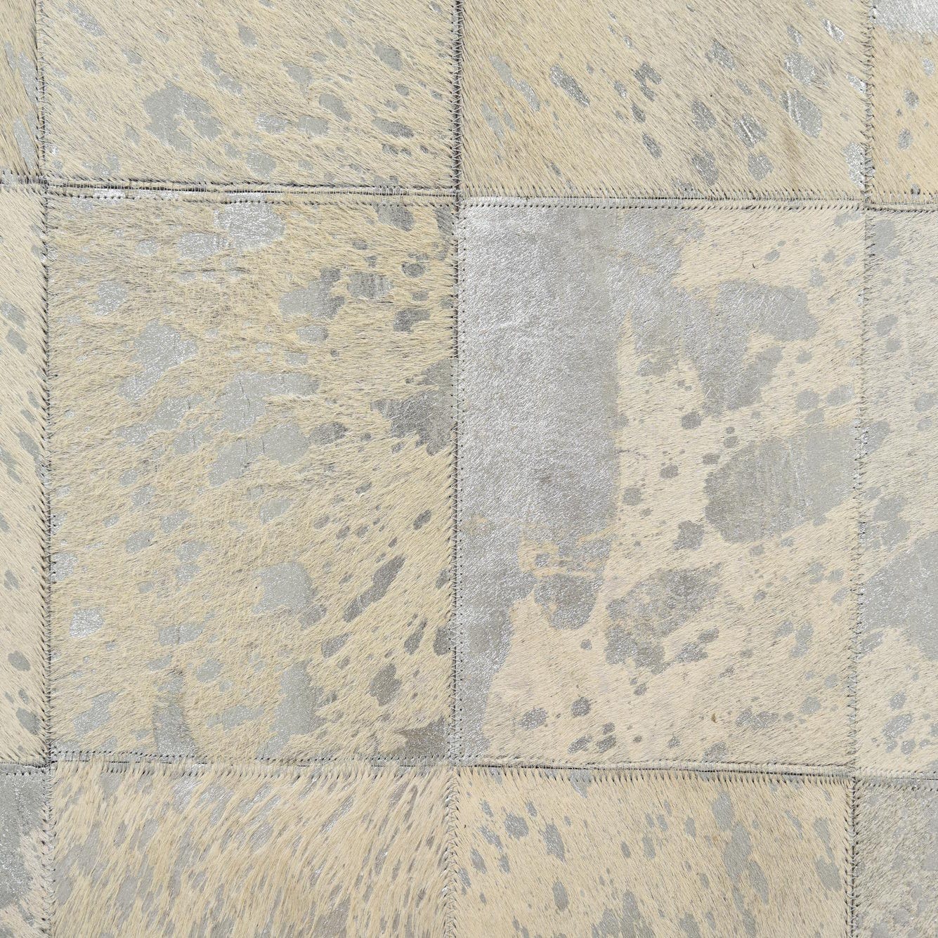 The Cowhide collection presents a handcrafted 5x8 area rug made from a blend of cowhide and leather, offering a sophisticated and textured addition to any interior. This piece features a mosaic of neutral tones with a predominant gray background, complemented by hues of beige, cream, ivory, and subtle silver accents. Each patchwork square showcases a unique pattern and a variety of textures that come together to create a cohesive, understated elegance.