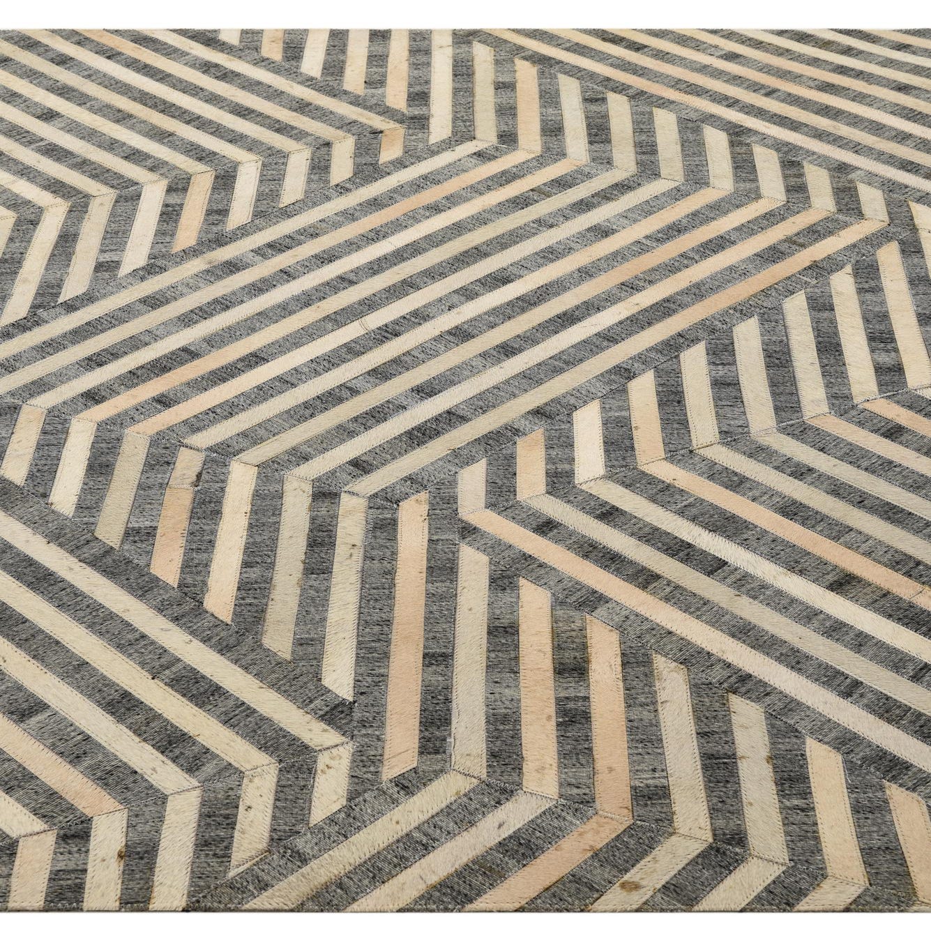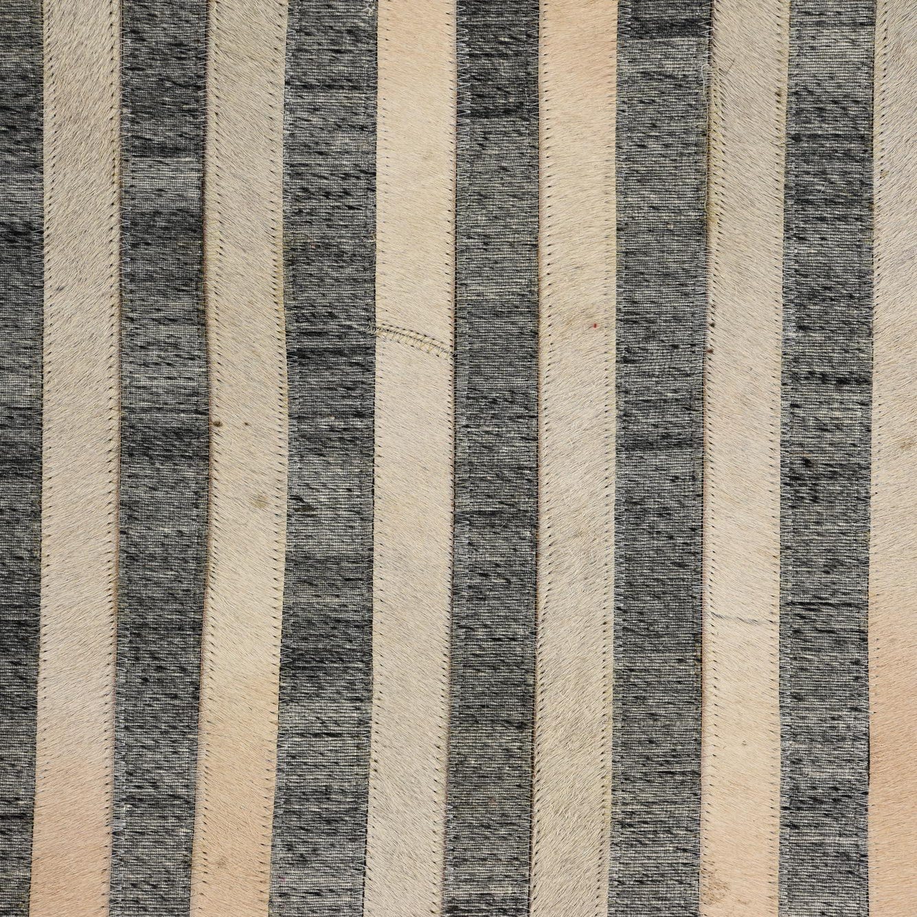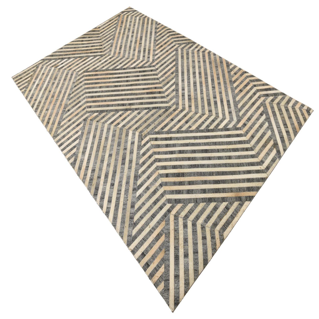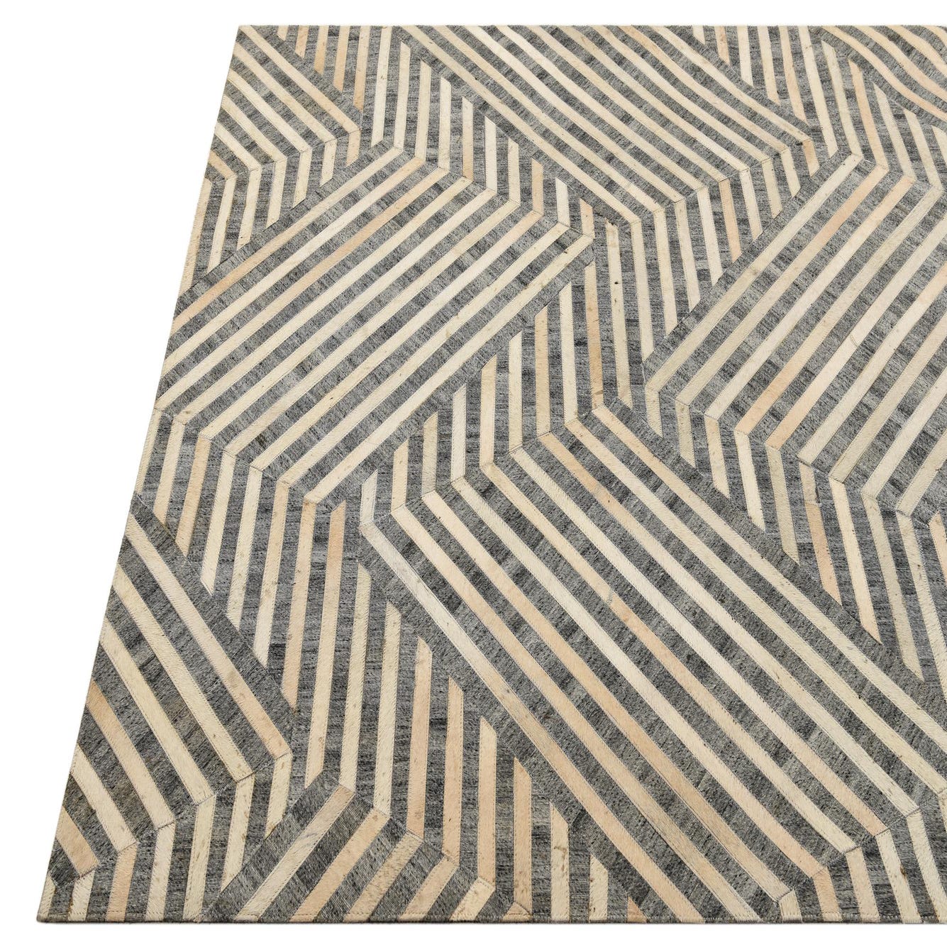 A 5x8 rectangular Cowhide rug featuring a modern geometric pattern of alternating gray and light beige stripes, perfect for a living room.