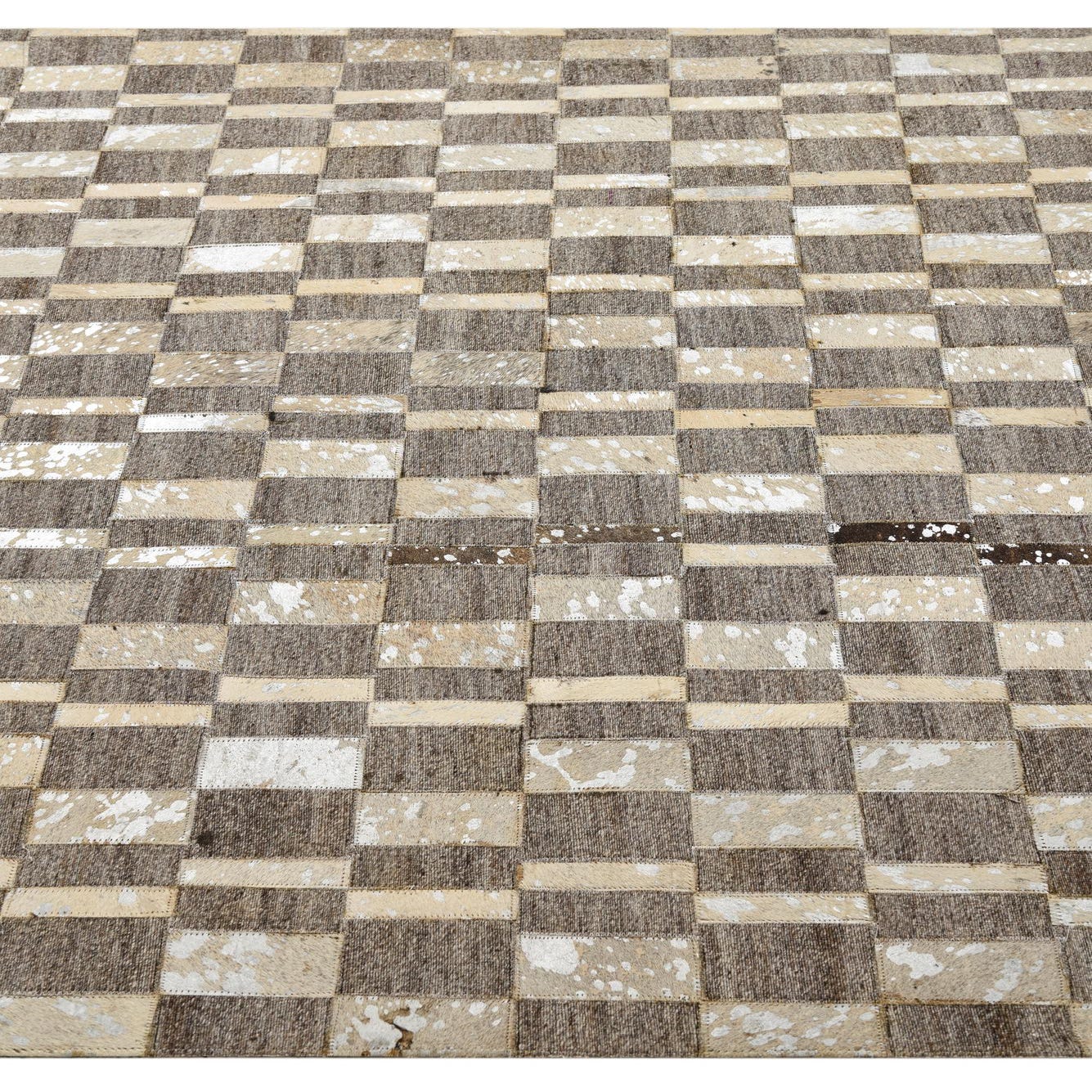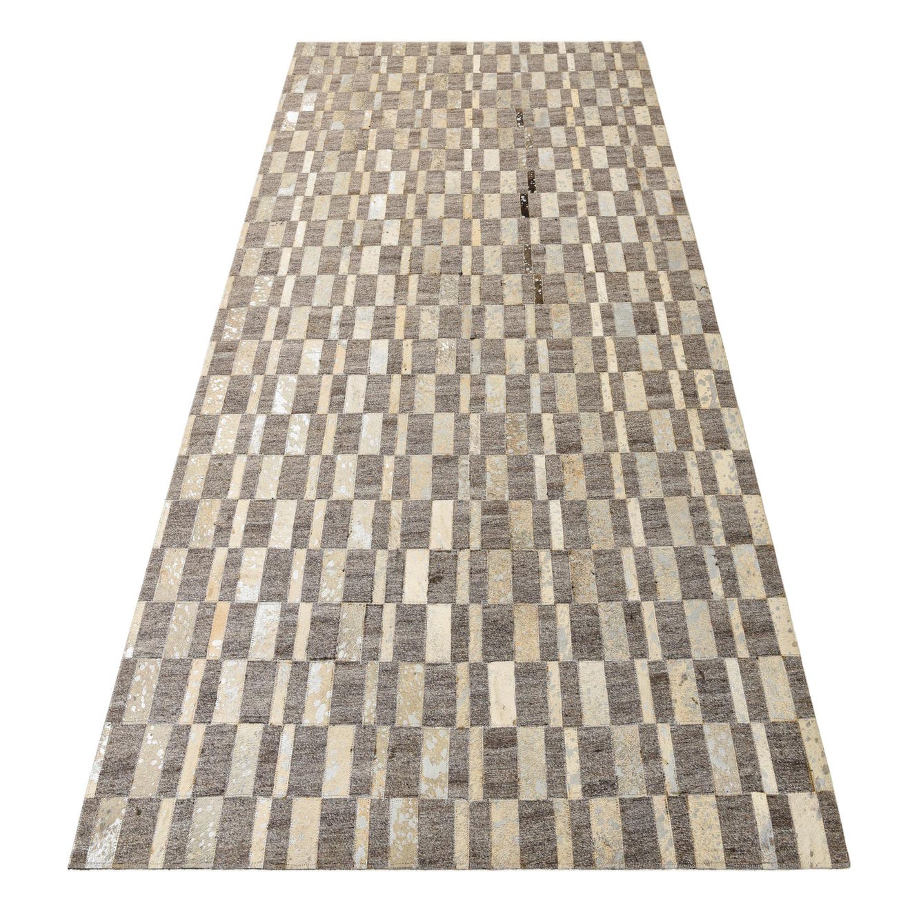 A 5x8 rectangular Cowhide rug featuring a modern checkerboard pattern in varying shades of gray and silver.