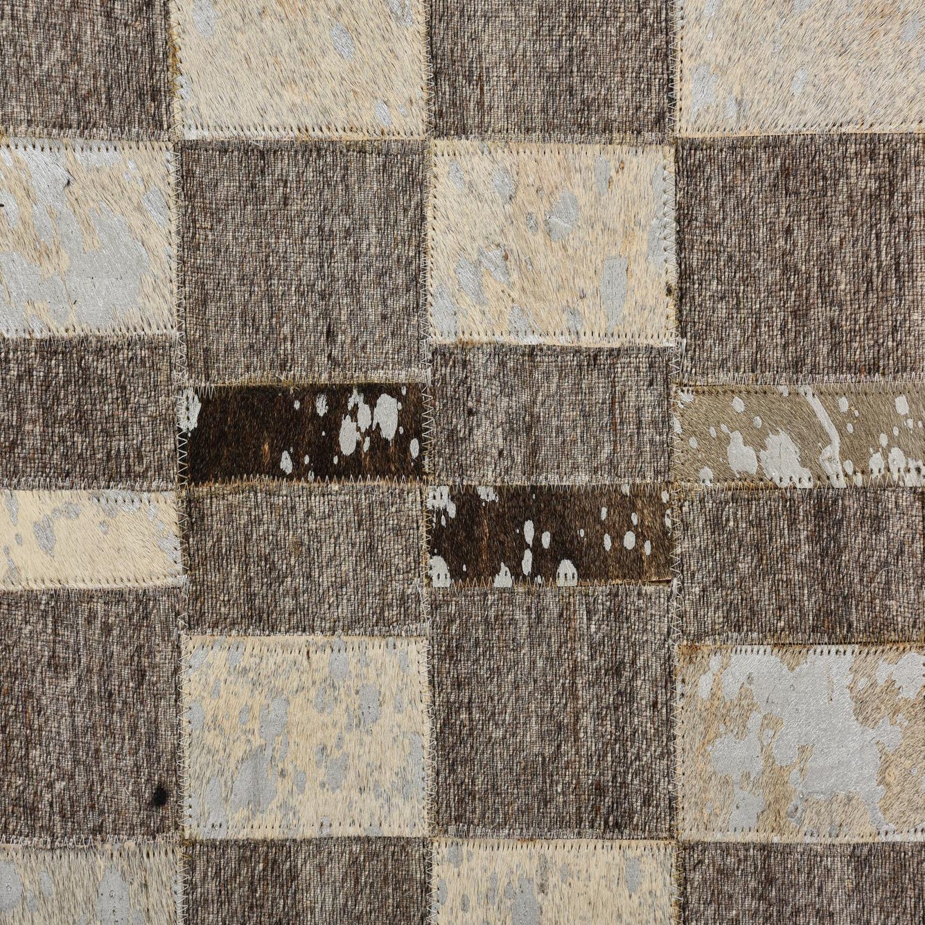 The rug's surface exhibits a mosaic of cowhide and leather squares carefully stitched together, lending it a tactile quality that is both visually appealing and comfortable underfoot. The varying tones and natural patterns within the cowhide pieces ensure that each rug is unique.