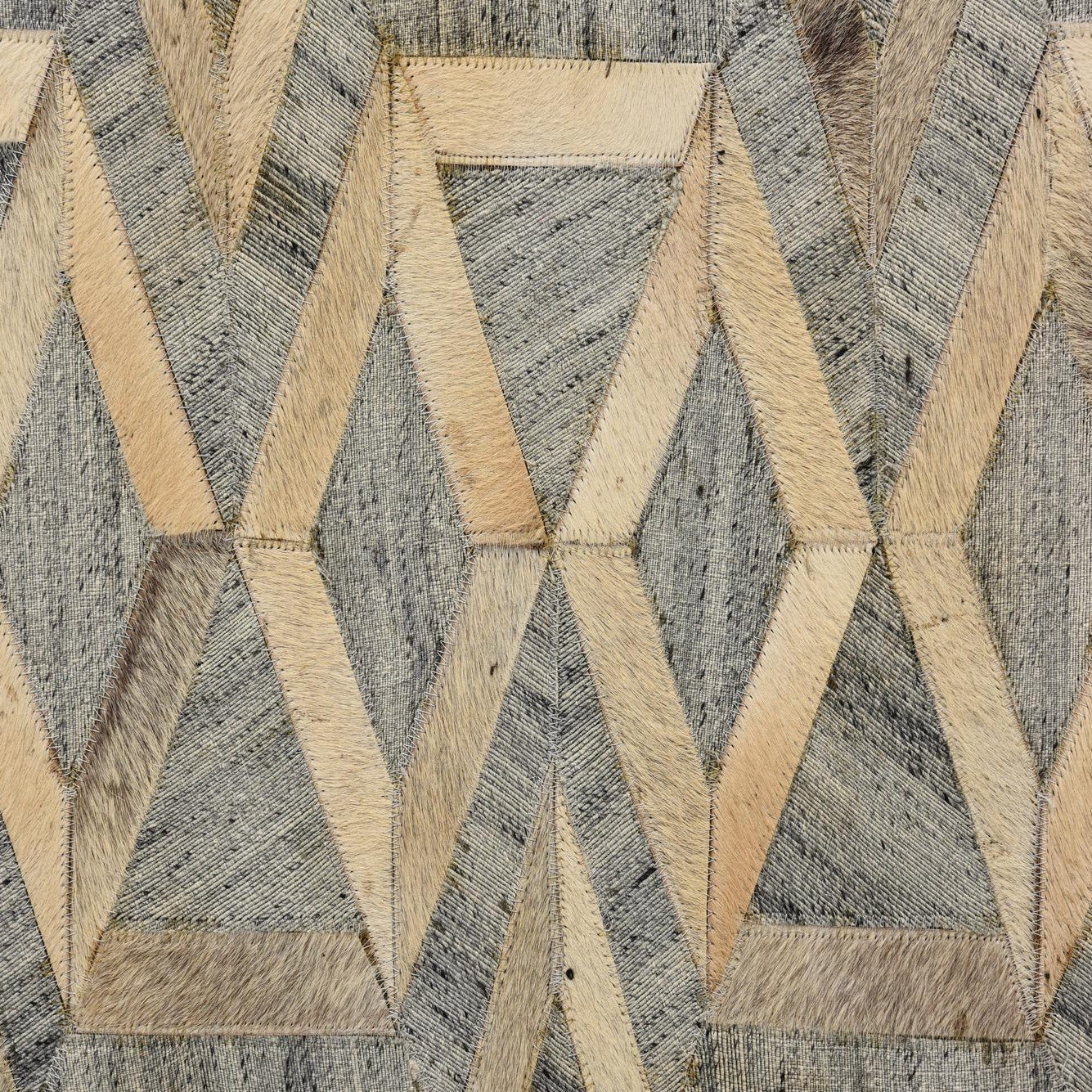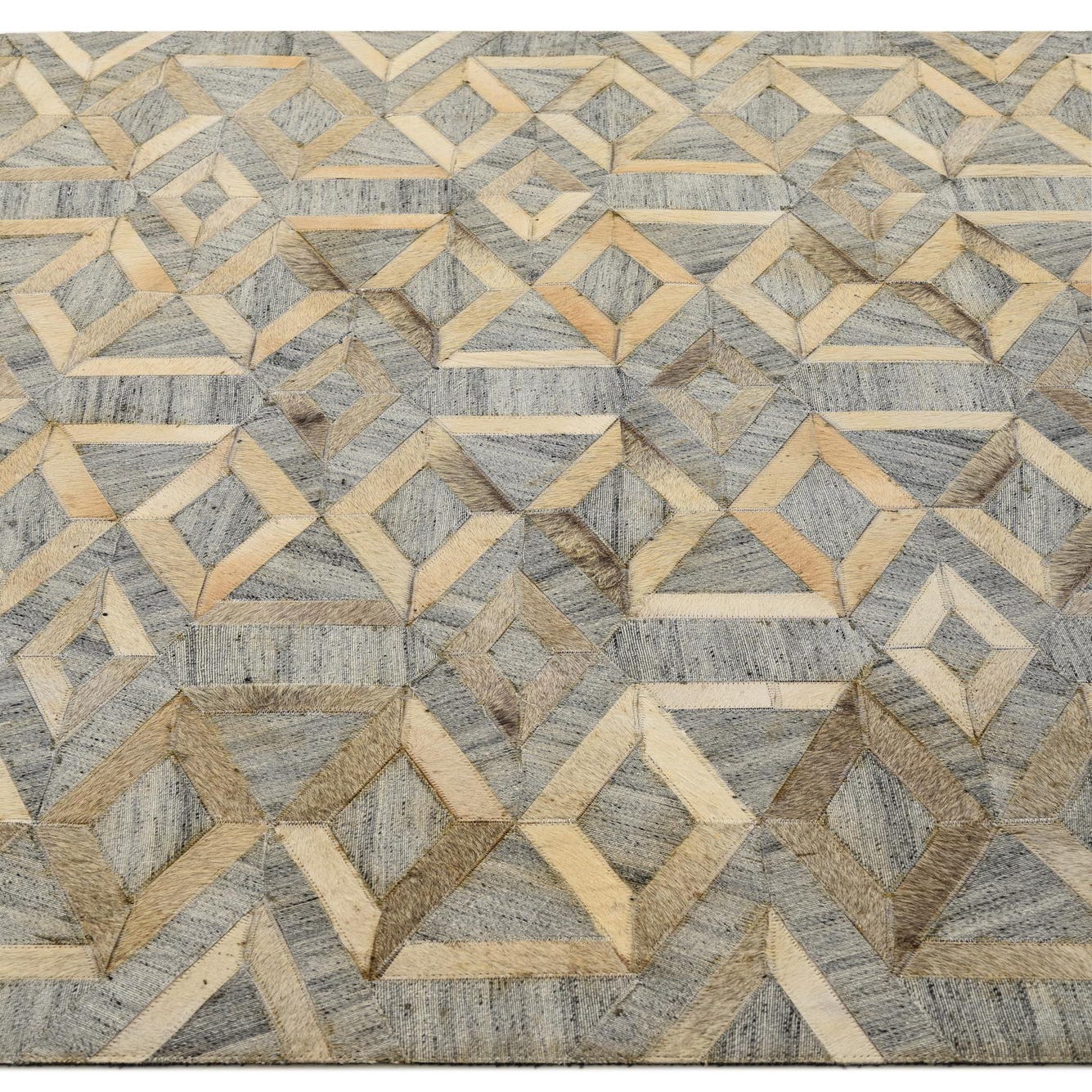 This Cowhide Collection rug is a handcrafted 5x8 piece, meticulously made using genuine cowhide and leather. The rug displays a contemporary geometric pattern, featuring a variety of diamond shapes that create an intriguing 3D effect. The colors present in the design include a neutral palette of gray, beige, brown, and ivory, with gray serving as the dominant background color. The natural texture of the cowhide and leather gives the rug a unique tactile experience, adding warmth and luxury to its appearance.