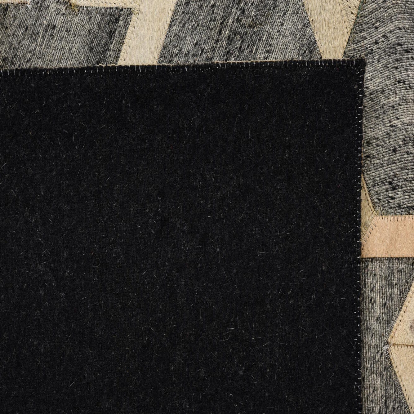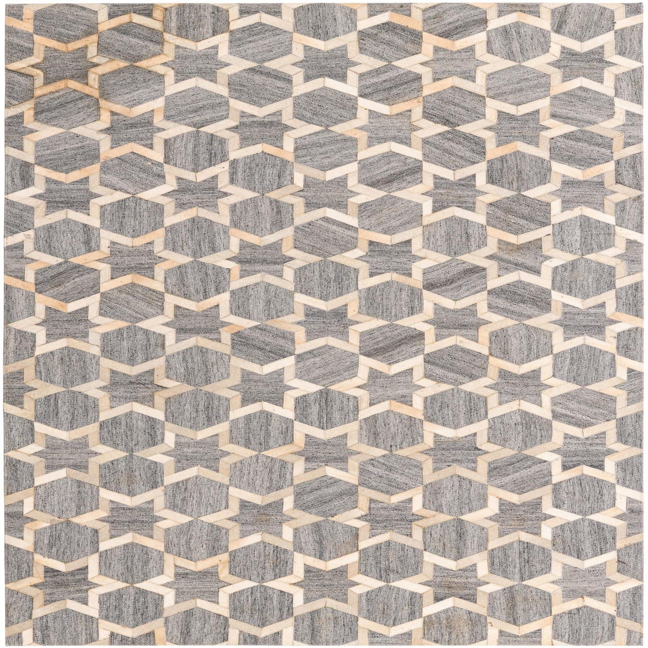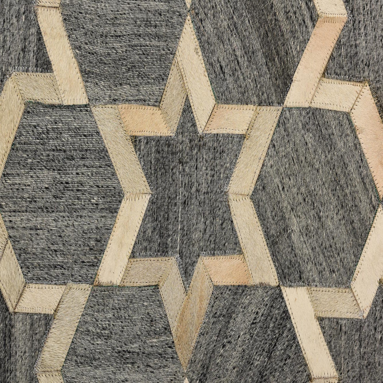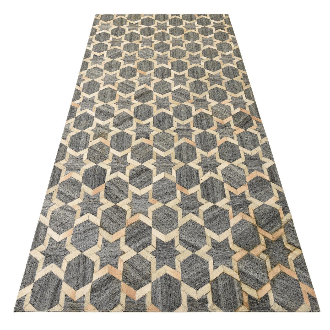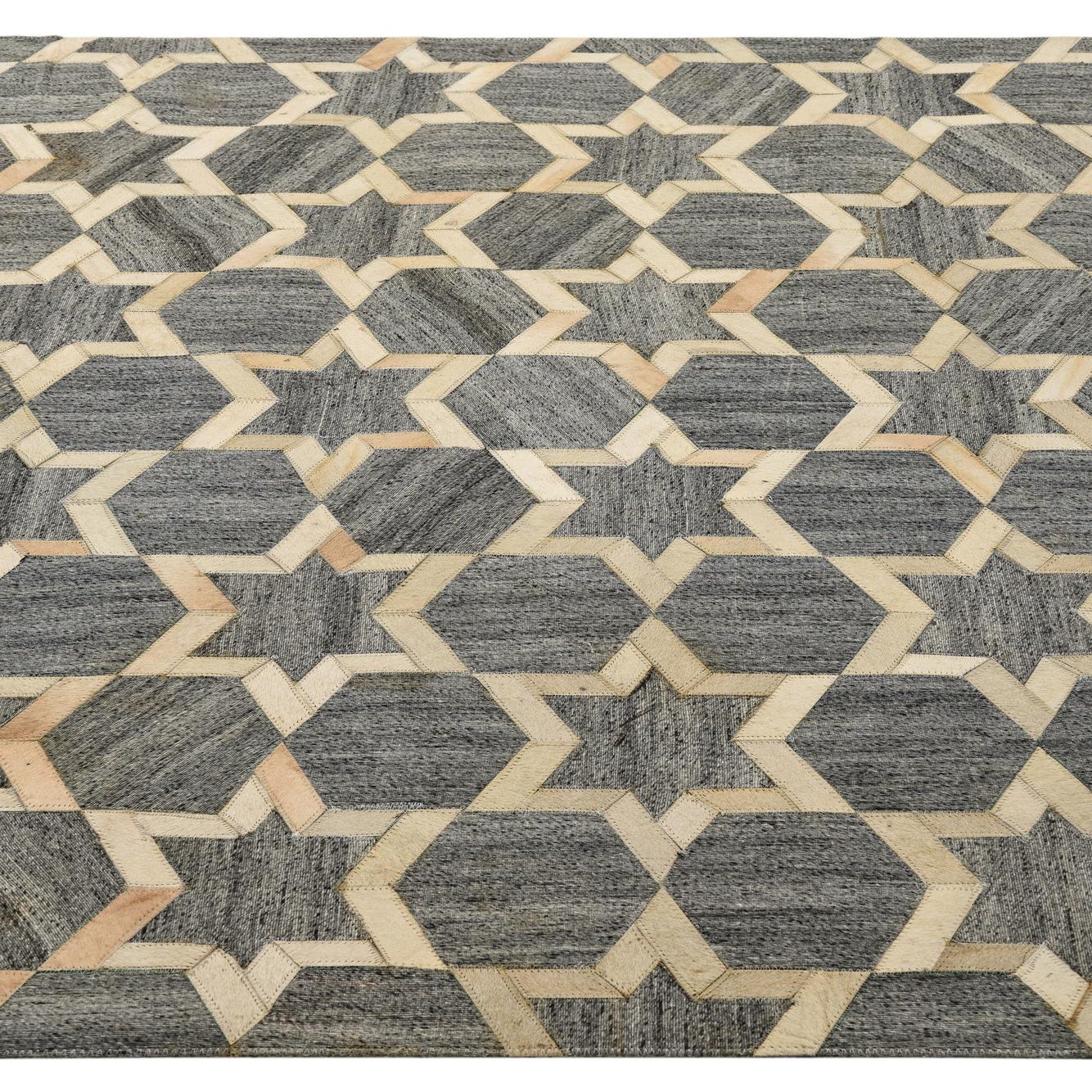 A 5x8 rectangular gray and silver modern cowhide rug with a geometric star and hexagon pattern.