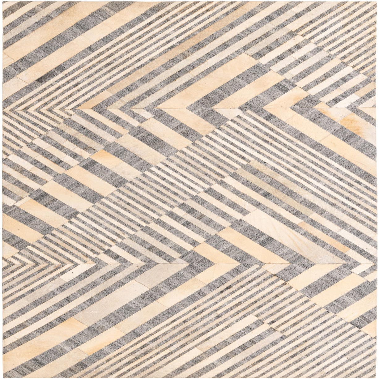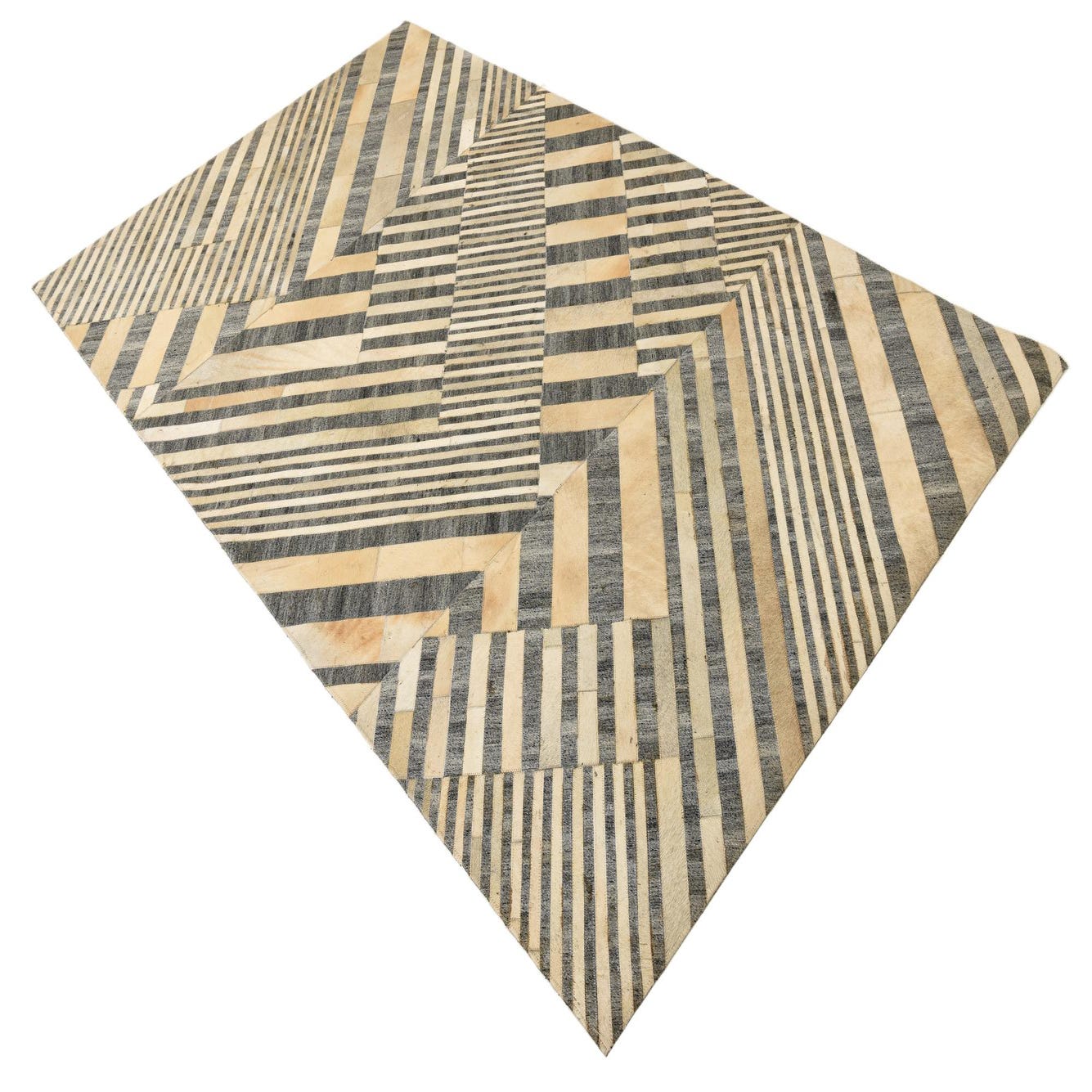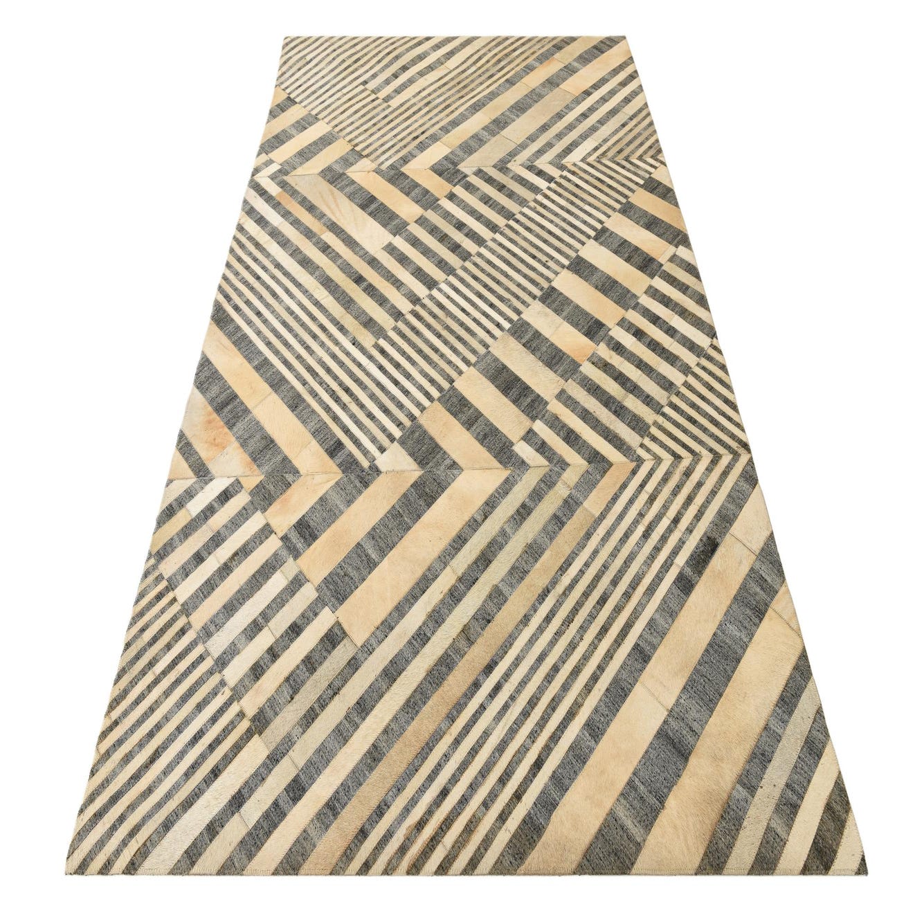 A 5x8 rectangular gray and cream modern cowhide rug with a striking geometric striped pattern, ideal for a living room.