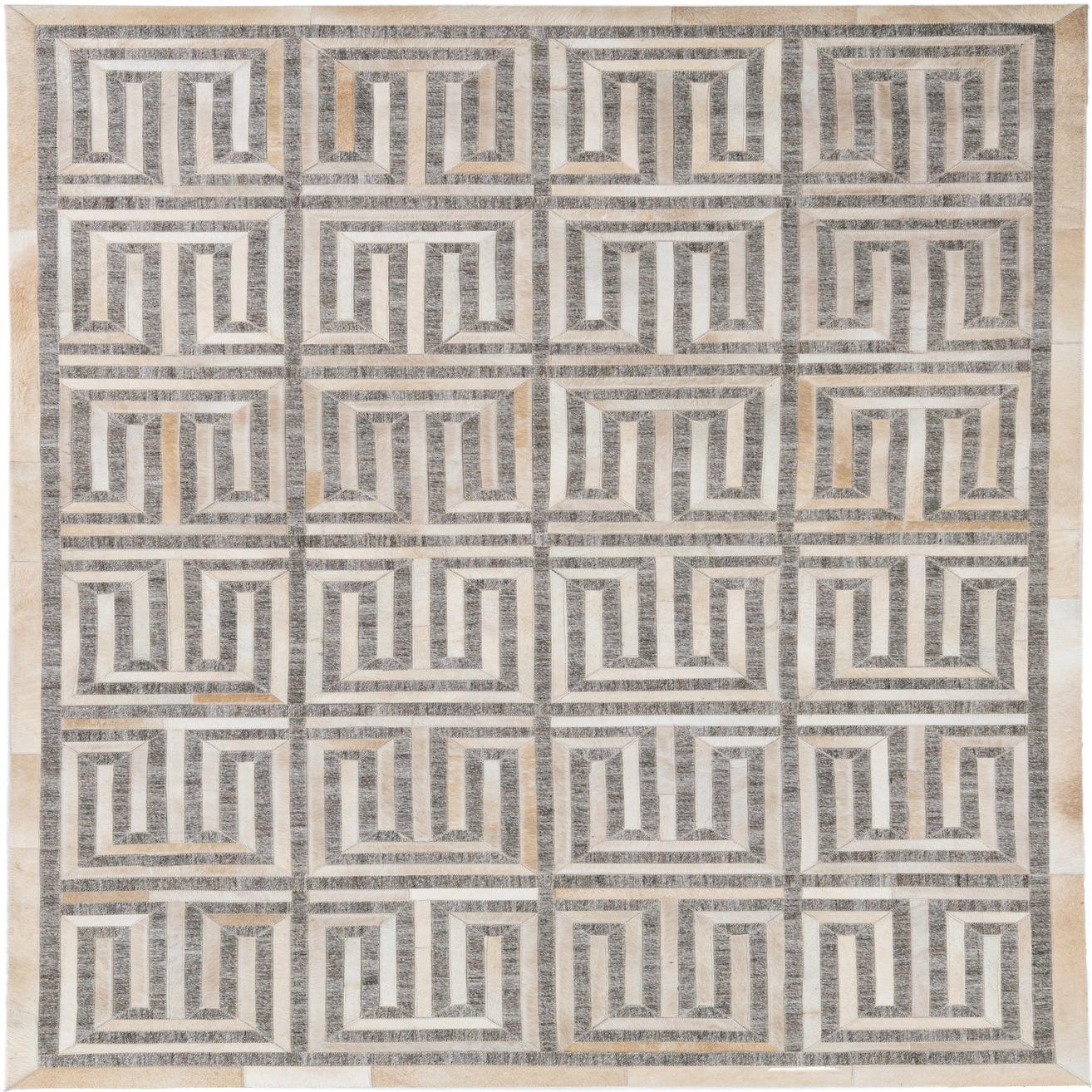 A bold geometric grid of interlocking square-spiral motifs sits on a soft gray background, rendered in ivory and accented with warm beige, tan and brown tones. The repeating pattern creates a strong, orderly rhythm across the surface, while subtle shifts in the tan and brown patches add visual warmth. Hand-made of cowhide and leather, the rug has a low hair-on texture with a gentle leather sheen and visible panel seams that give the surface depth and a tactile, crafted feel.