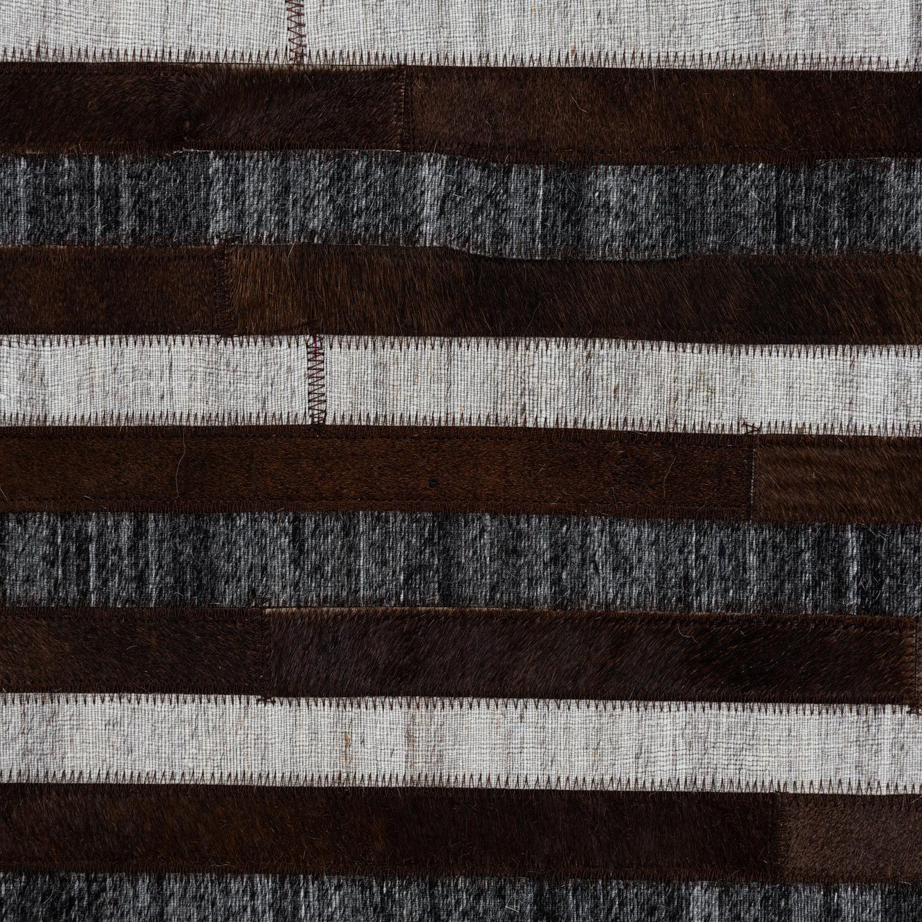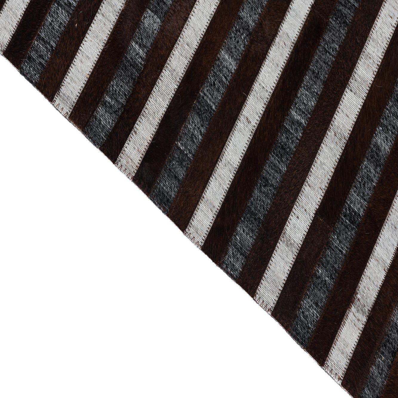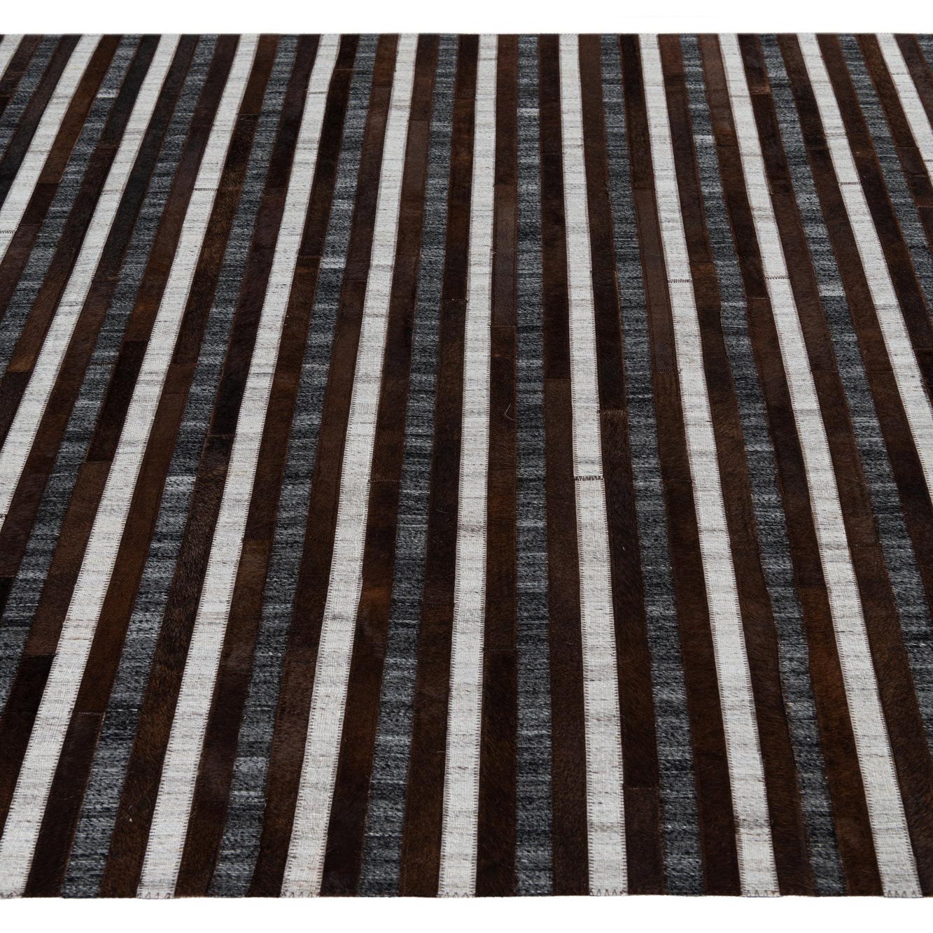This Cowhide Leather collection rug offers a distinctive pattern with a balanced palette of Gray as the background color, complemented by stripes in Brown, Ivory, and Black. Handmade from cowhide and leather, this 5x8 piece presents a sleek and texturally rich surface, lending itself to a variety of tactile sensations underfoot.