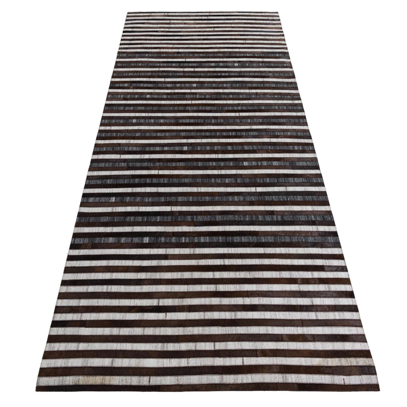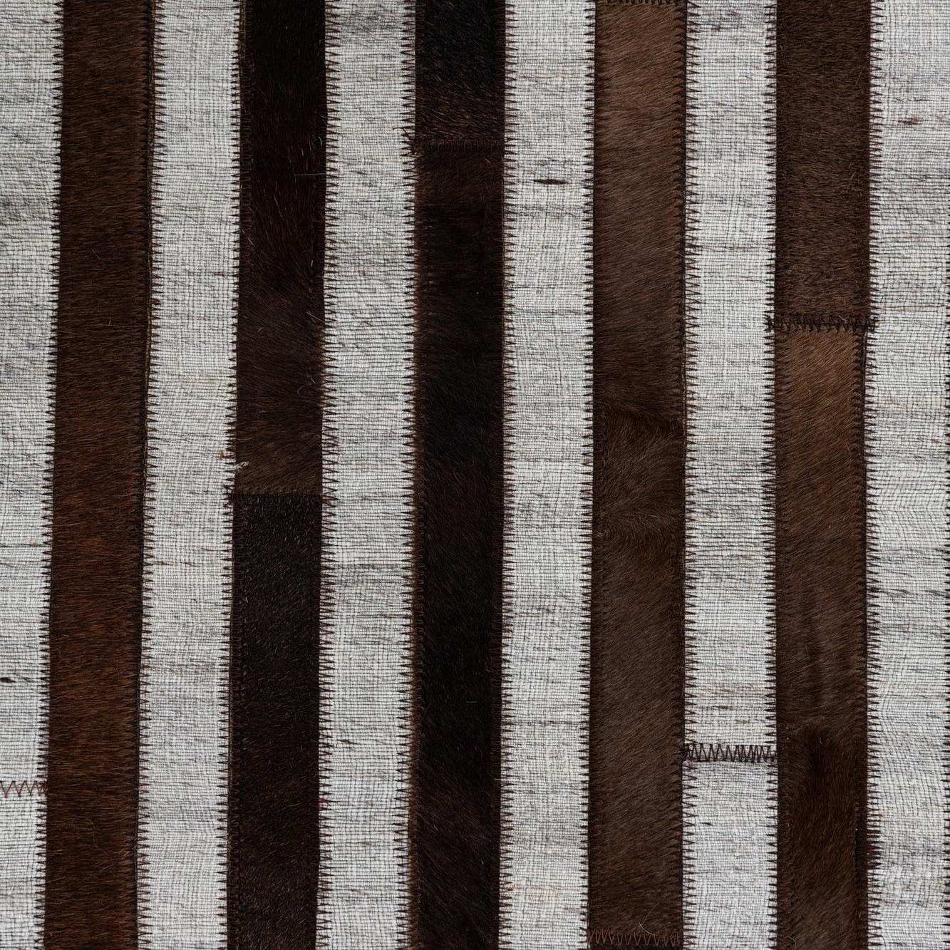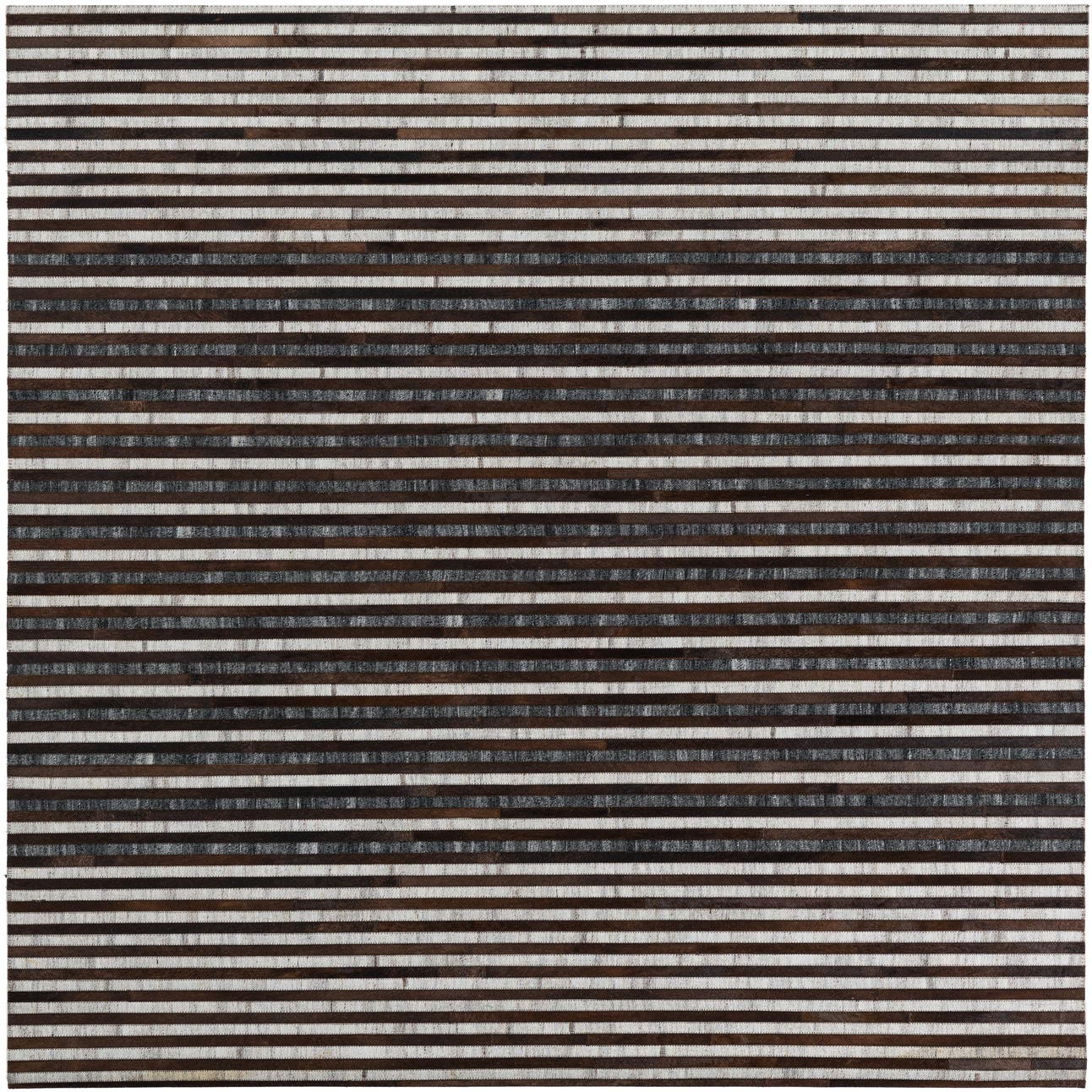 This Cowhide Leather collection rug offers a distinctive pattern with a balanced palette of Gray as the background color, complemented by stripes in Brown, Ivory, and Black. Handmade from cowhide and leather, this 5x8 piece presents a sleek and texturally rich surface, lending itself to a variety of tactile sensations underfoot.