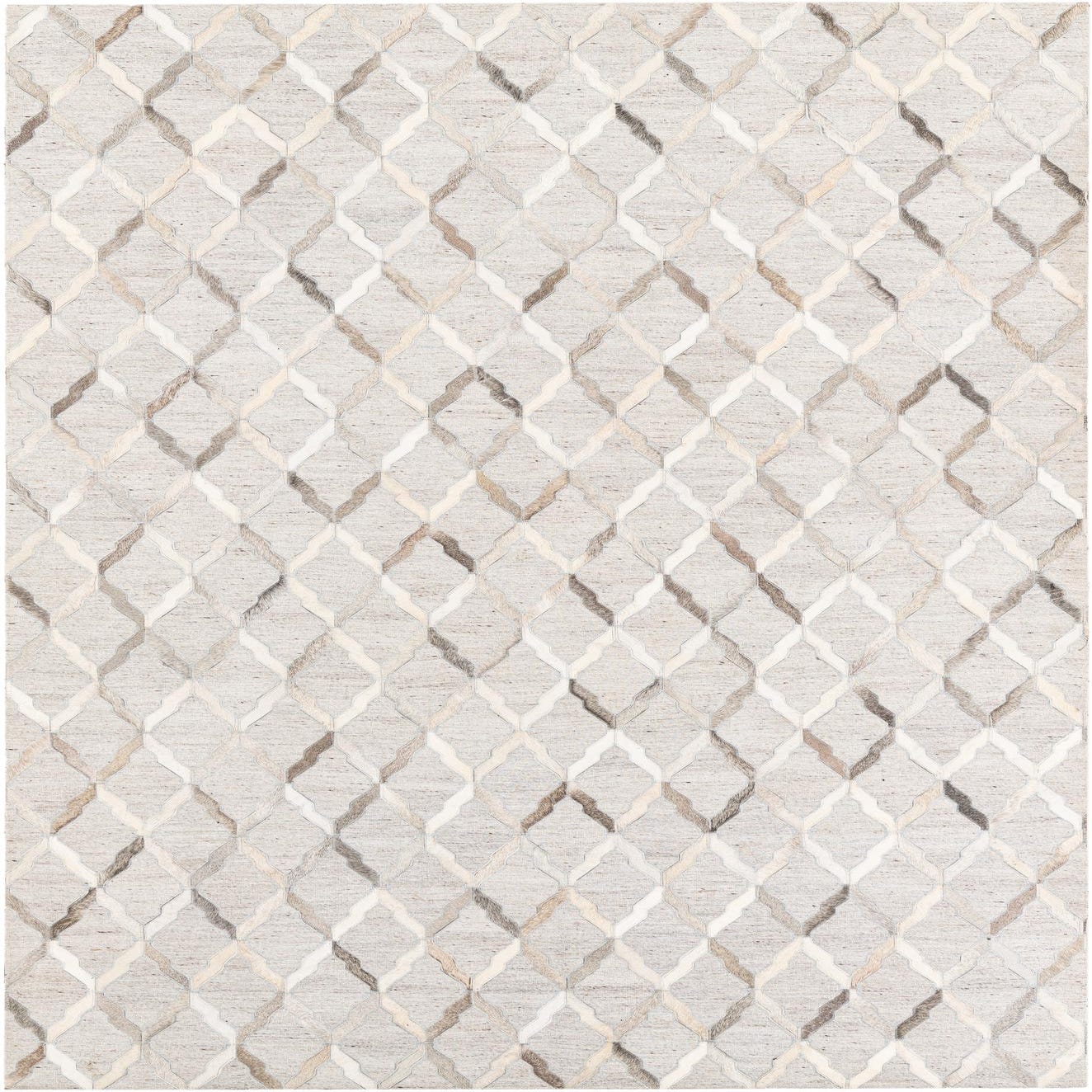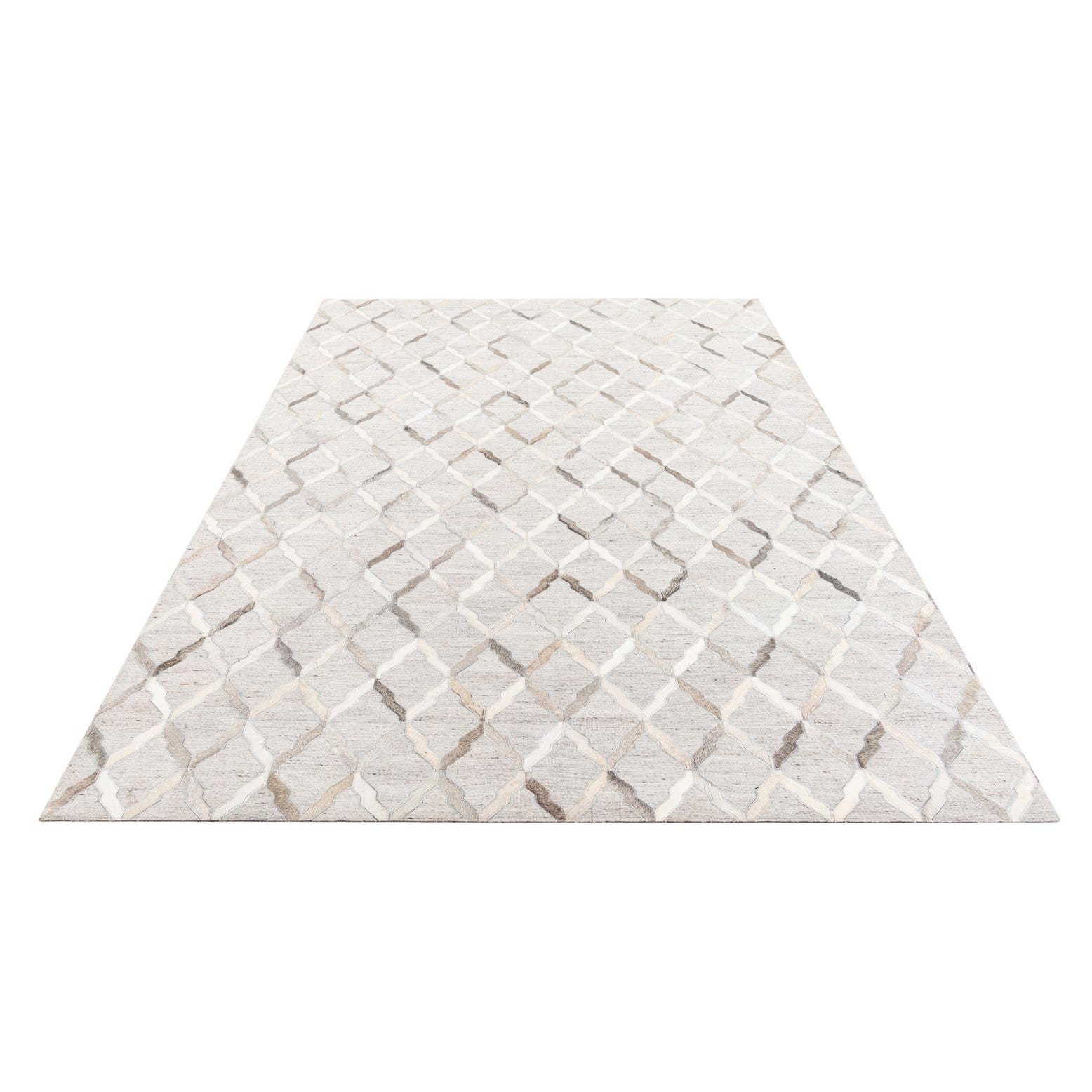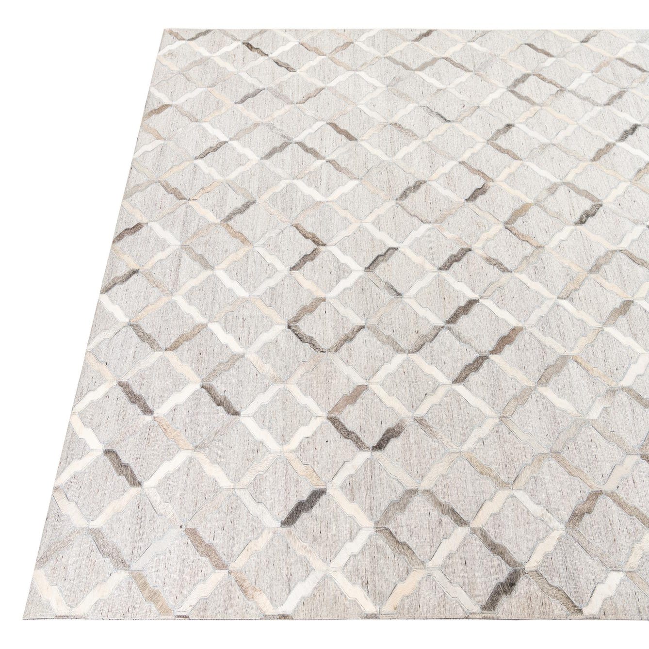 A 5x8 rectangular Cowhide Leather rug featuring a modern abstract trellis pattern in various shades of gray and silver.