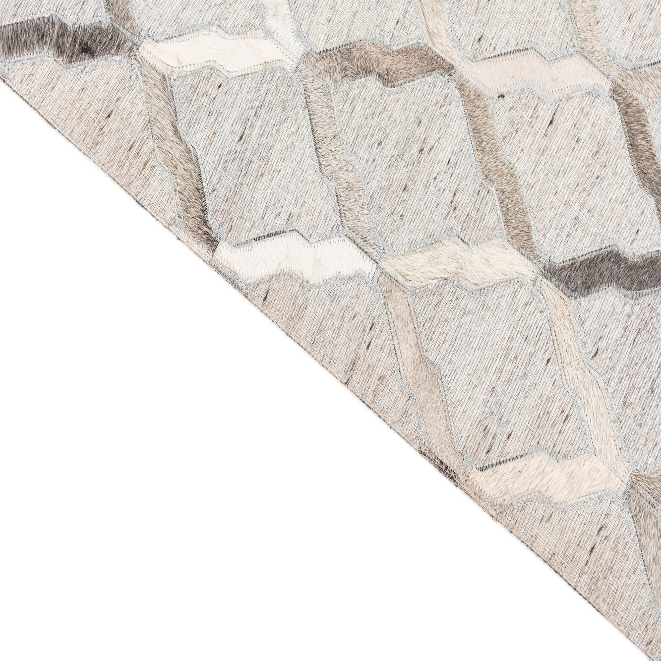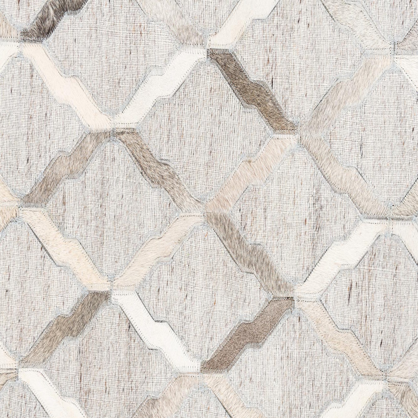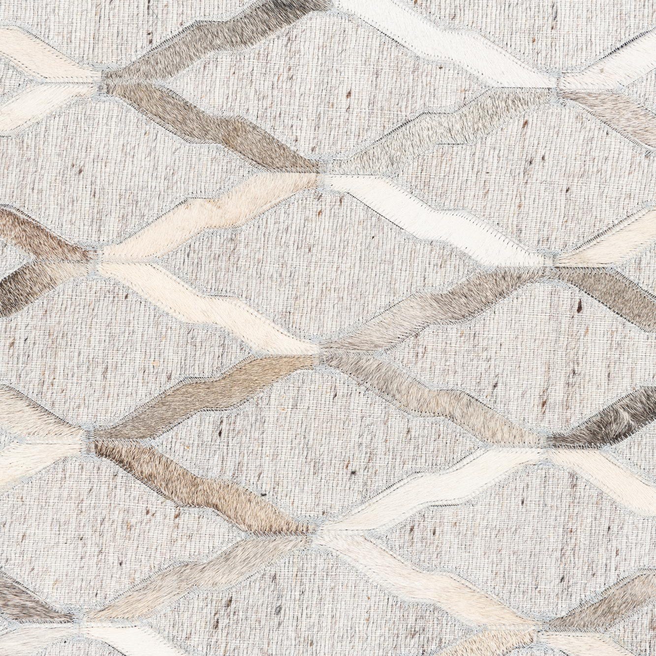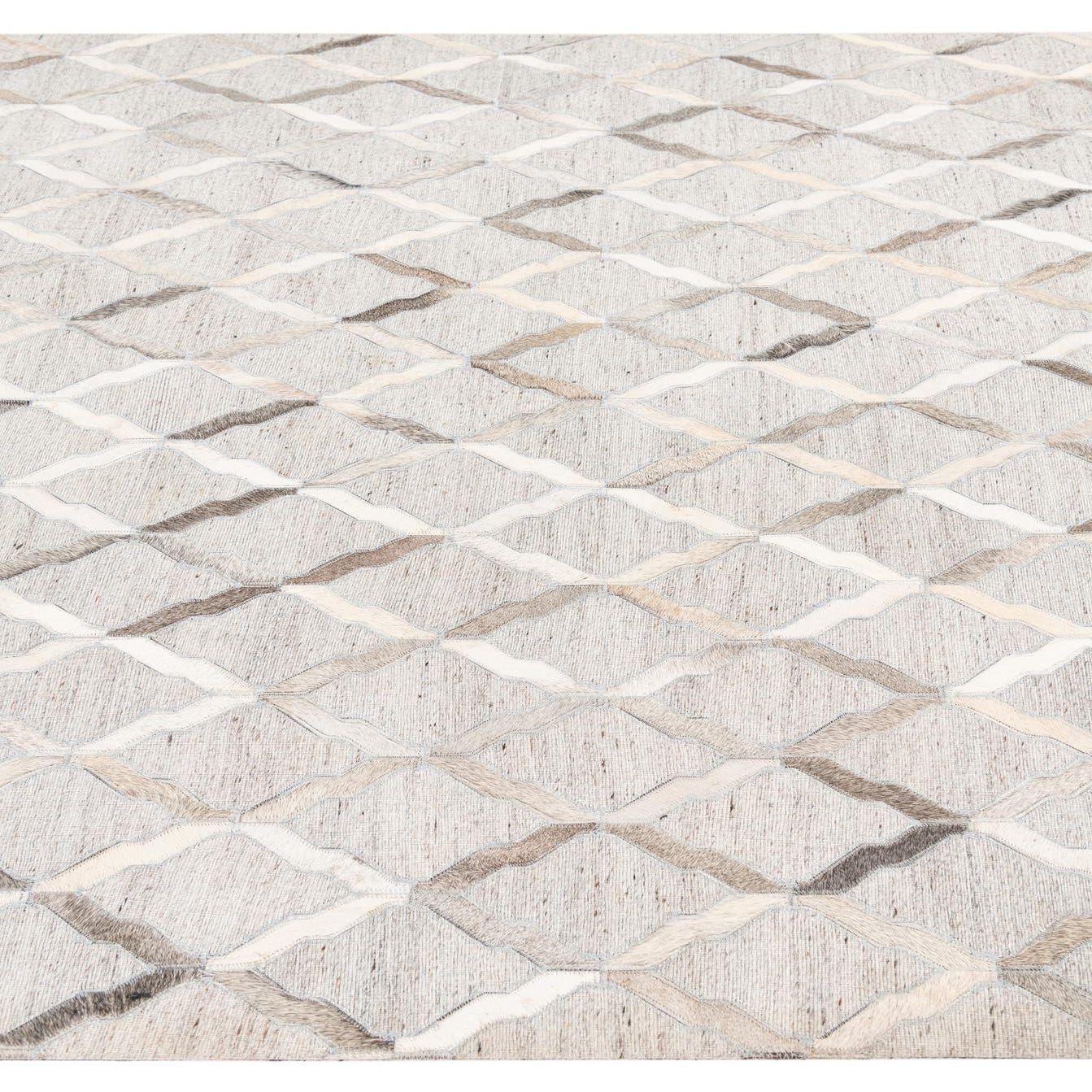 A 5x8 rectangular Cowhide Leather rug featuring a modern abstract trellis pattern in various shades of gray and silver.