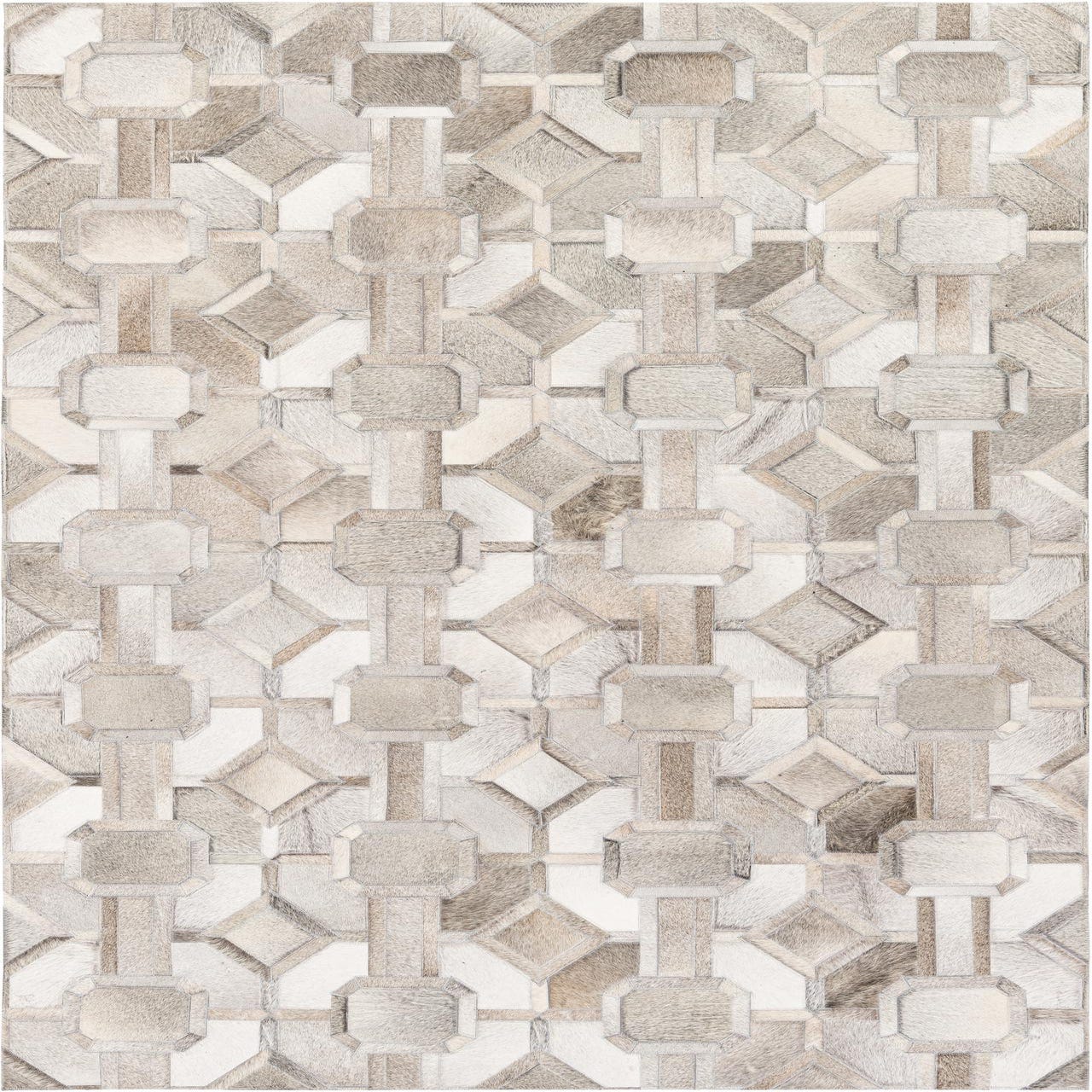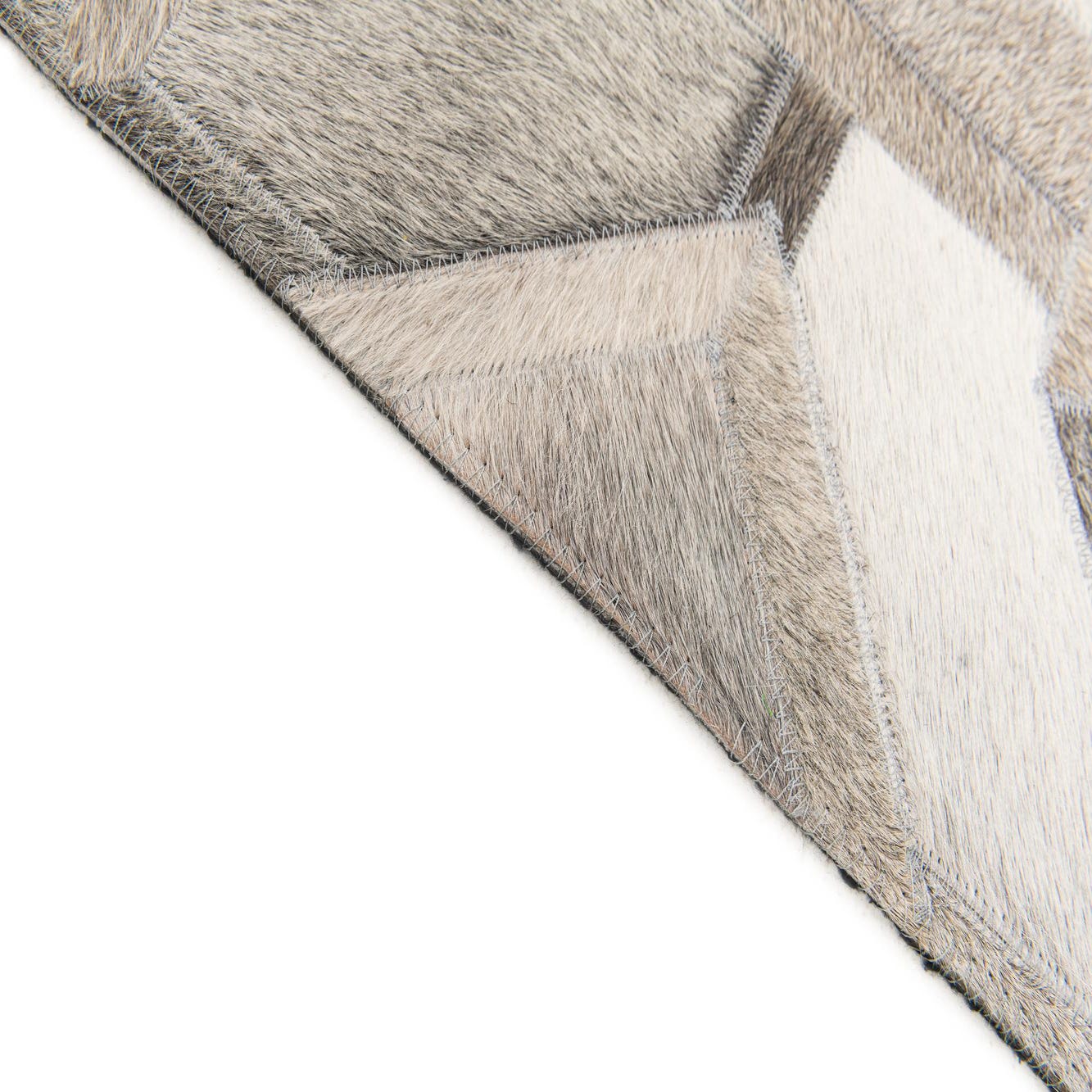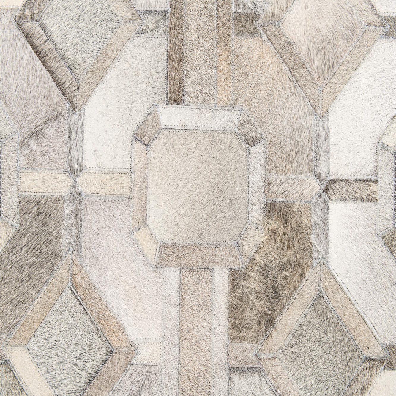 A 5x8 rectangular Cowhide Stocks rug in varying shades of gray and silver, featuring a modern geometric patchwork design.