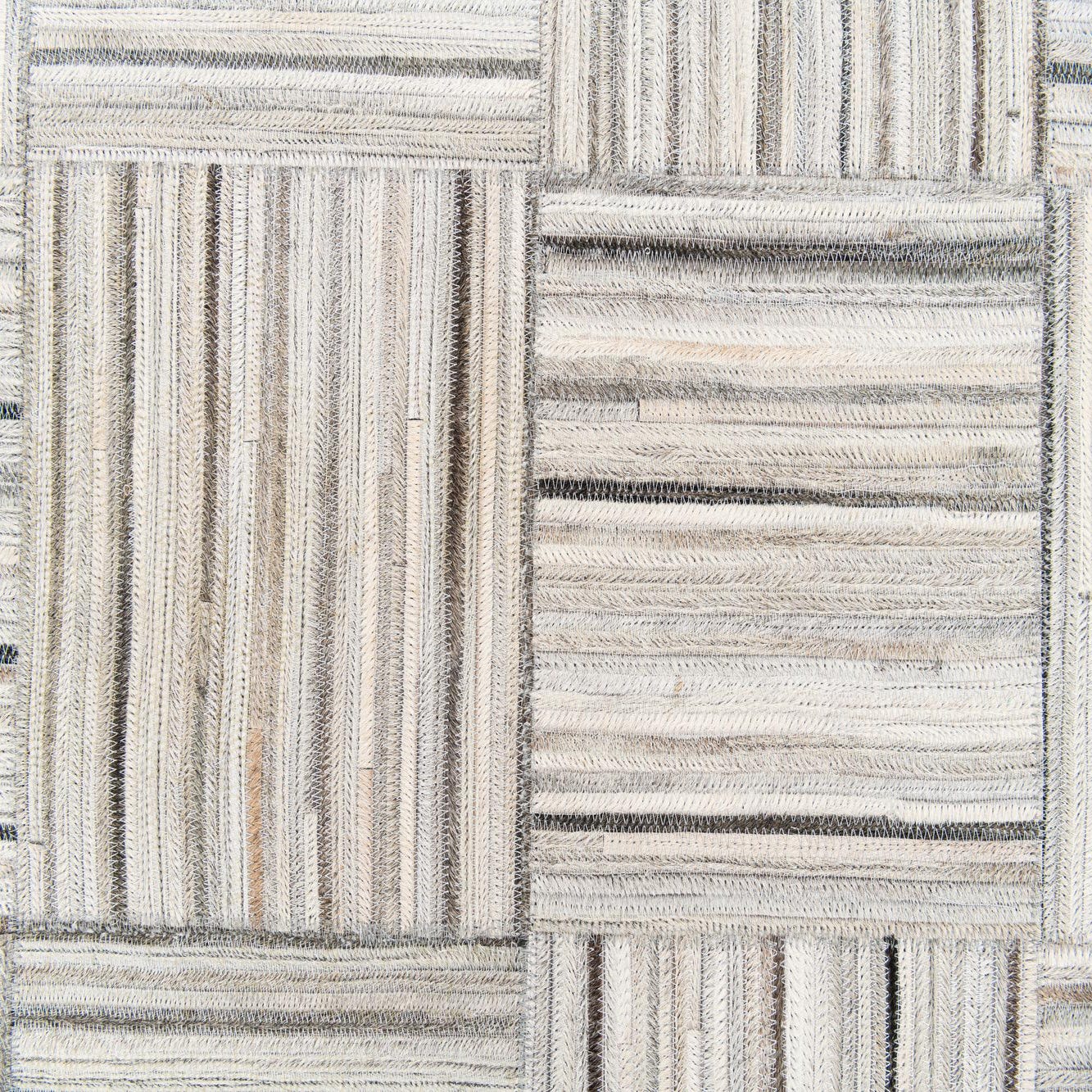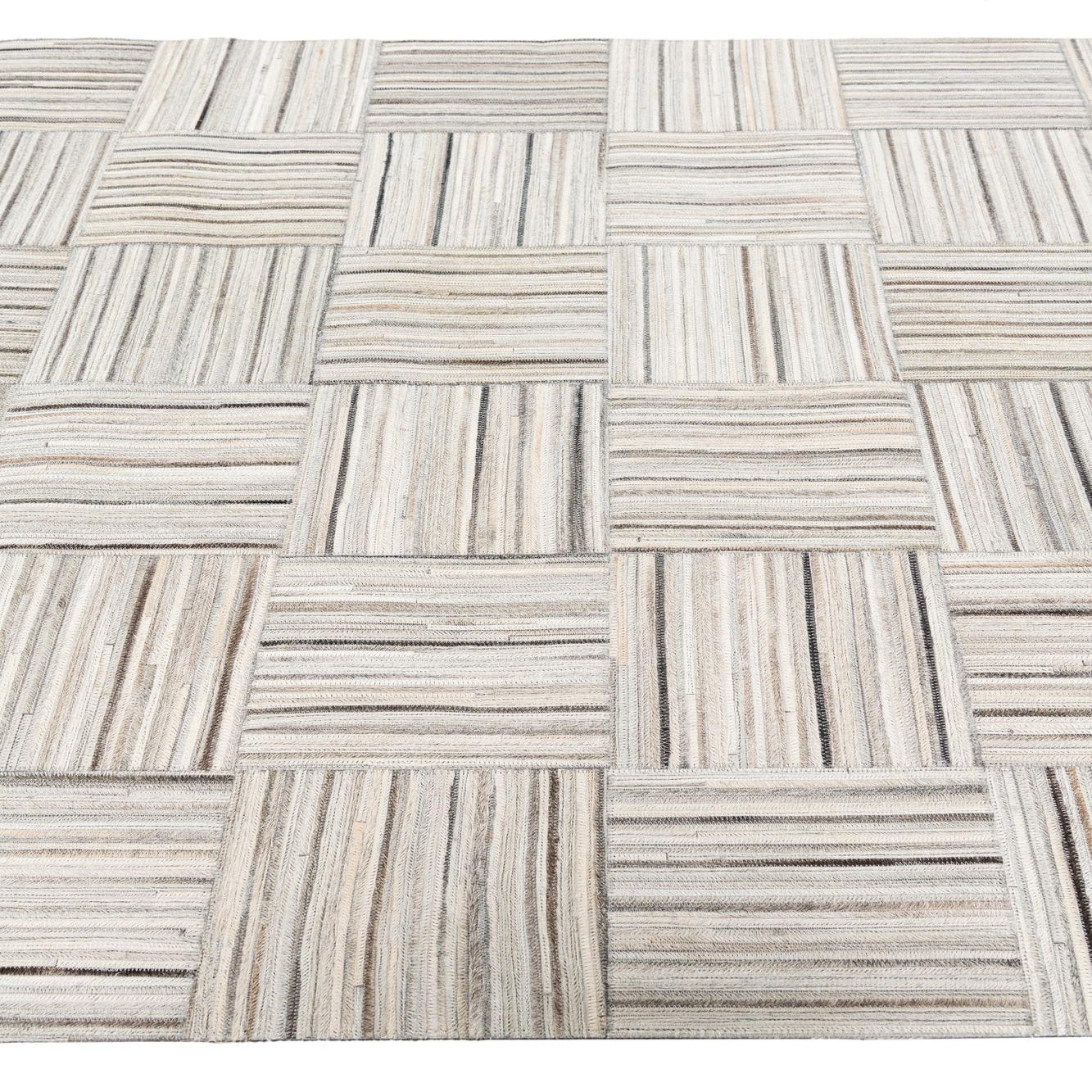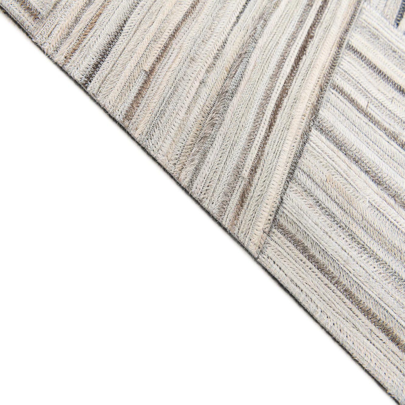 A 5x8 rectangular gray and silver modern cowhide rug with a woven stripe pattern, ideal for a living room.