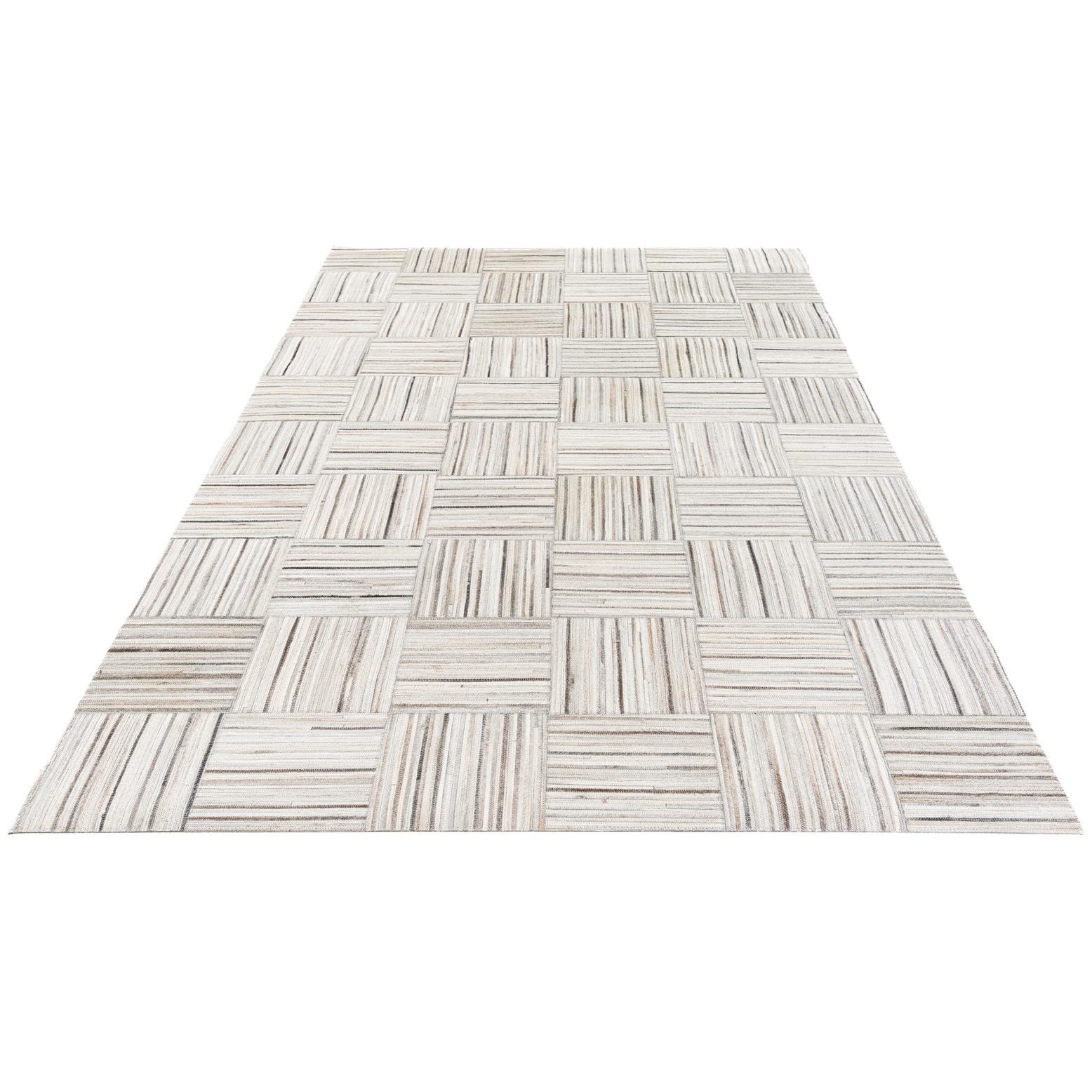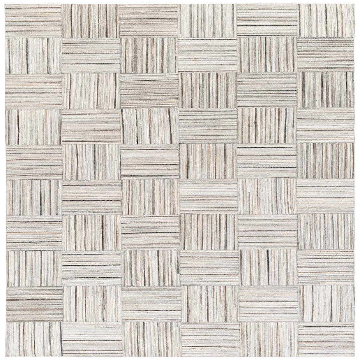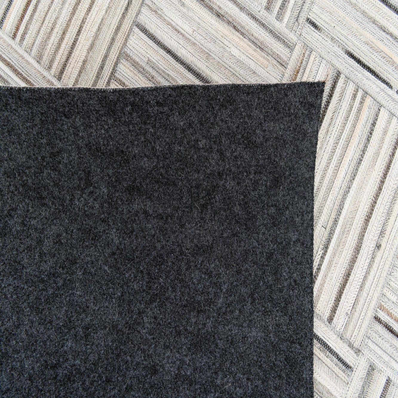 A 5x8 rectangular gray and silver modern cowhide rug with a woven stripe pattern, ideal for a living room.